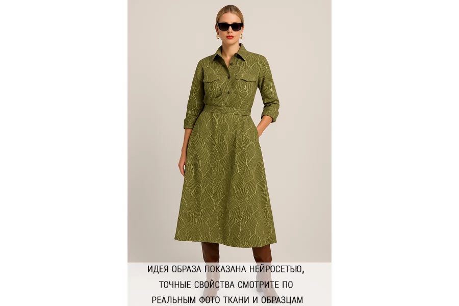 Итальянский хлопок рубашечно-плательной плотности с принтом в виде абстрактных листьев, использован молочный и оливково-зеленый цвет. Материал гладкий, мягкий, тонкий. Немного мнется. Совсем немного просвечивает силуэт в один слой, не тянется. Пластичный и немного держит форму. Прекрасный вариант на рубашки, юбки, платья. Материал дает усадку.