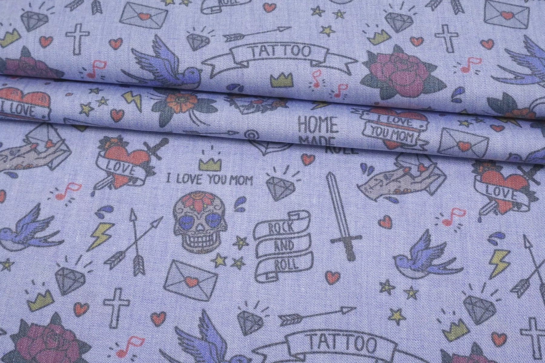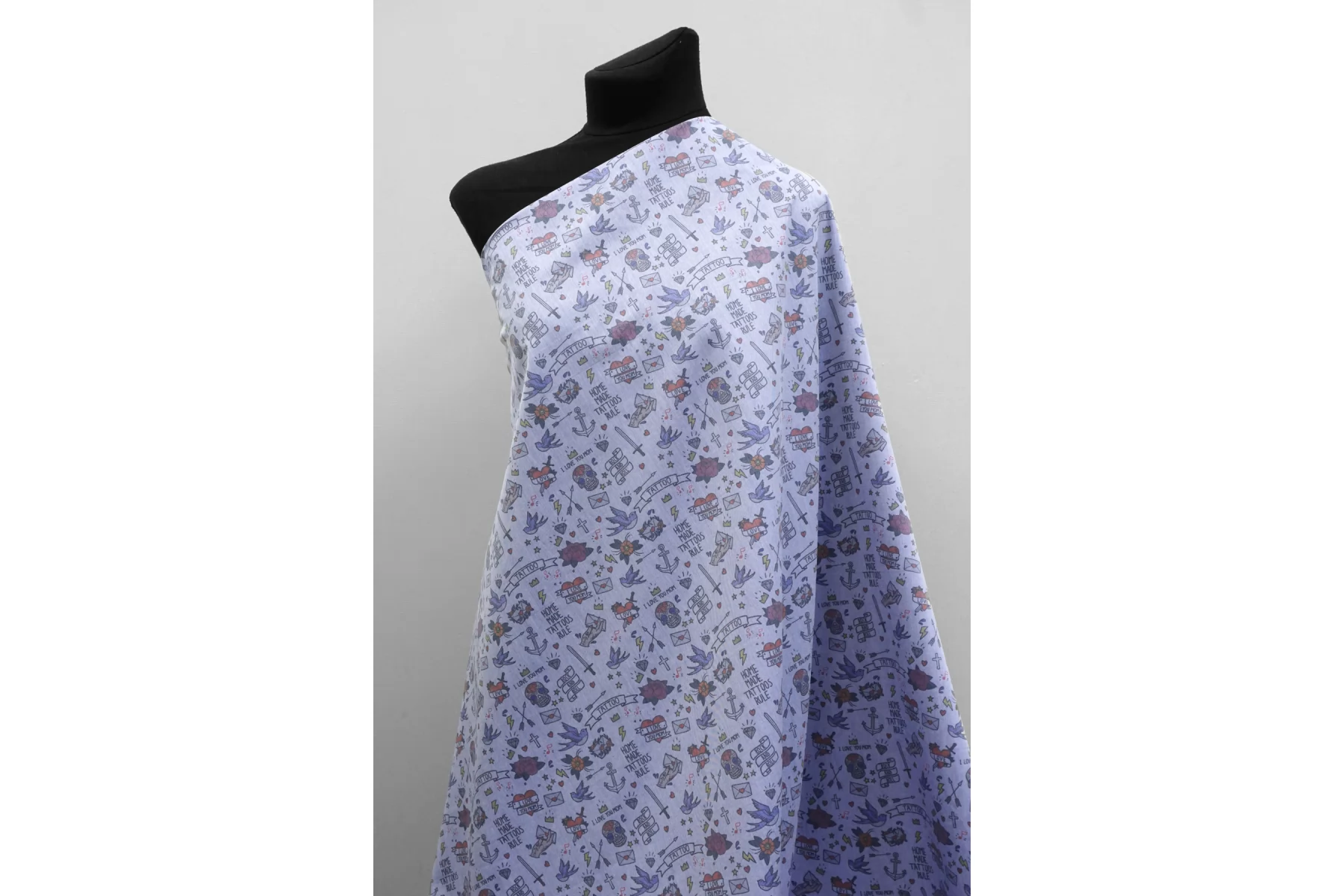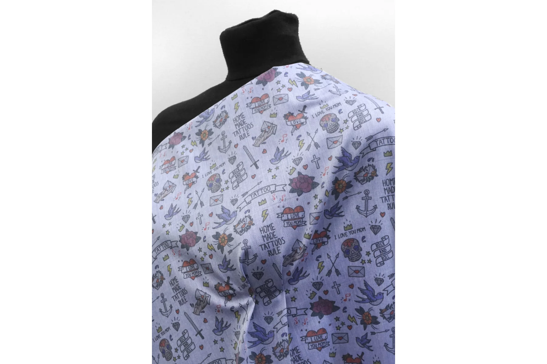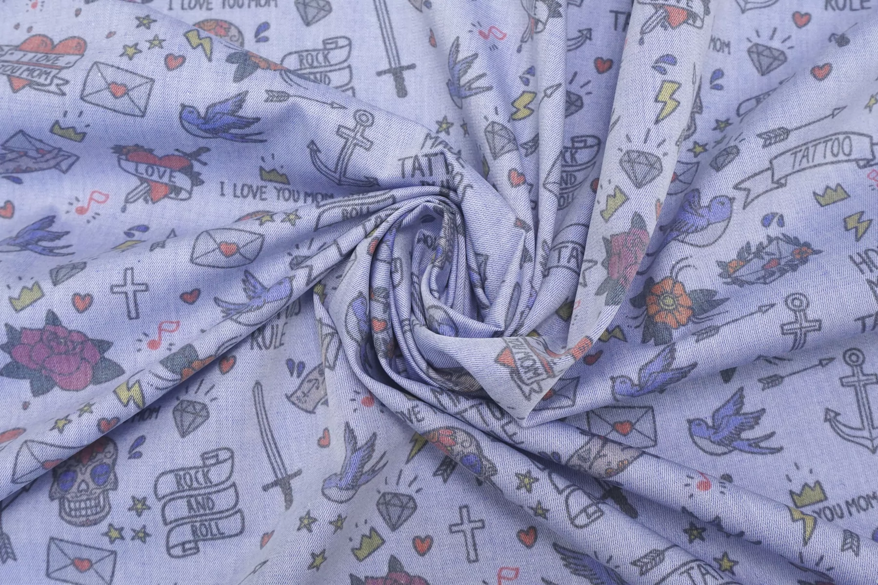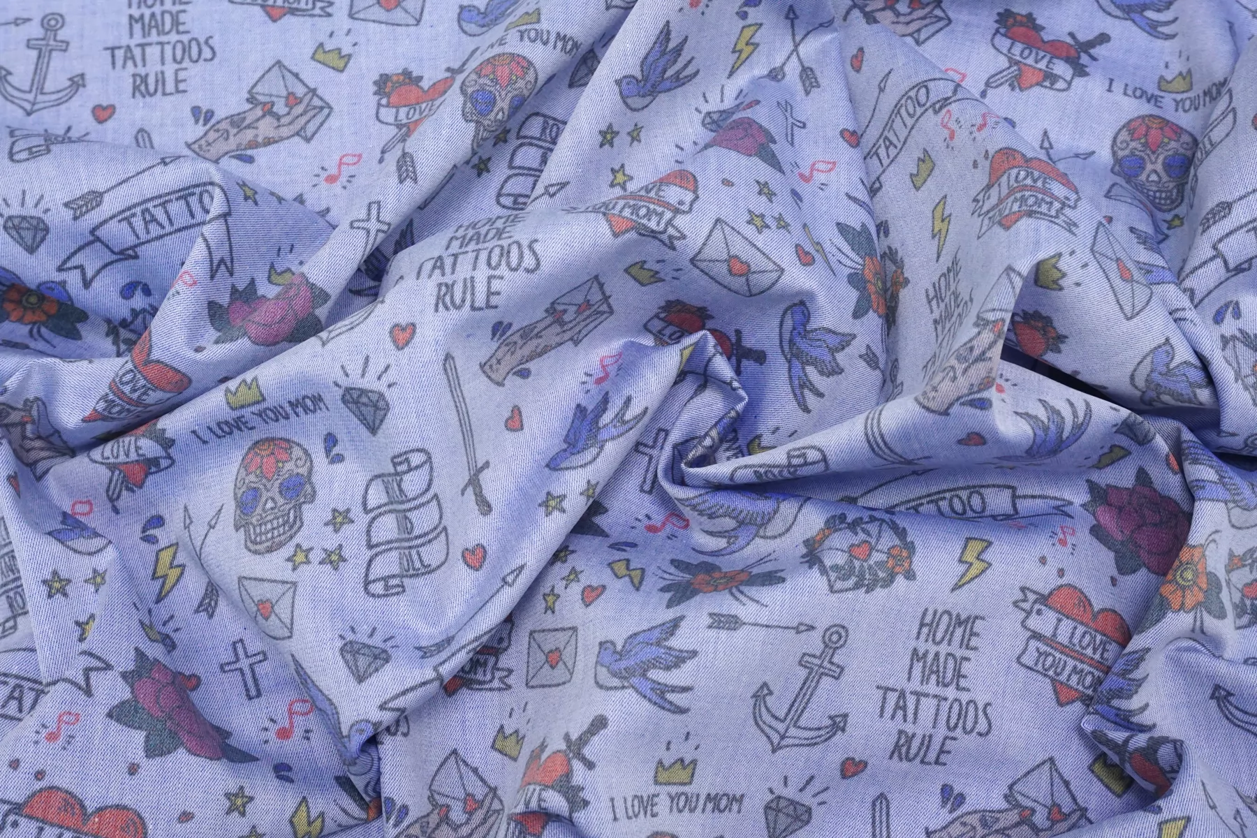 Классный рубашечно-плательный хлопок от бренда MOSCHINO с очень интересным принтом в виде мелких татуировок в приглушенных тонах на блекло-васильковом фоне. Изнанка светло-синяя. Плетение диагональное. Наощупь материал очень мягкий и нежный, скользящий, с легким матовым лоском. Синтетика в составе добавляет материалу прочности и износостойкости. Форму немножко держит, сминается, частично восстанавливается. Не тянется. Практически не просвечивает. Отличный вариант на рубашки, платья, юбки. При необходимости используйте подкладочный материал.