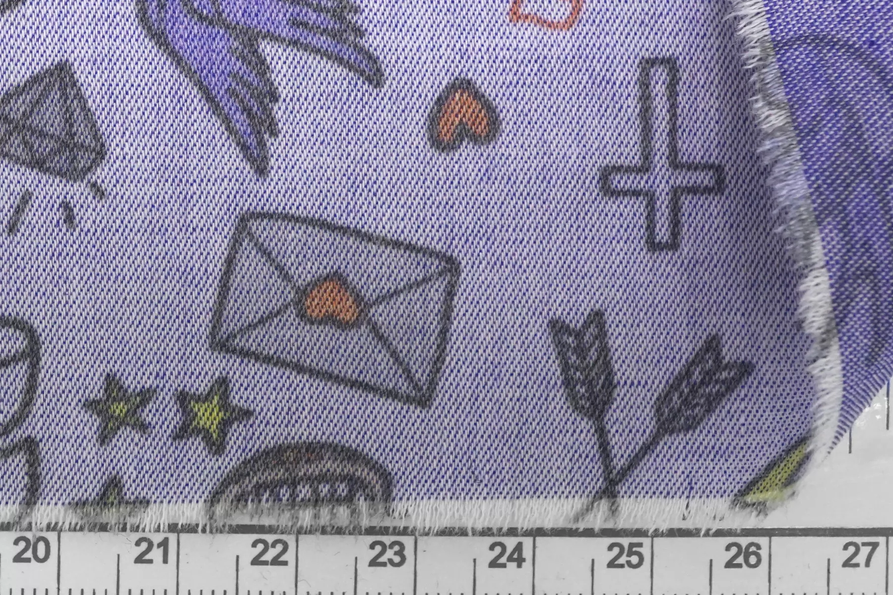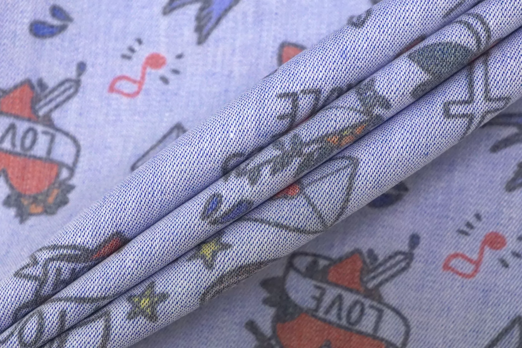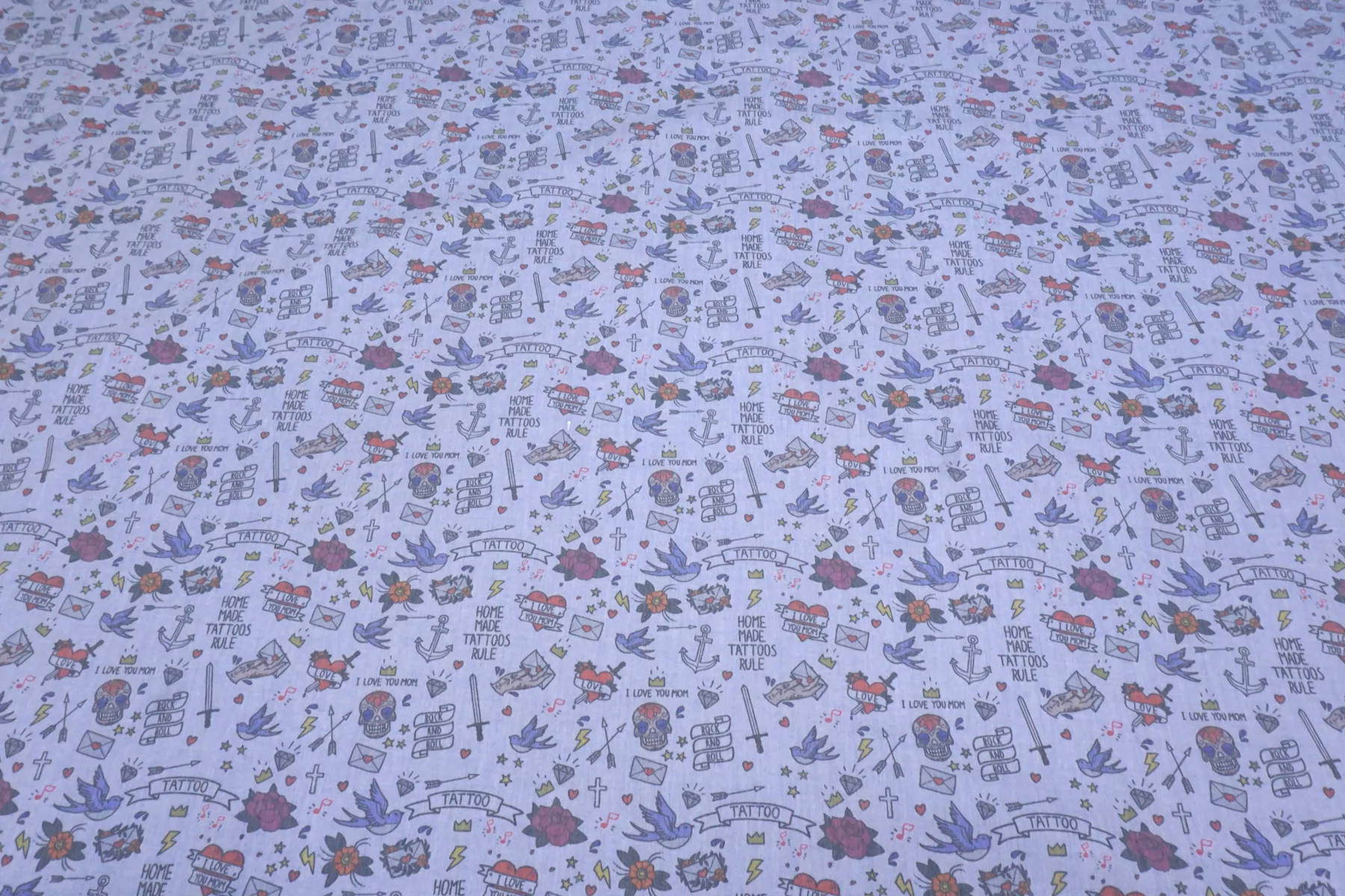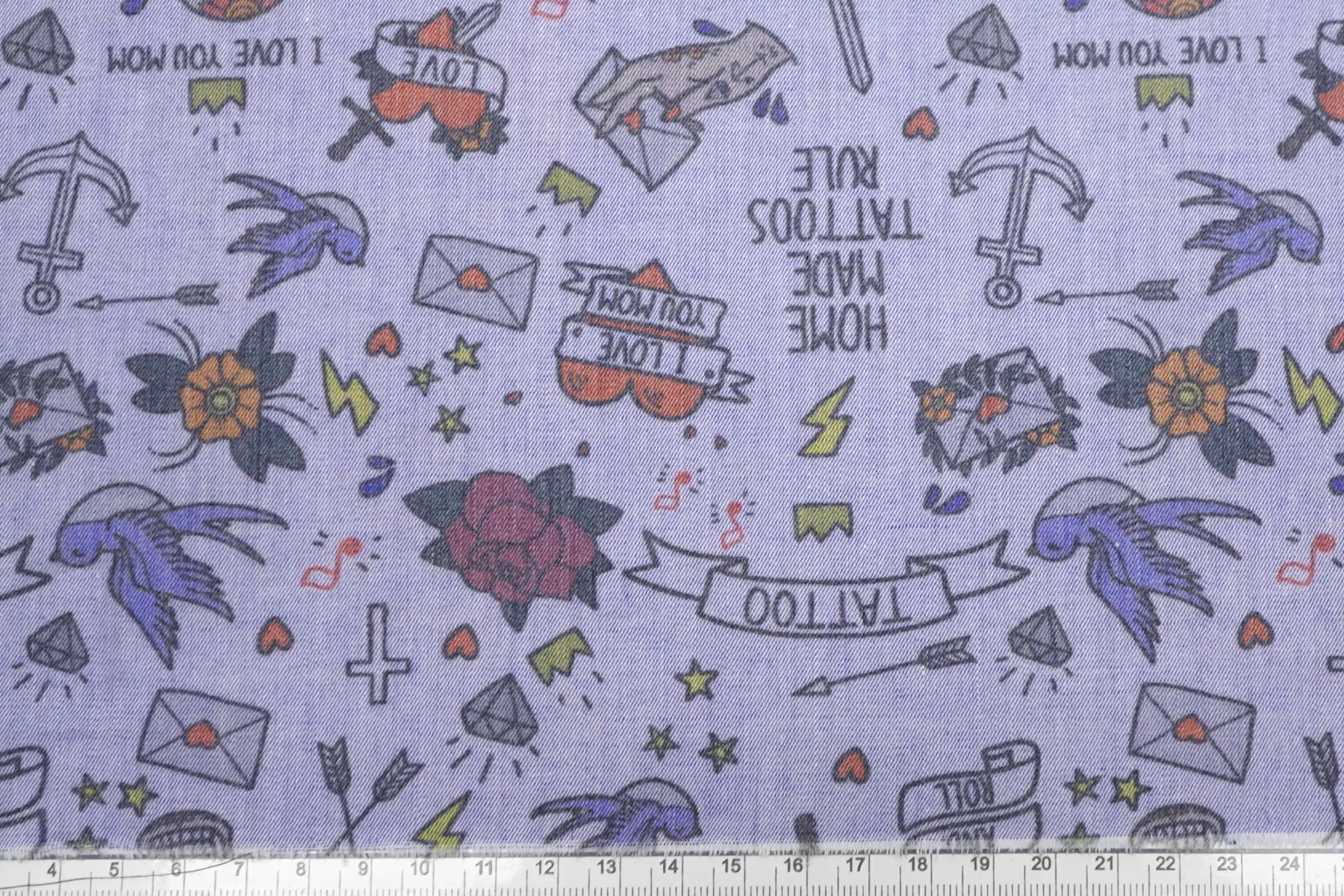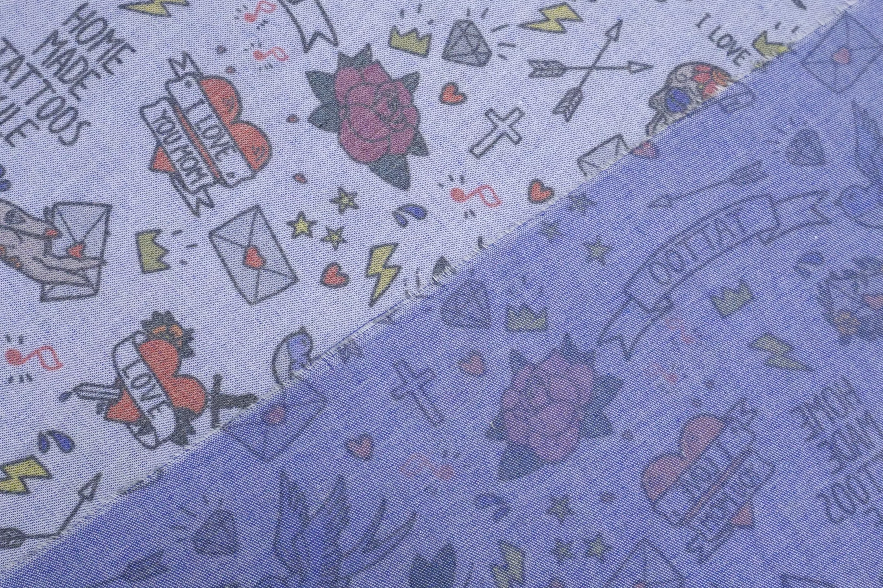 Классный рубашечно-плательный хлопок от бренда MOSCHINO с очень интересным принтом в виде мелких татуировок в приглушенных тонах на блекло-васильковом фоне. Изнанка светло-синяя. Плетение диагональное. Наощупь материал очень мягкий и нежный, скользящий, с легким матовым лоском. Синтетика в составе добавляет материалу прочности и износостойкости. Форму немножко держит, сминается, частично восстанавливается. Не тянется. Практически не просвечивает. Отличный вариант на рубашки, платья, юбки. При необходимости используйте подкладочный материал.