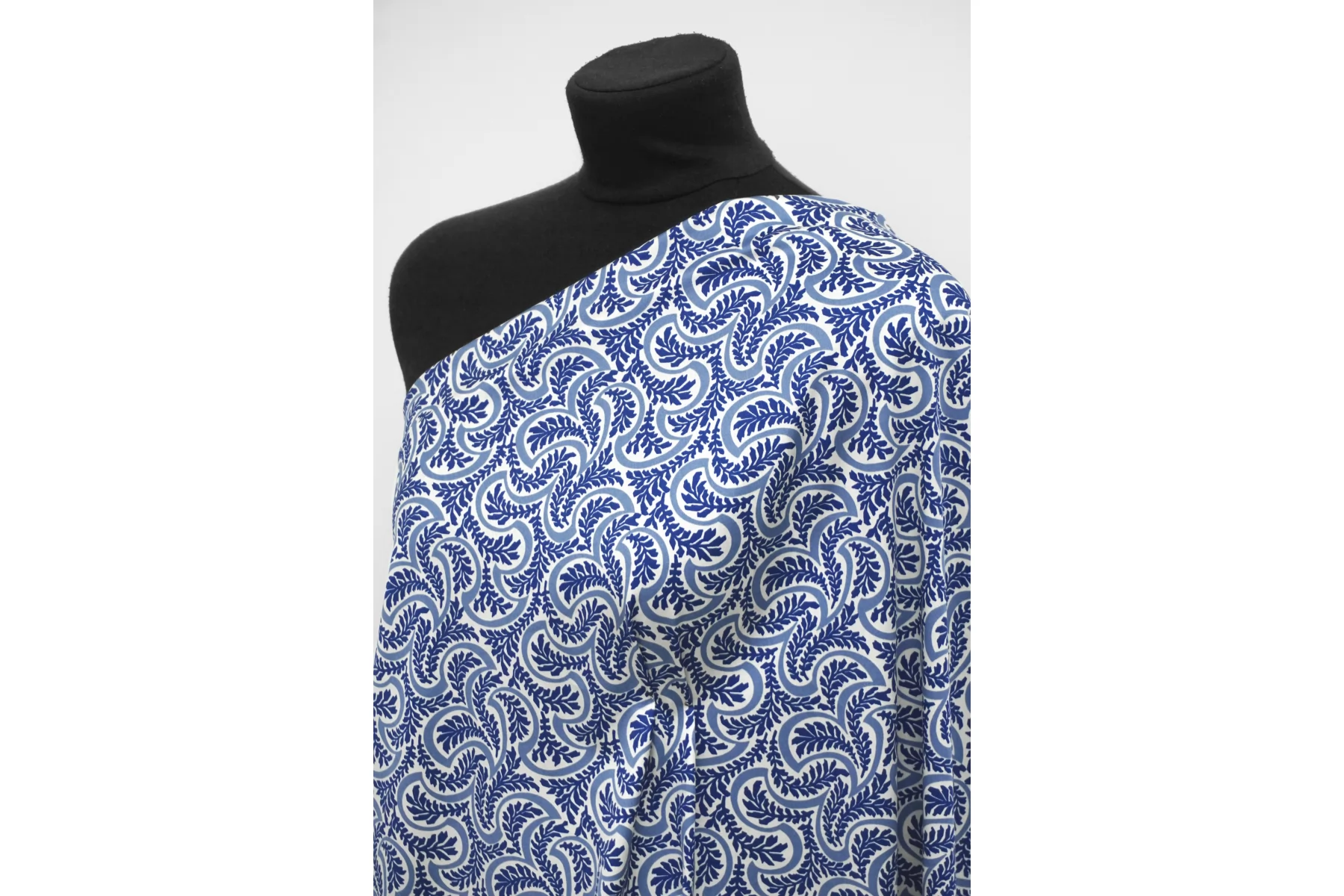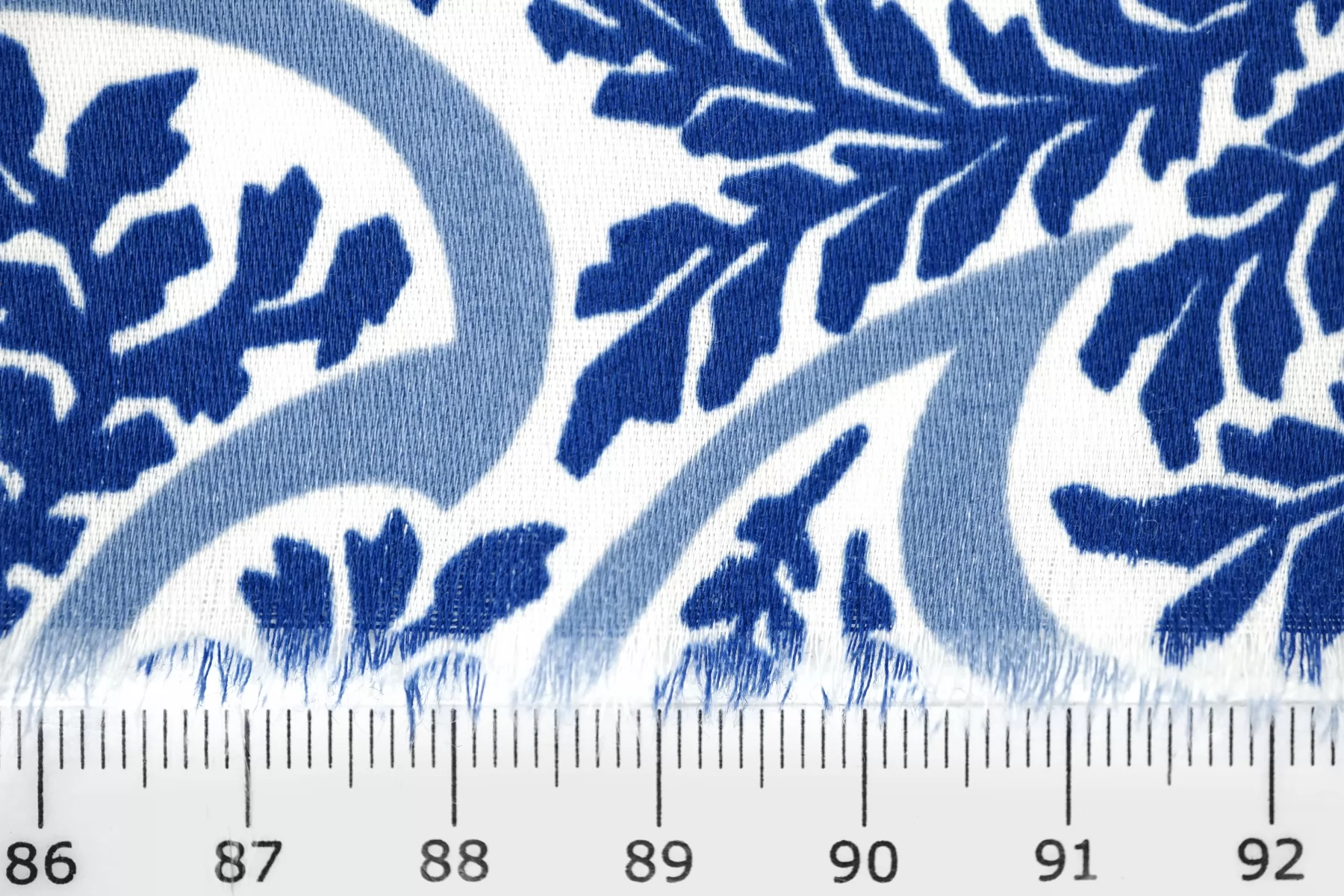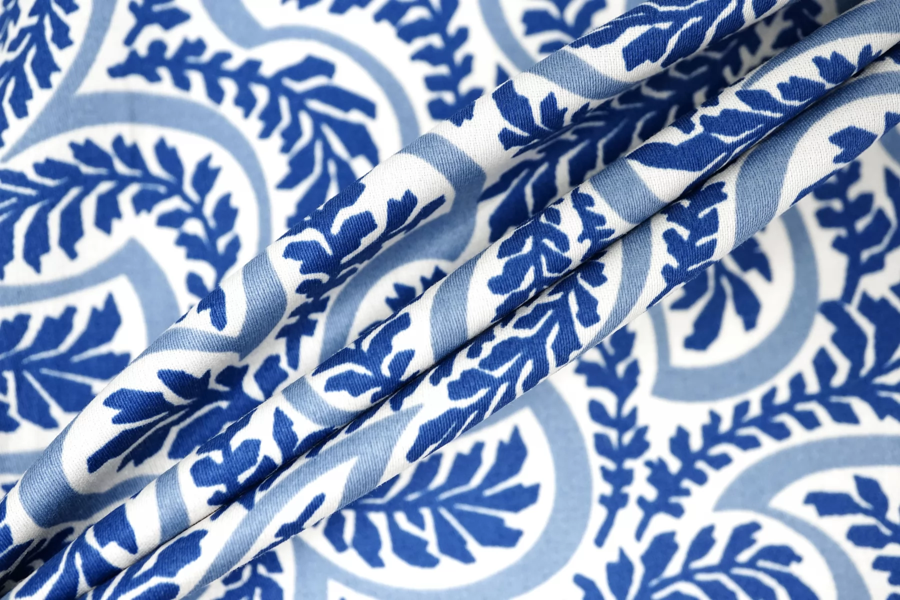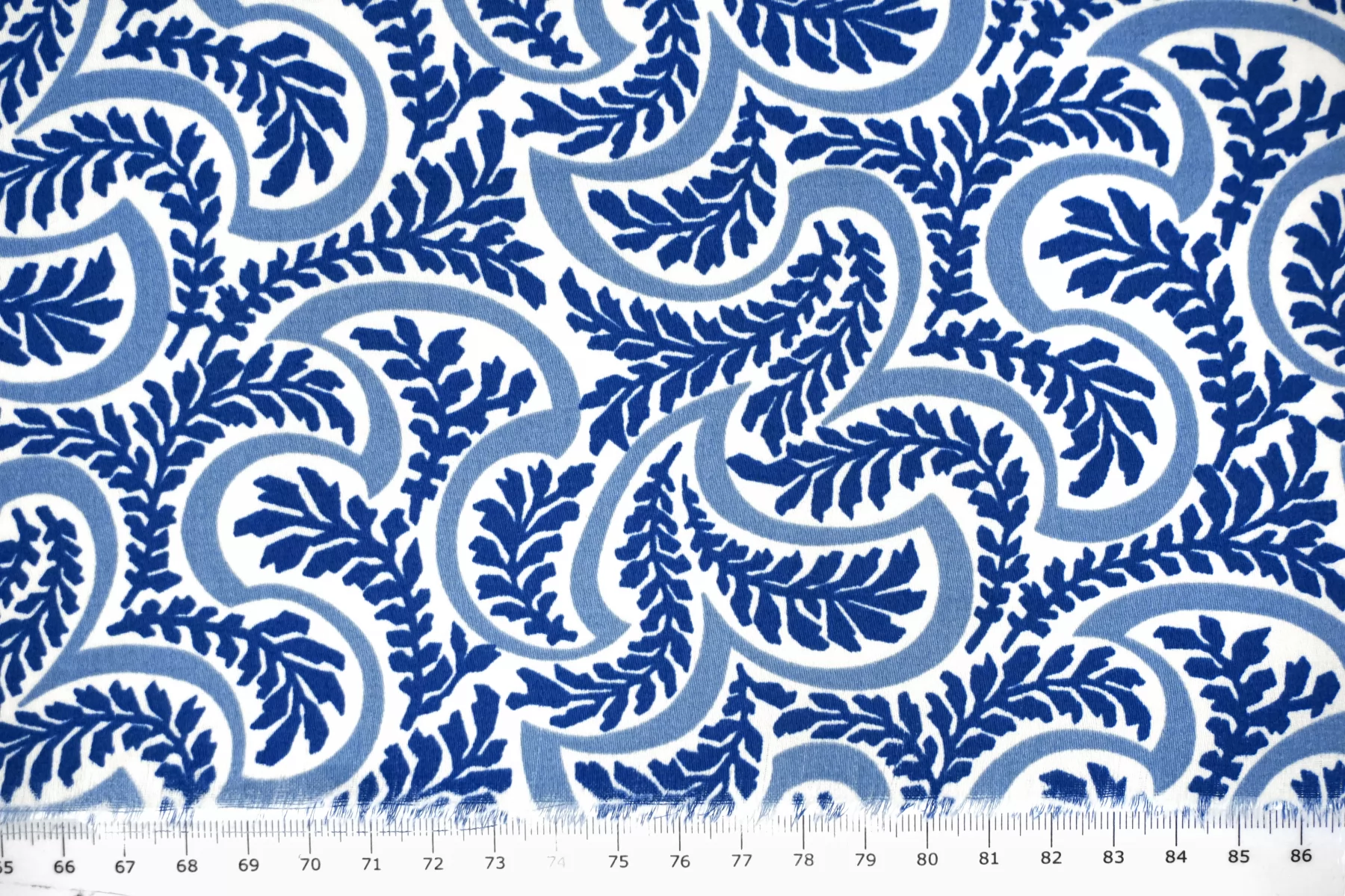 Костюмно-плательный хлопок от бренда Max Mara с сине-молочным орнаментом в виде растений. Тонкий, очень приятный наощупь, слегка заметен силуэт, если смотреть прямо на просвет. Немного тянется за счет добавления эластана. Материал гладкий, с небольшим матовым лоском. Немного держит форму. Отличный вариант для летнего изделия - платья, рубашки, сарафана, кимоно.