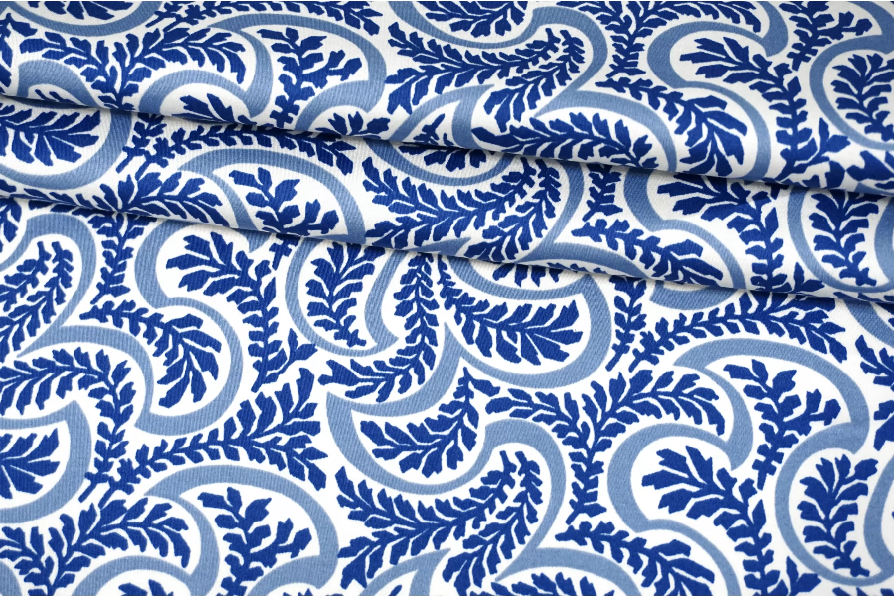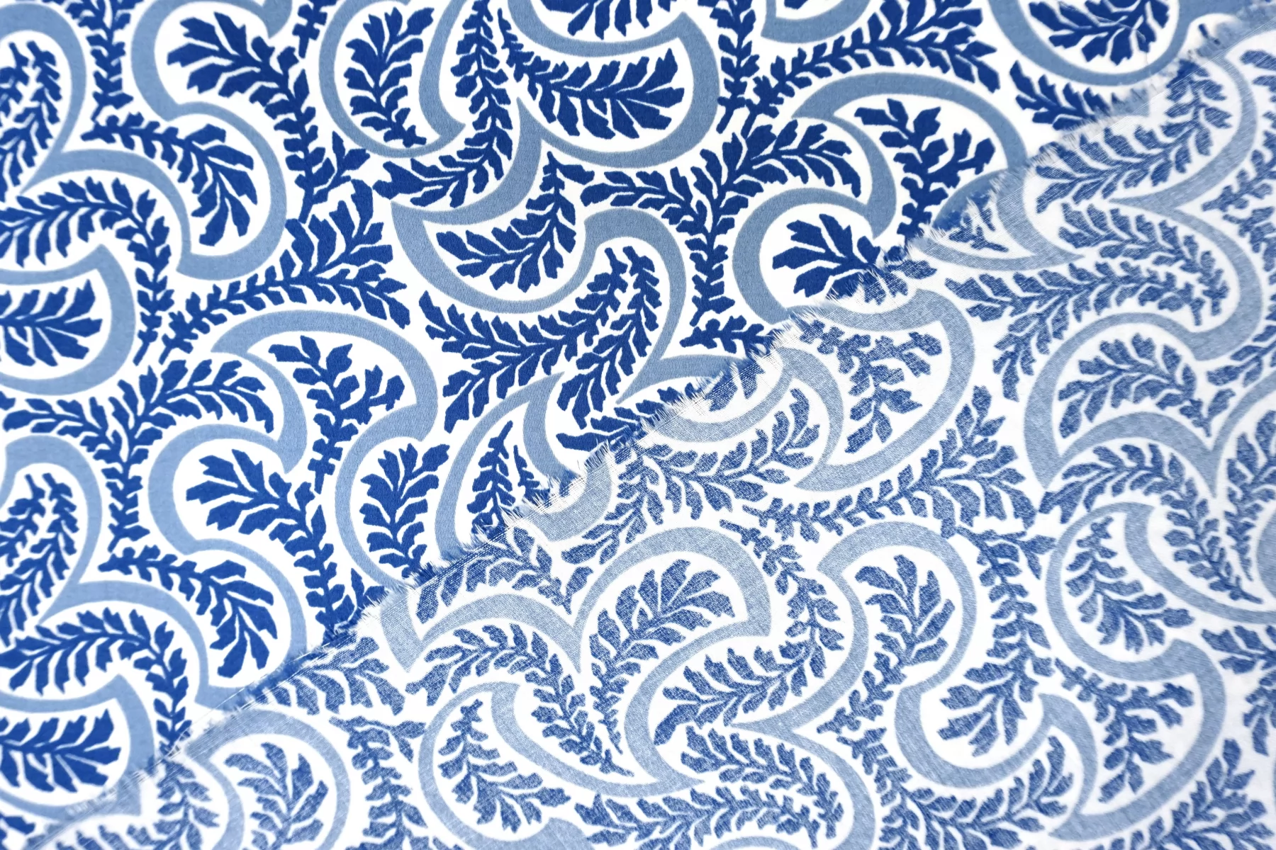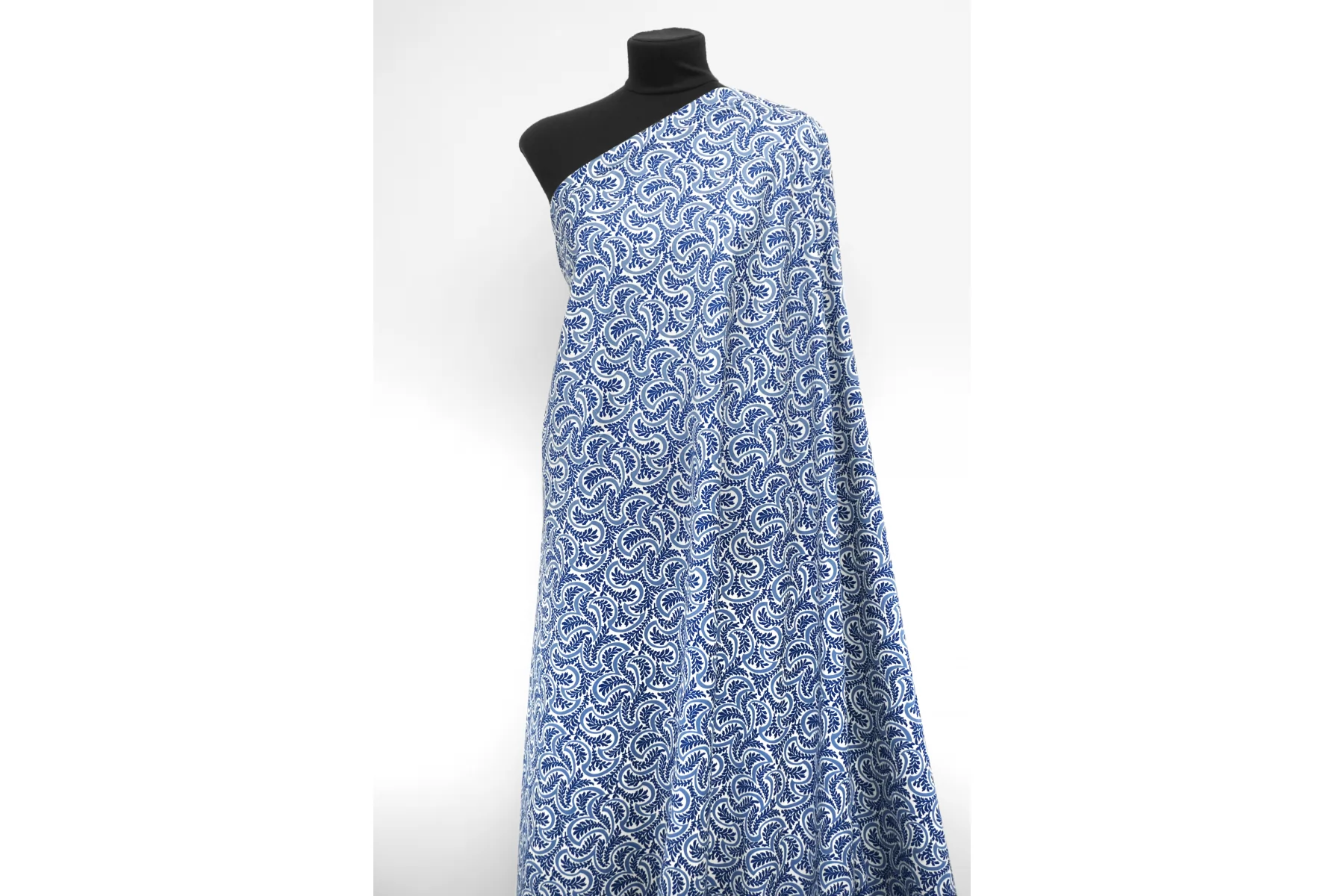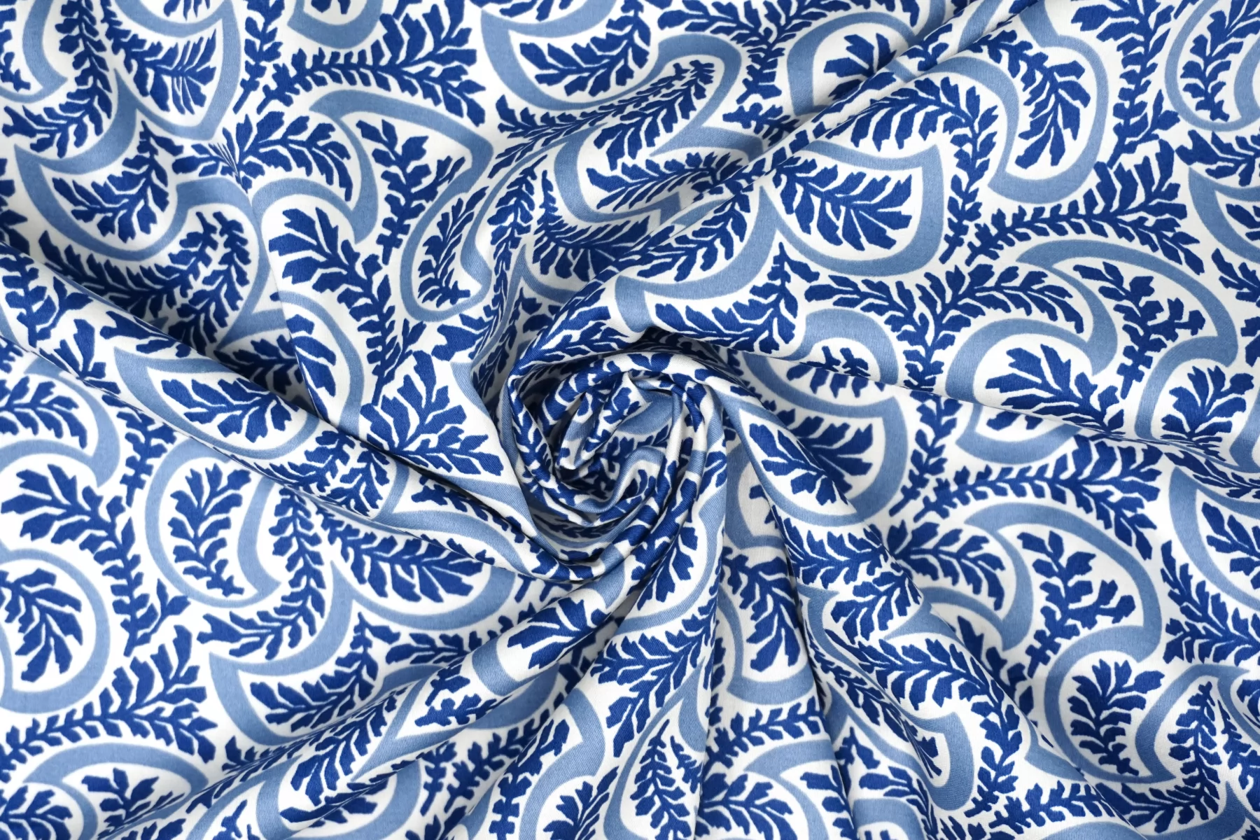 Костюмно-плательный хлопок от бренда Max Mara с сине-молочным орнаментом в виде растений. Тонкий, очень приятный наощупь, слегка заметен силуэт, если смотреть прямо на просвет. Немного тянется за счет добавления эластана. Материал гладкий, с небольшим матовым лоском. Немного держит форму. Отличный вариант для летнего изделия - платья, рубашки, сарафана, кимоно.
