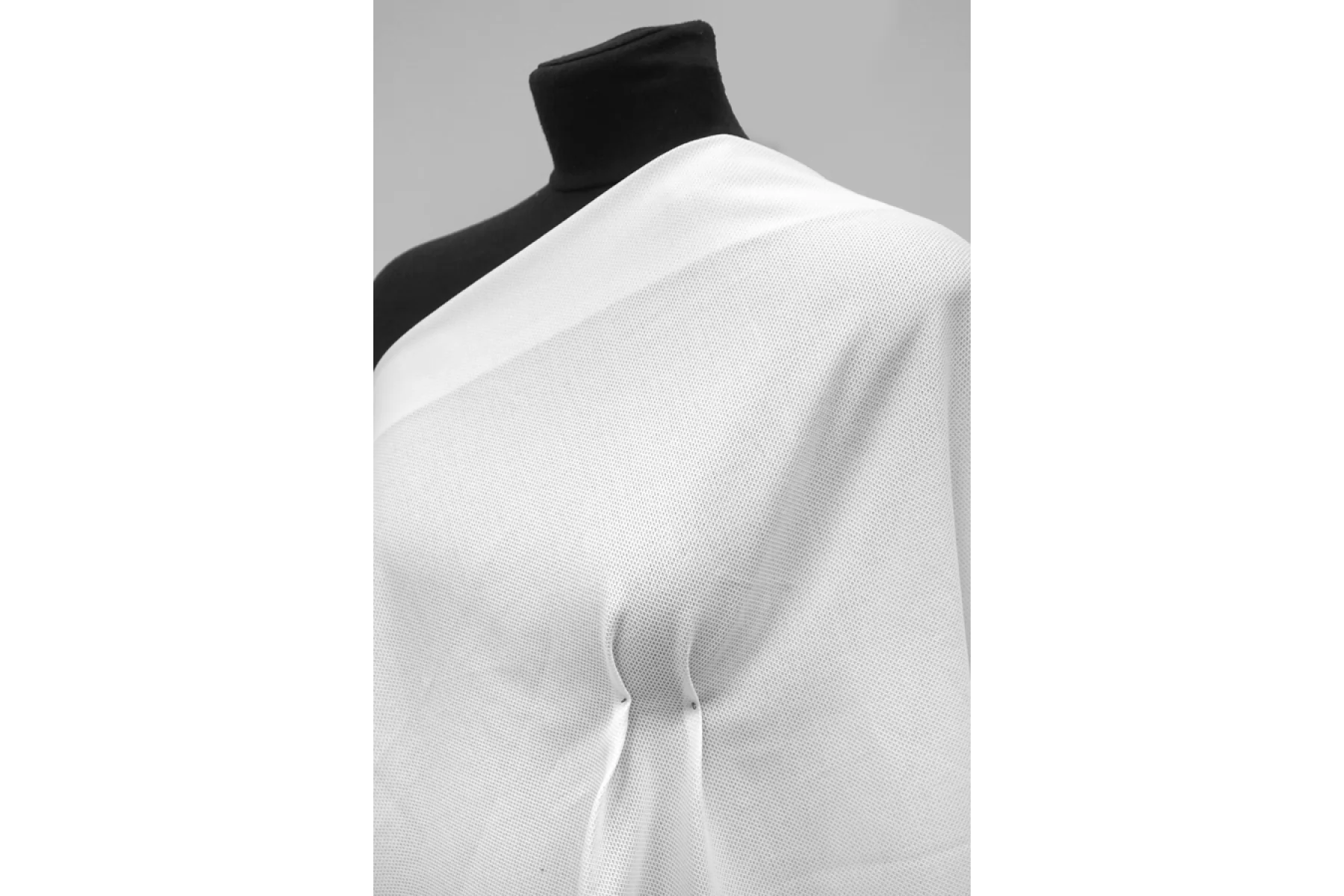 Интересный итальянский хлопок-сетка от Gucci в белом цвете. Рубашечно-плательной плотности, довольно мелкие ячейки. Пластичный, немного держит форму. Просвечивает, плетение немного тянется. Прекрасный вариант на рубашки, юбки, платья. Материал дает усадку.