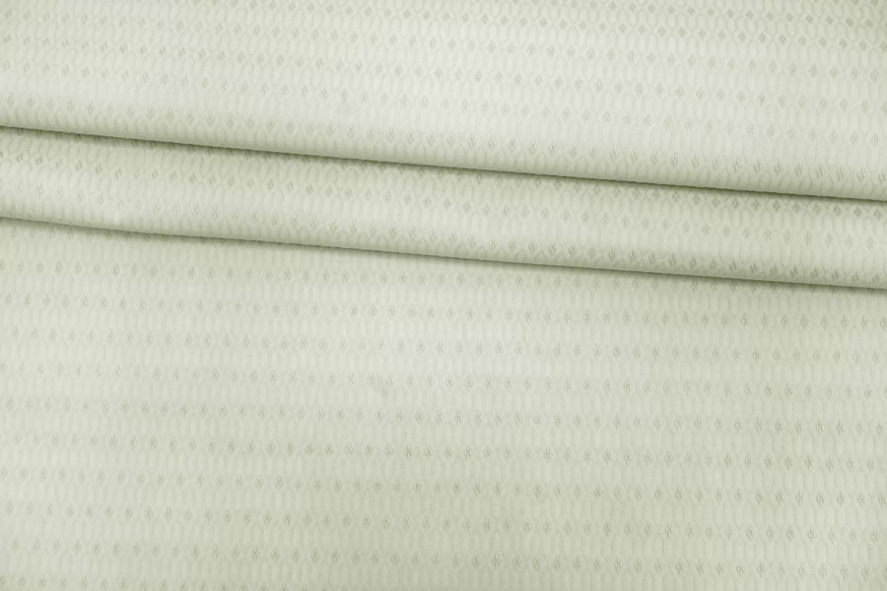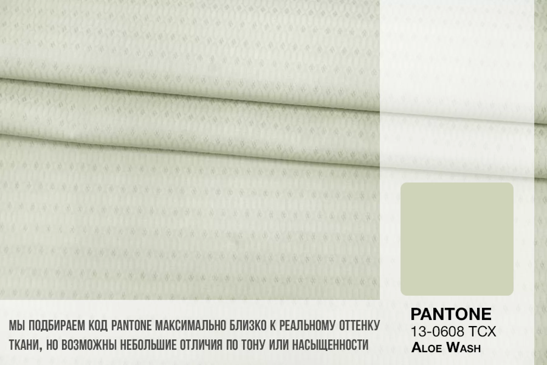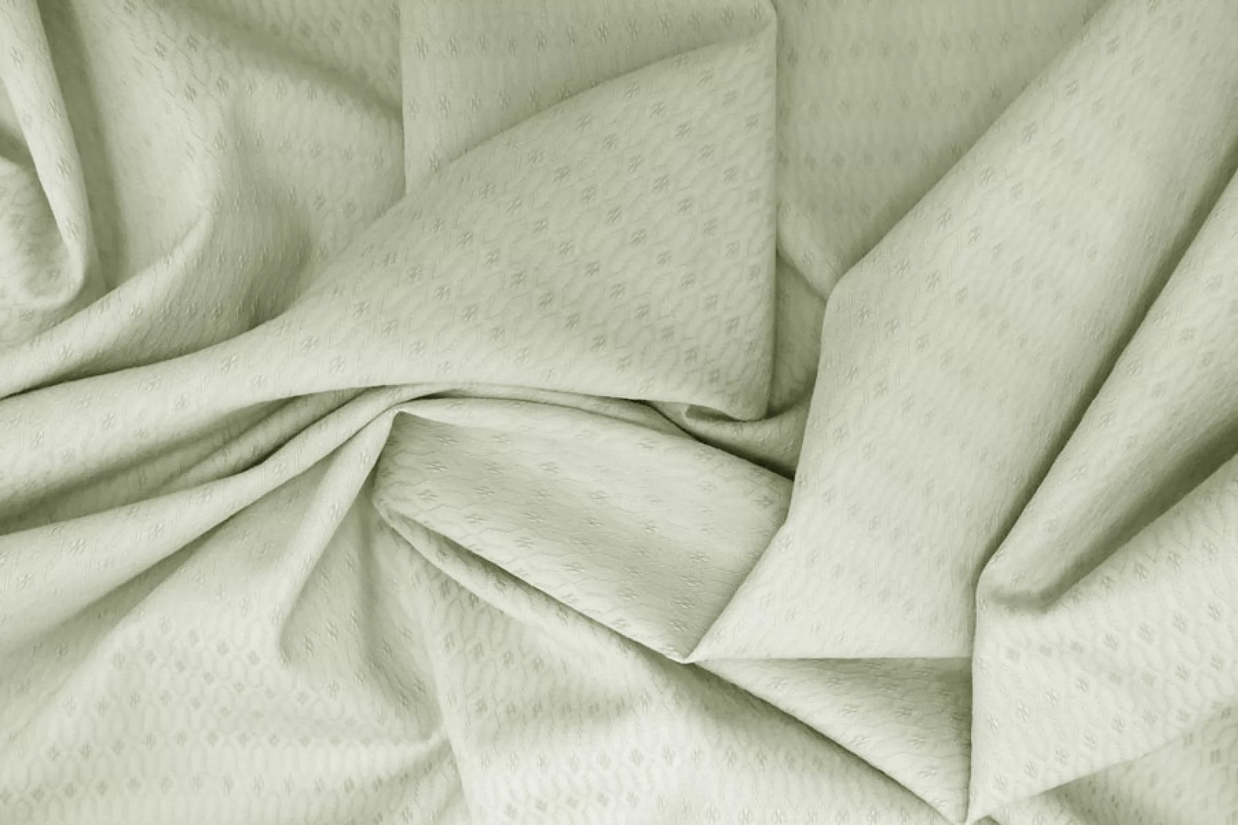 Итальянский рубашечно-плательный хлопок с жаккардовой выработкой мелкого орнамента в бледно-фисташковом оттенке. Имеет легкий приятный лоск. Выглядит дорого. Тонкий, пластичный, легкий. Тактильно очень приятный, мягкий, чувствуется фактура. Красиво смотрится в складке. Форму держит. Не тянется. Слегка сминается. Немного светит. Подойдет для пошива платья, рубашки, юбки, сарафана. Учитывайте возможную усадку.