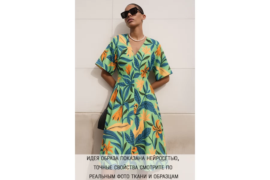 Рубашечный хлопок фисташкового оттенка с крупным абстрактно-цветочным принтом в оттенках синего, оранжевого, хаки и песочно-желтого оттенков. Материал тактильно приятный, мягкий, плотненький. Еле заметно просвечивает силуэт на просвет. Не тянется. Мнется. Хорошо держит форму и драпируется. Шьем рубашки, платья, сарафаны и юбки. При необходимости используйте подкладочный материал.