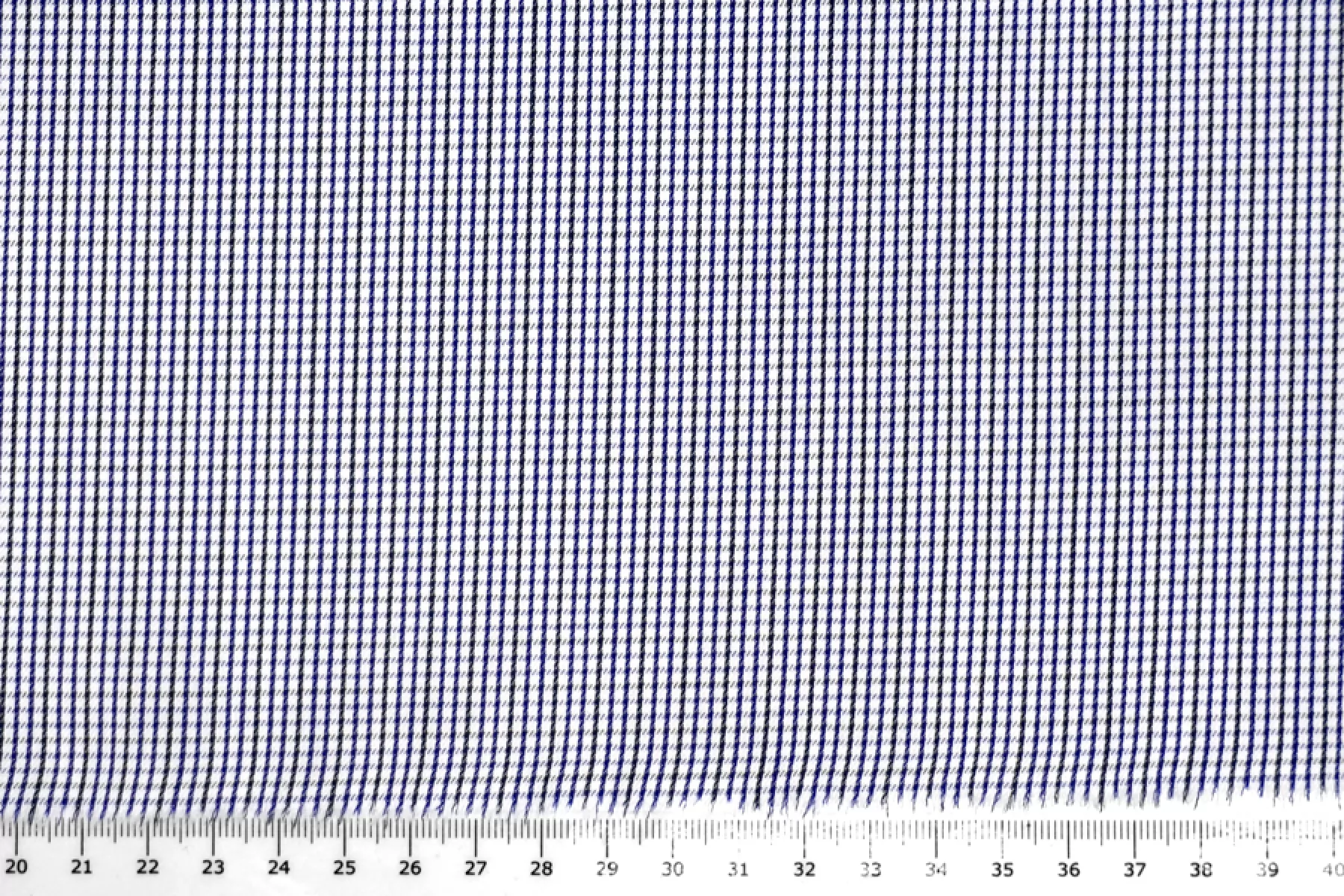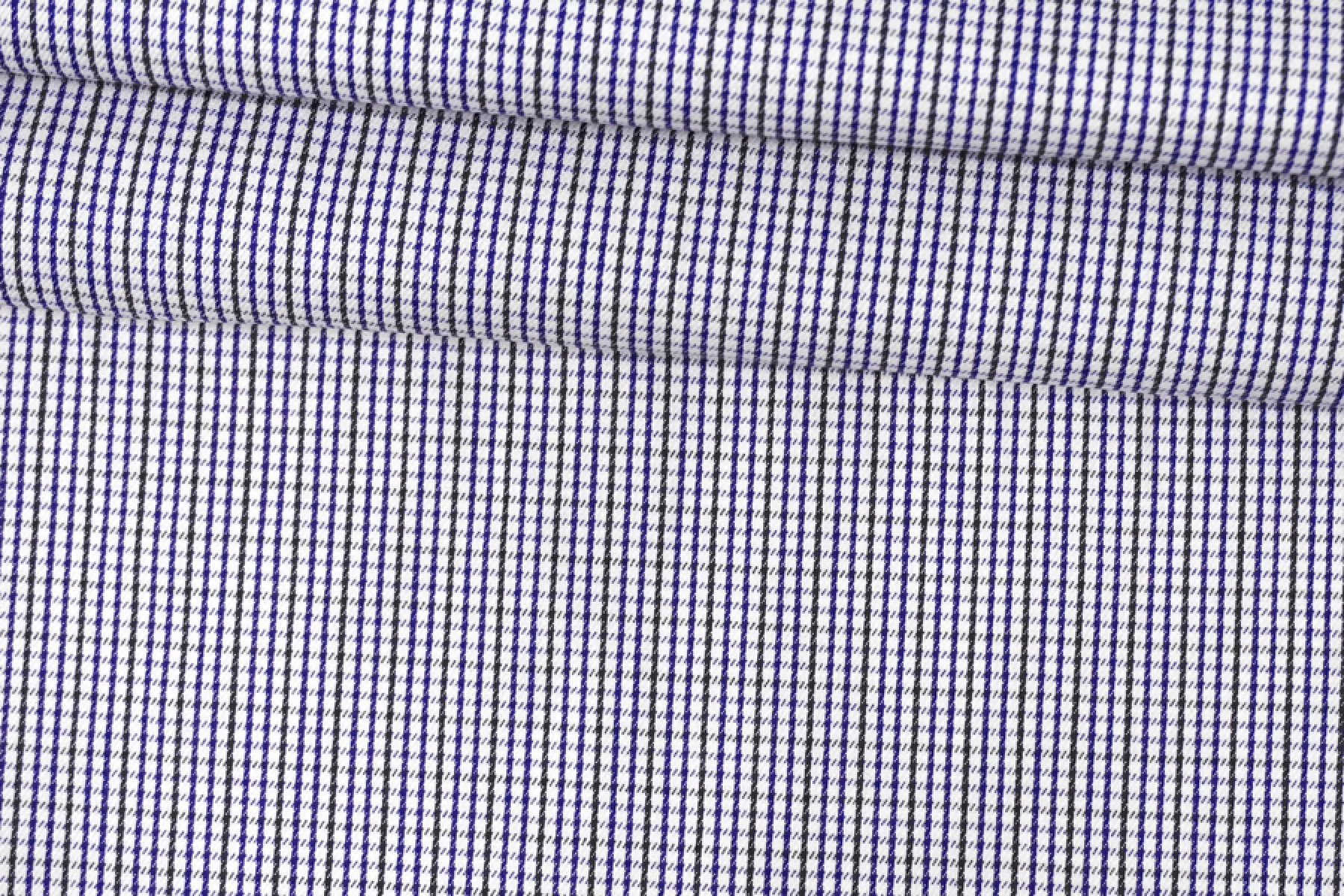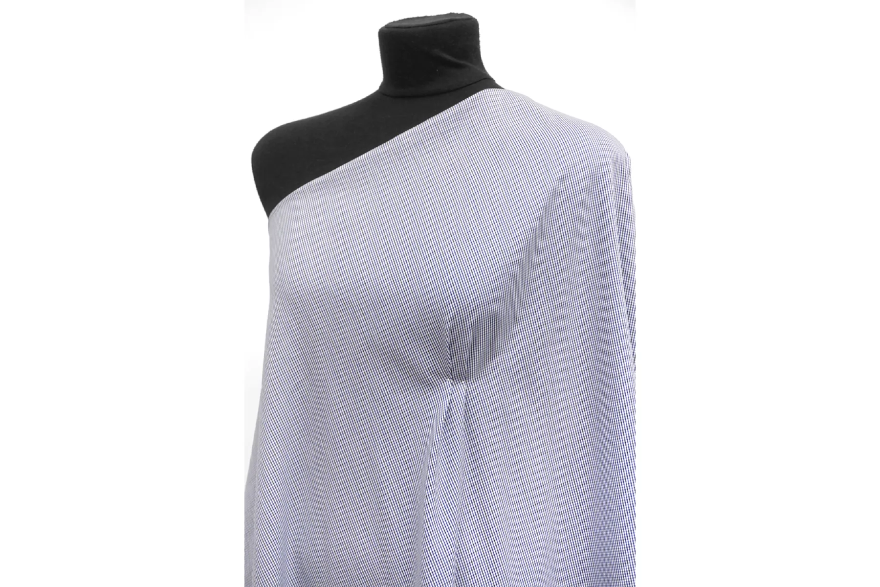 Рубашечный хлопок в клетку, от фабрики Cotonificio Albini, диагонального плетения, белого оттенка с вплетением нитей синего и черного оттенков, что создает рисунок мелкой клетки. Тактильно мягкий и приятный, гладкий. Хорошо драпируется и немного держит форму. Красиво смотрится в складках. Не просвечивает, но если смотреть прямо на просвет, слегка заметен силуэт. Не тянется, но хорошо пружинит за счет плетения. Несильно сминается. Классно подойдет на рубашки, юбки, платья и не только. При необходимости используйте подкладочный материал.