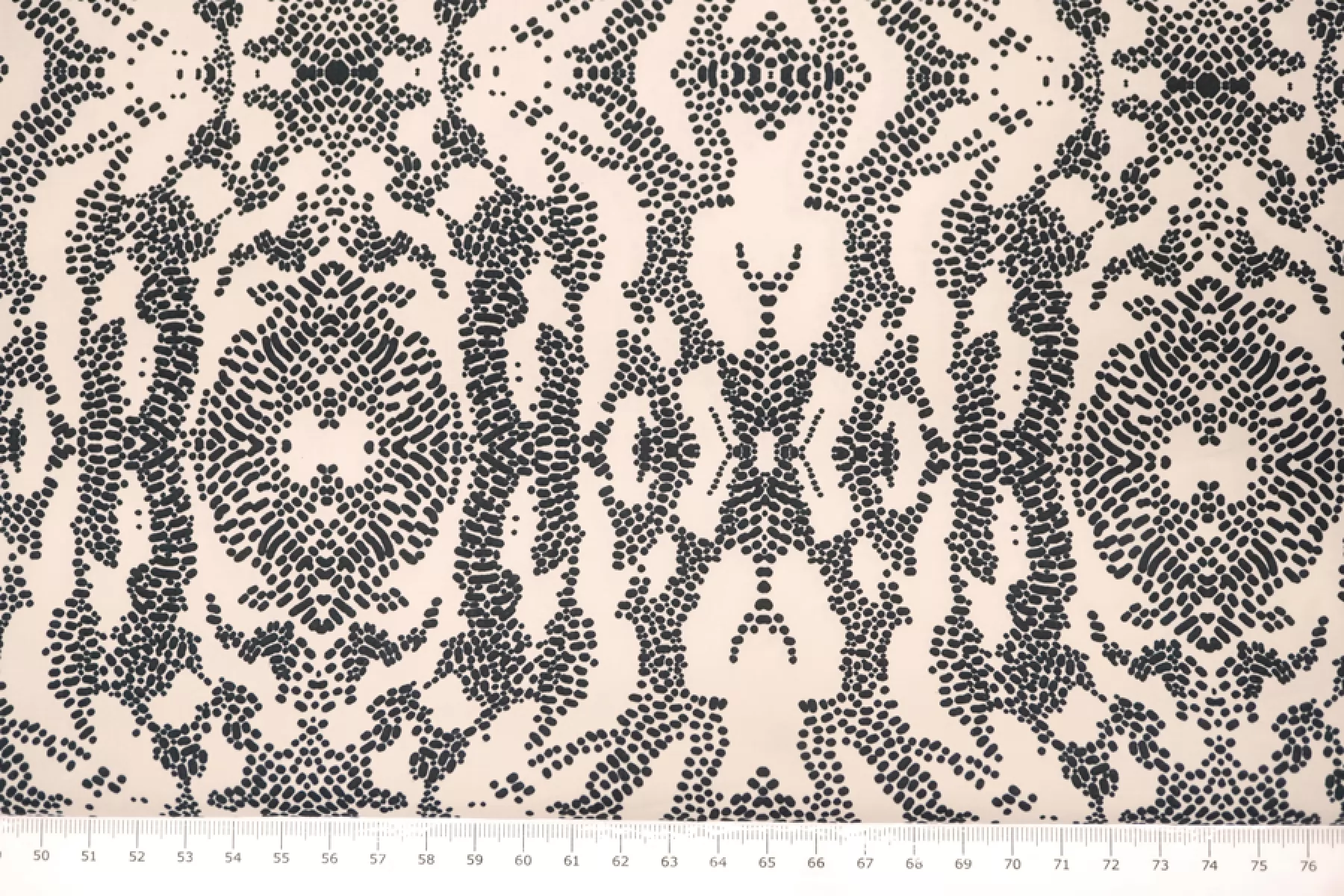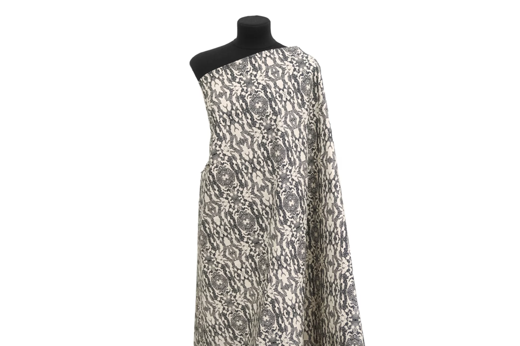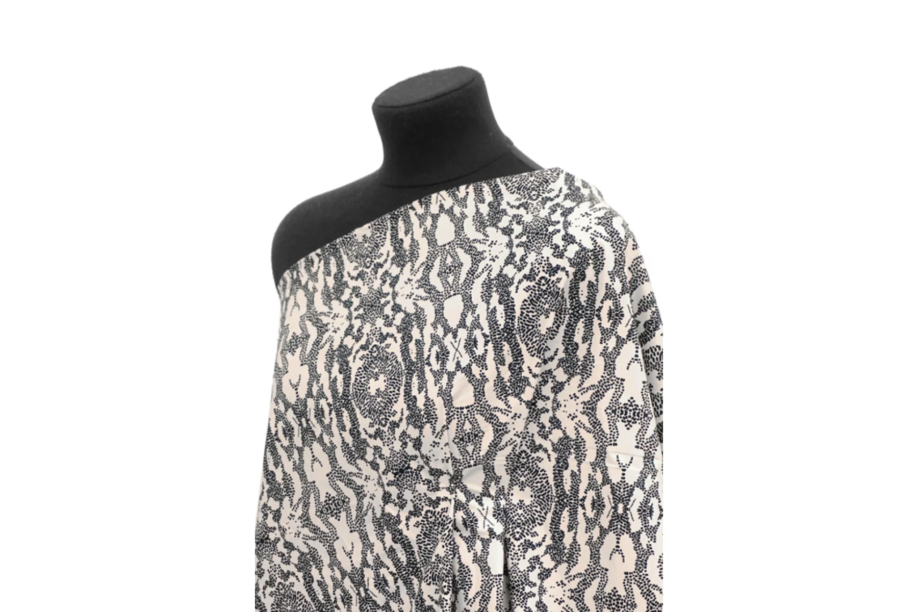 Рубашечный хлопок от Max Mara молочно-бежевого цвета с этническим принтом, выполненным в стиле пуантилизма. Материал тактильно приятный, похрустывающий. Плотный по плетению. Не просвечивает. Отлично драпируется и неплохо держит форму. Мнется. Не тянется. Отличный вариант на рубашки, платья и юбки.