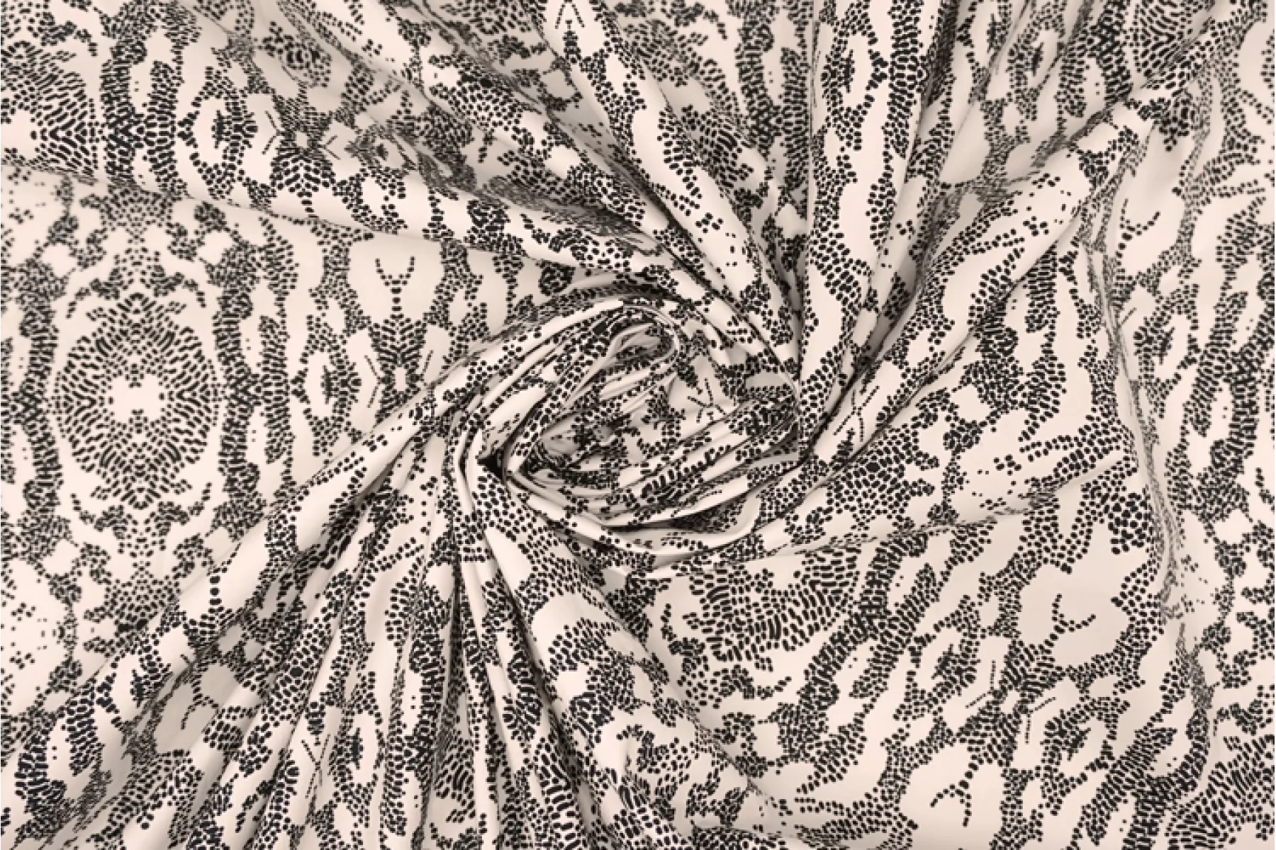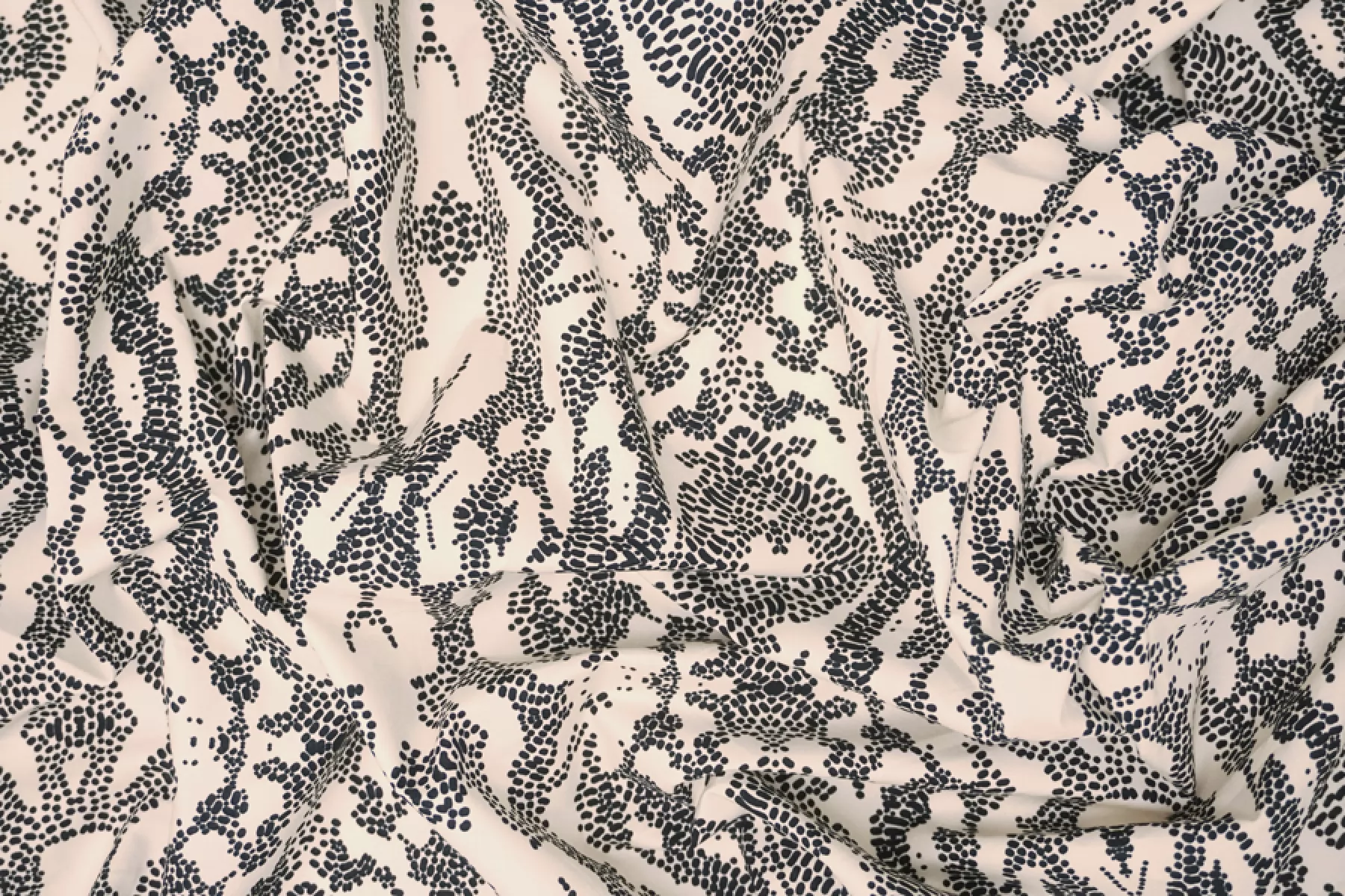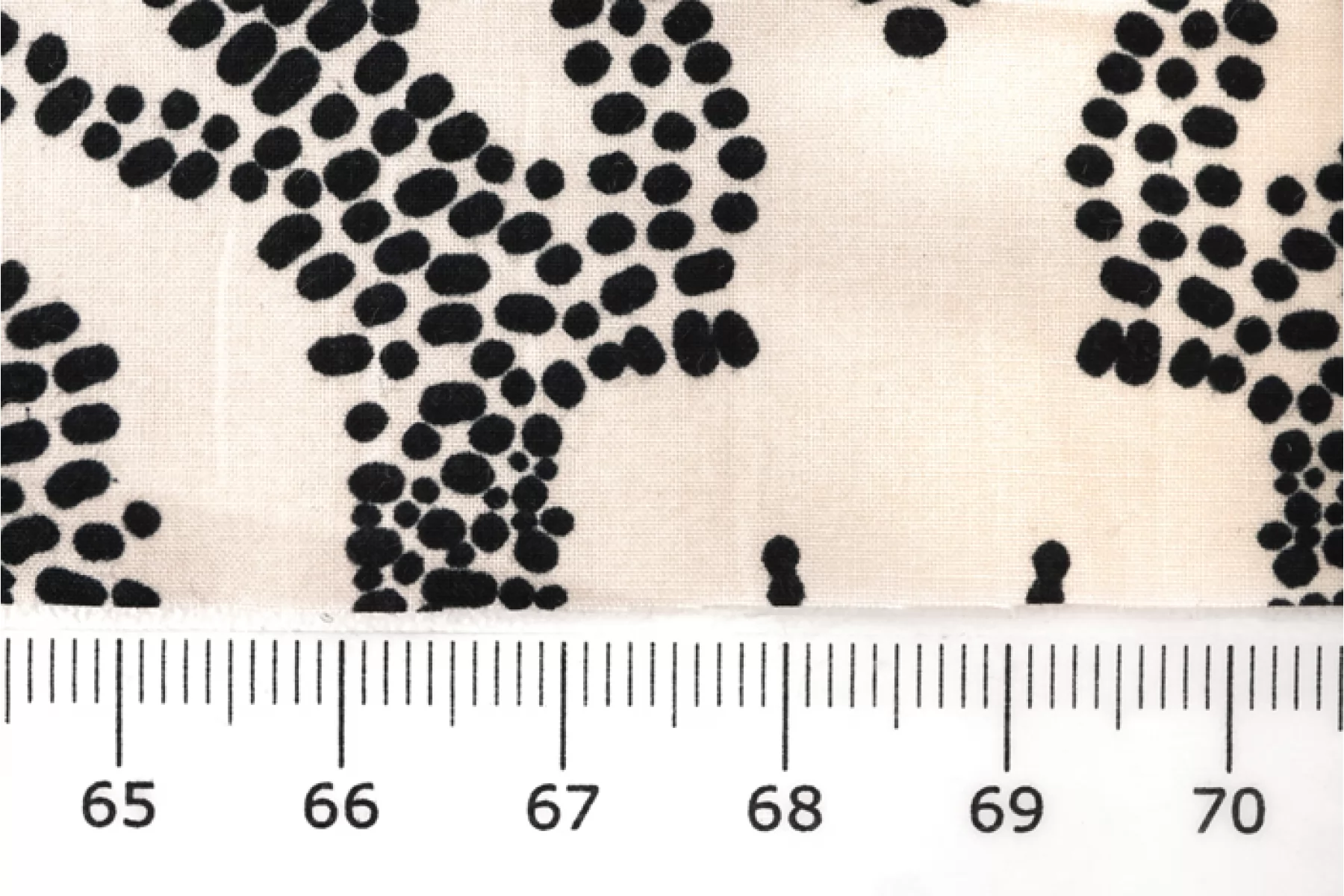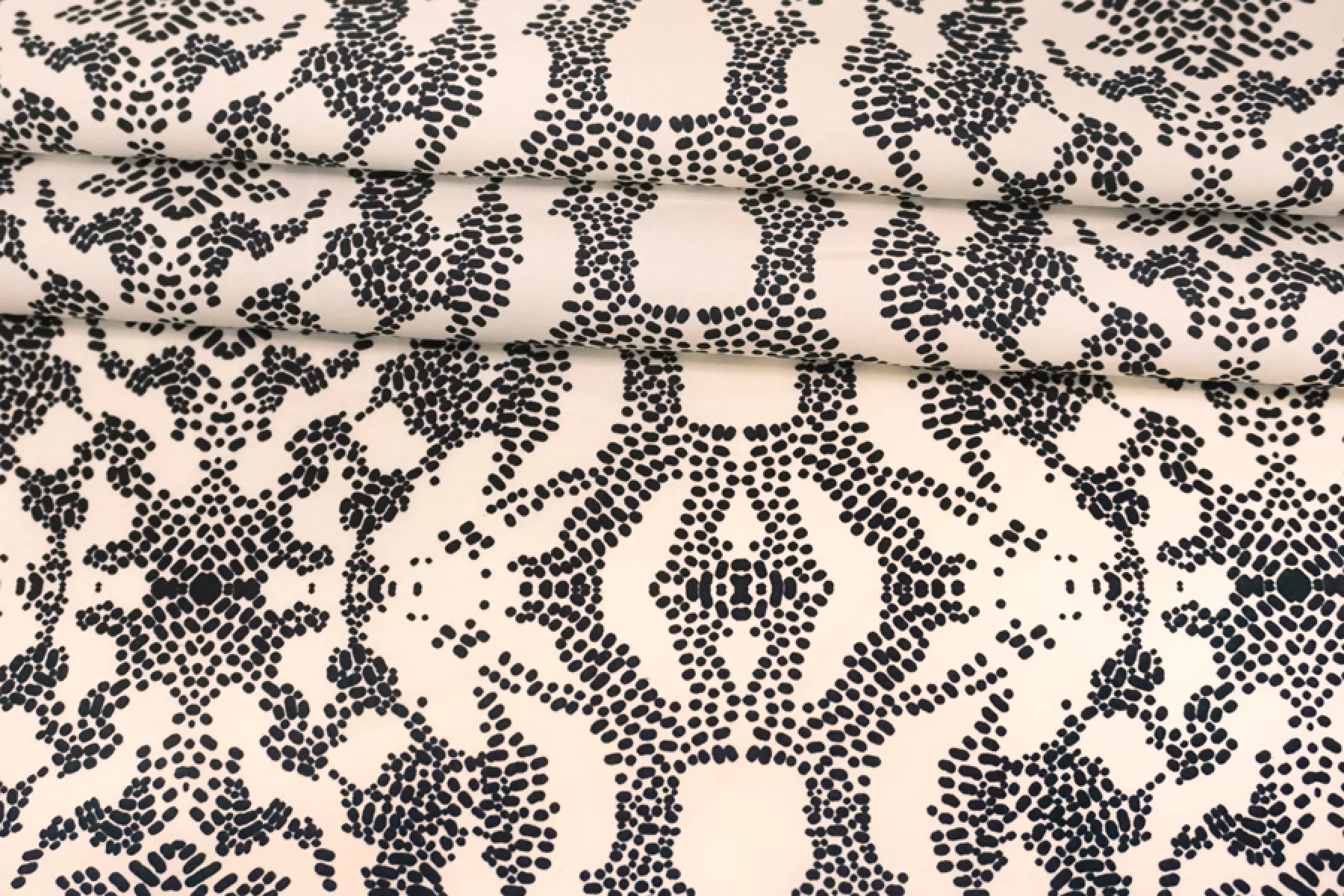 Рубашечный хлопок от Max Mara молочно-бежевого цвета с этническим принтом, выполненным в стиле пуантилизма. Материал тактильно приятный, похрустывающий. Плотный по плетению. Не просвечивает. Отлично драпируется и неплохо держит форму. Мнется. Не тянется. Отличный вариант на рубашки, платья и юбки.
