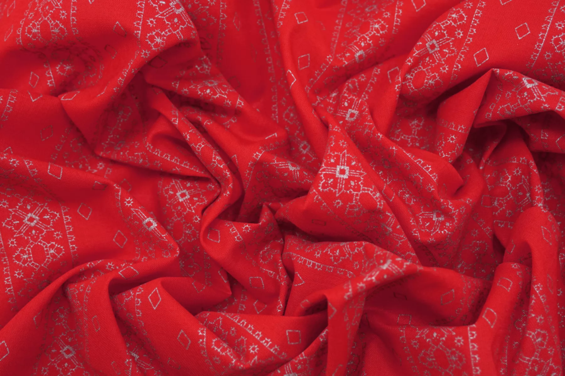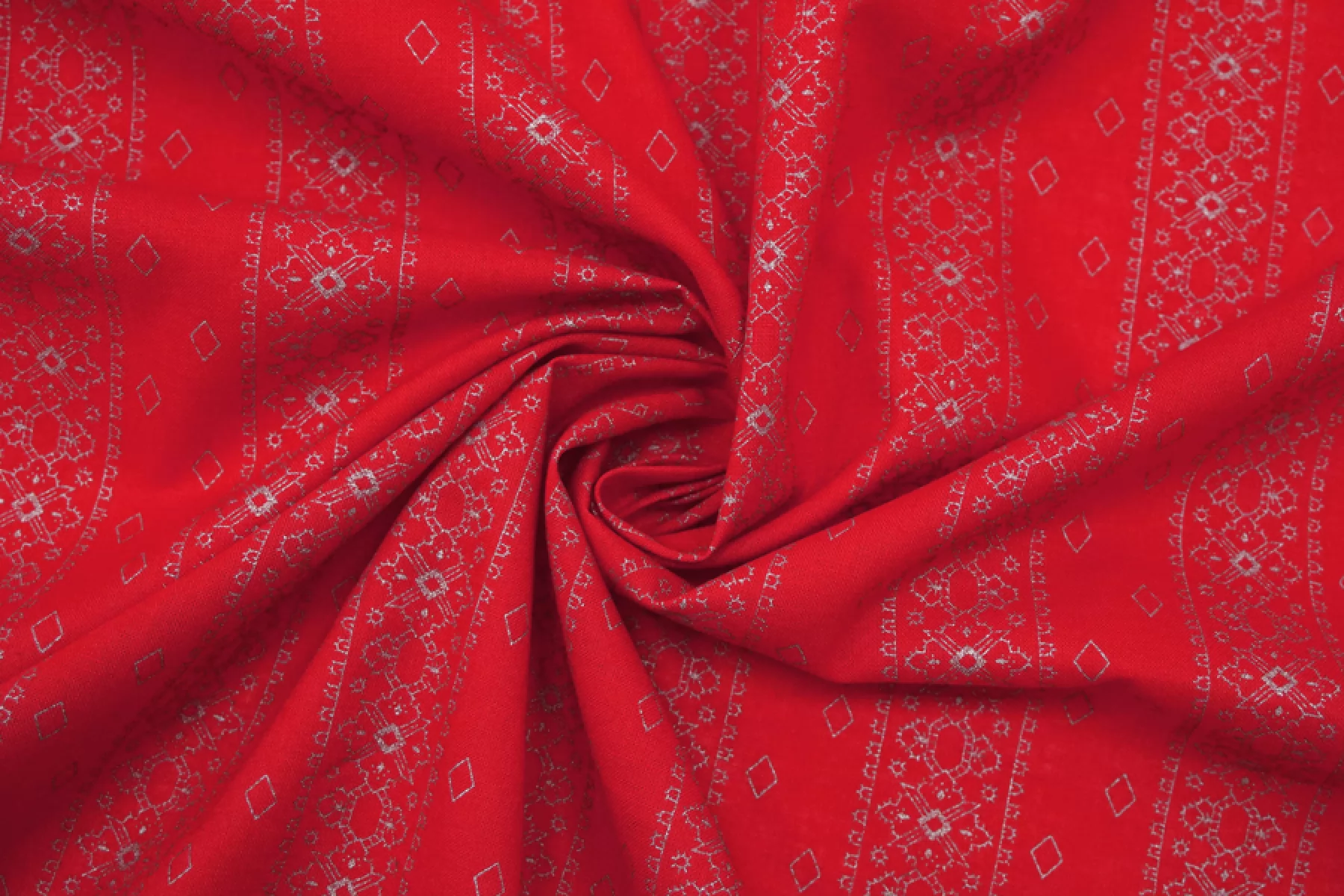 Итальянский рубашечный хлопок красного цвета с напылением в виде серебристого орнамента. Тонкий, пластичный, легкий, не тянется, просвечивает. Подойдет для пошива платья, рубашки, юбки. (Учитывайте, что просвечивает).