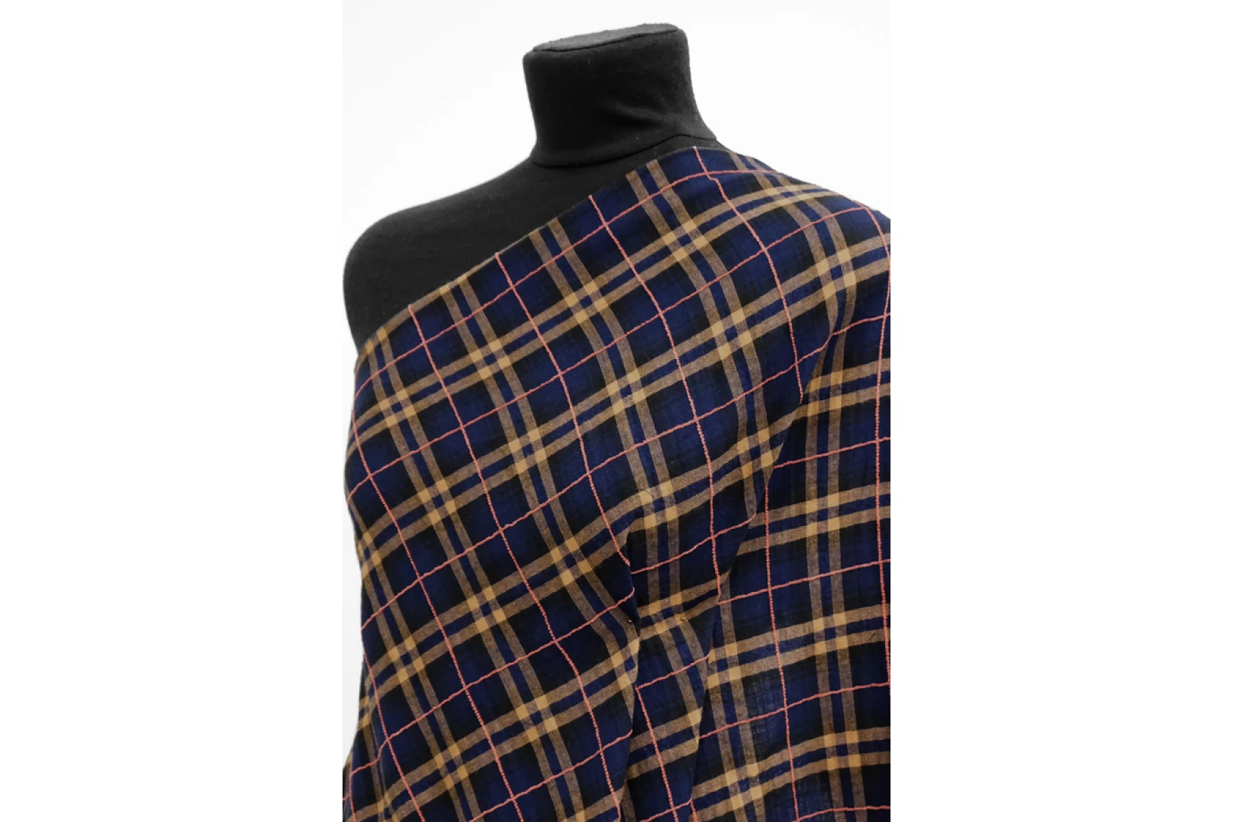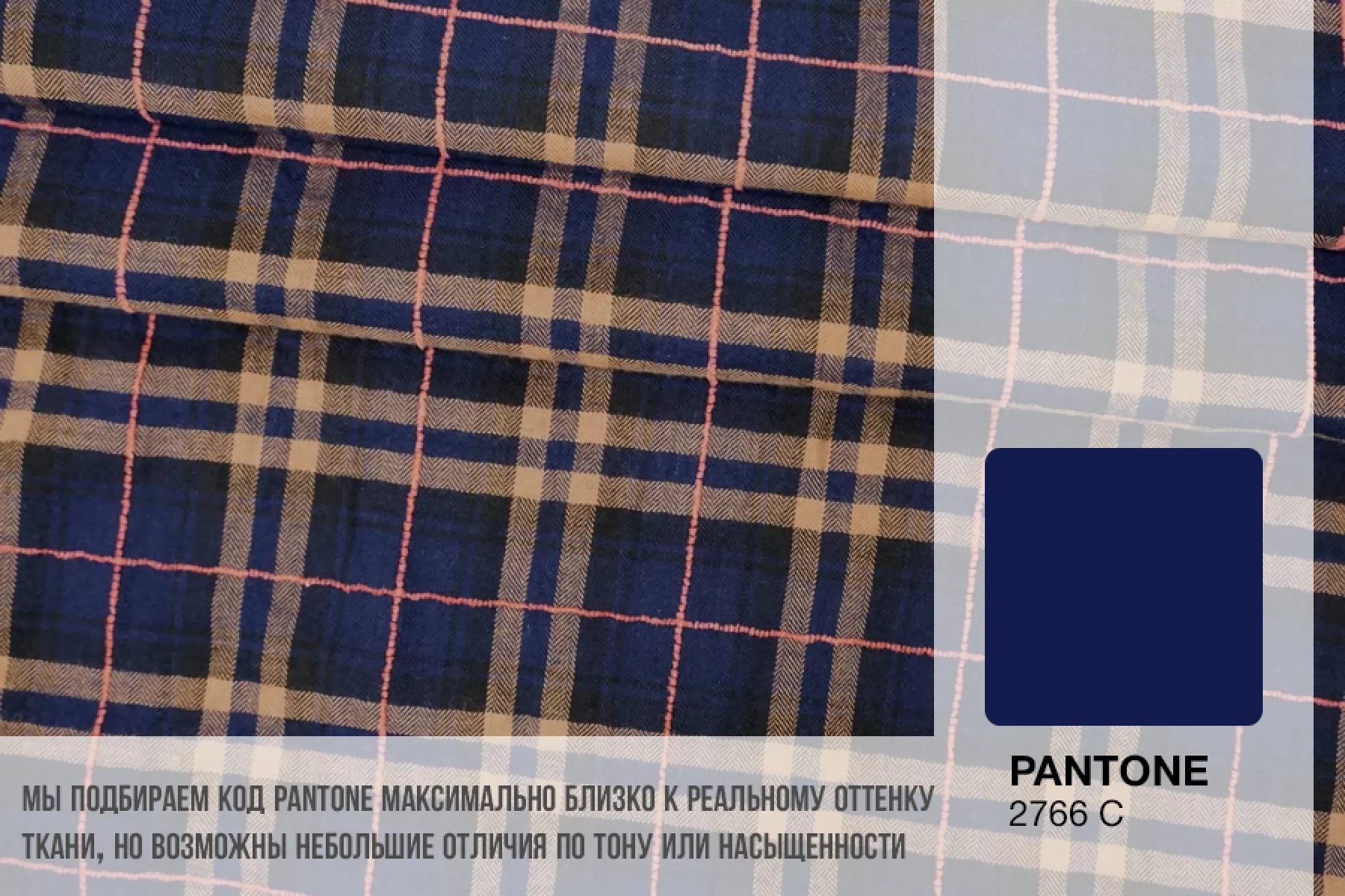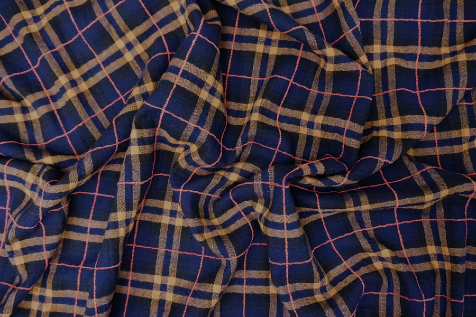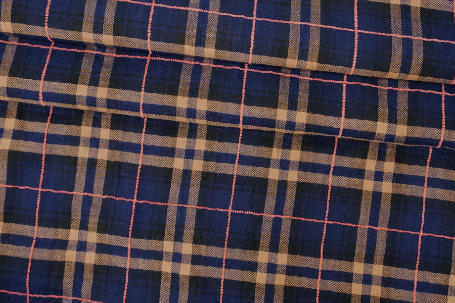 Отличный рубашечный хлопок от Palm Angels в клетку темно-синего цвета с бежевым и объёмный вплетением коралловой нити. Тактильно мягкий, немного рыхловатый, тонкий, приятный. Не тянется. Сминается. Слегка просвечивает силуэт, если смотреть на просвет. Отлично драпируется и неплохо держит форму. Вариант на рубашки, юбки, платья и не только.