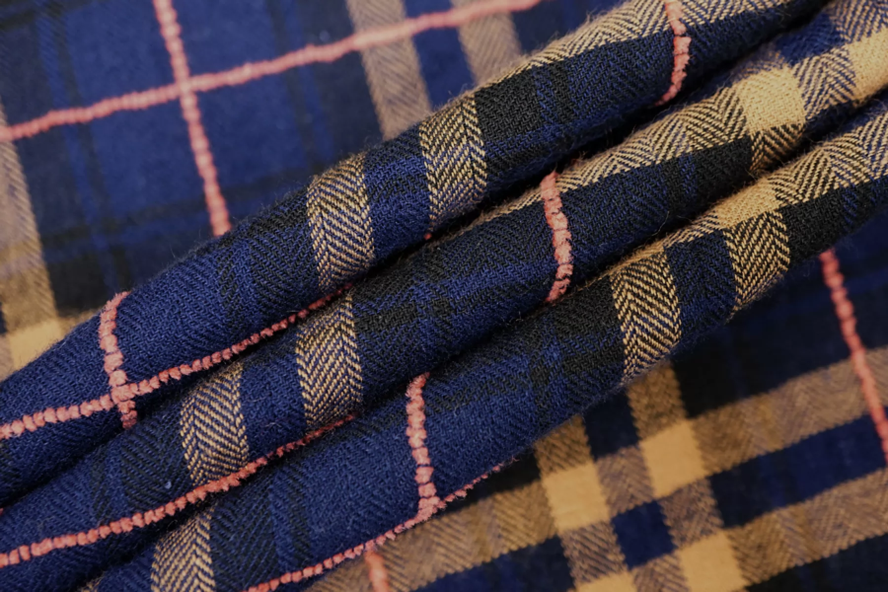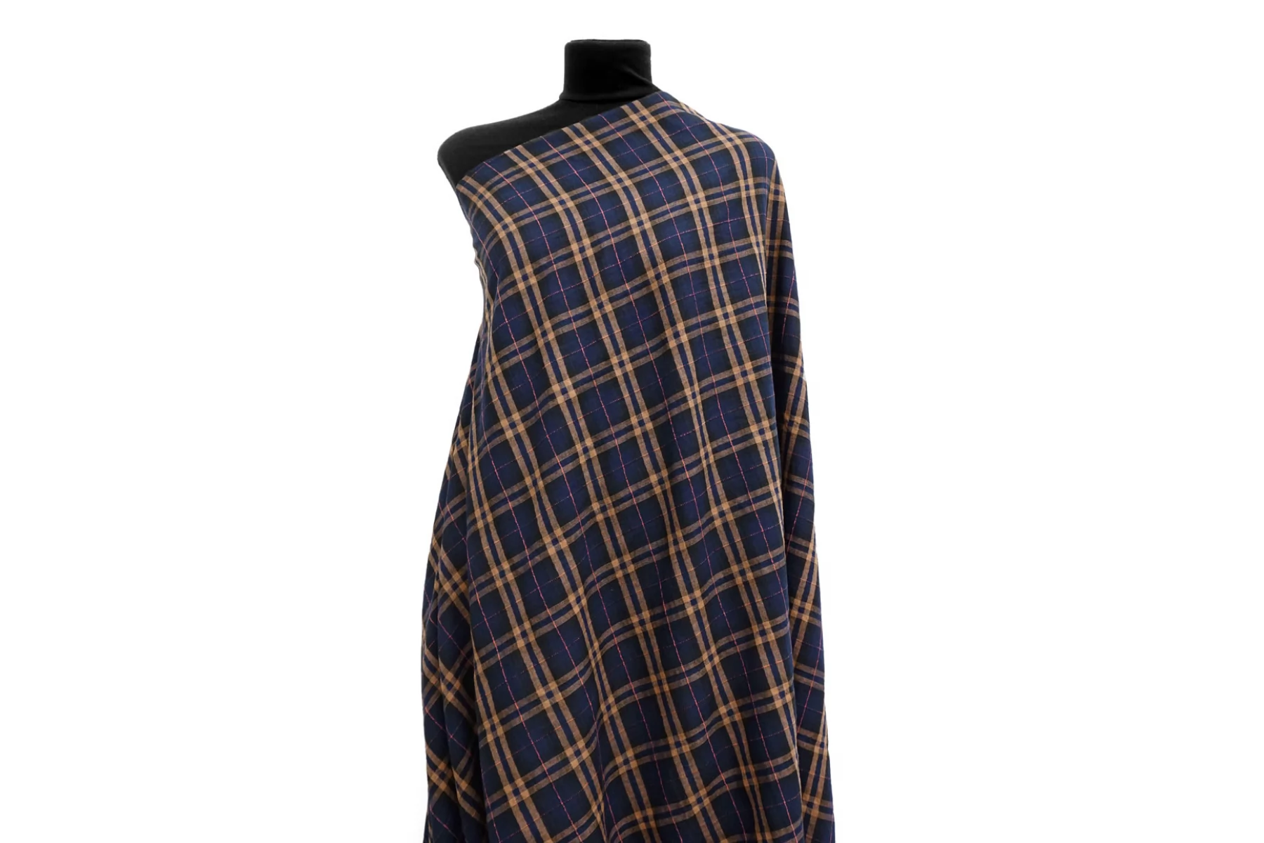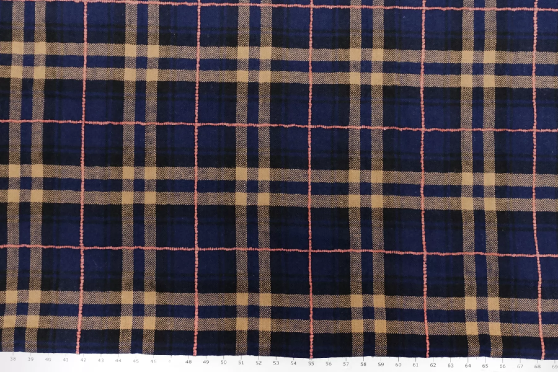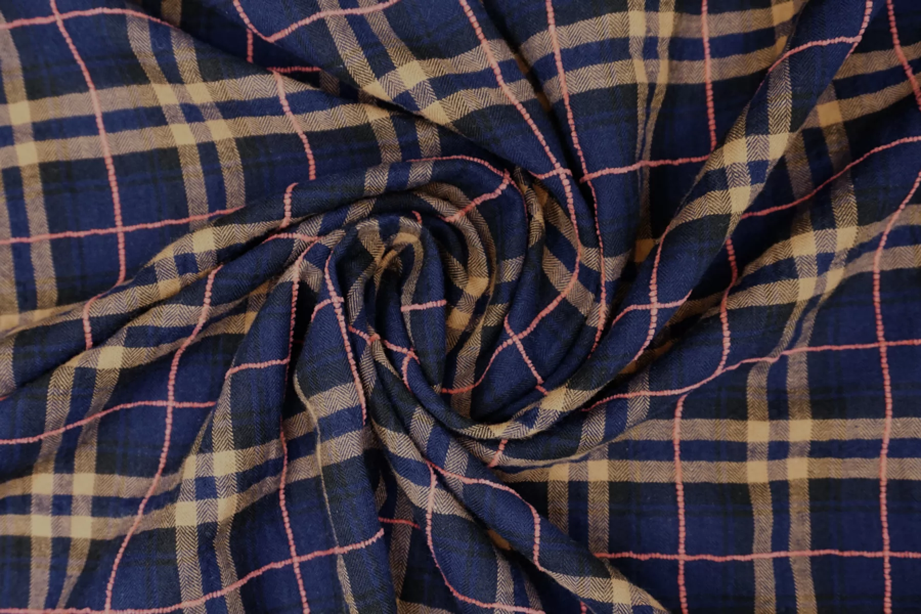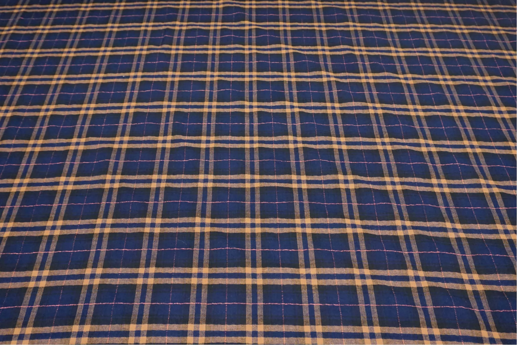 Отличный рубашечный хлопок от Palm Angels в клетку темно-синего цвета с бежевым и объёмный вплетением коралловой нити. Тактильно мягкий, немного рыхловатый, тонкий, приятный. Не тянется. Сминается. Слегка просвечивает силуэт, если смотреть на просвет. Отлично драпируется и неплохо держит форму. Вариант на рубашки, юбки, платья и не только.