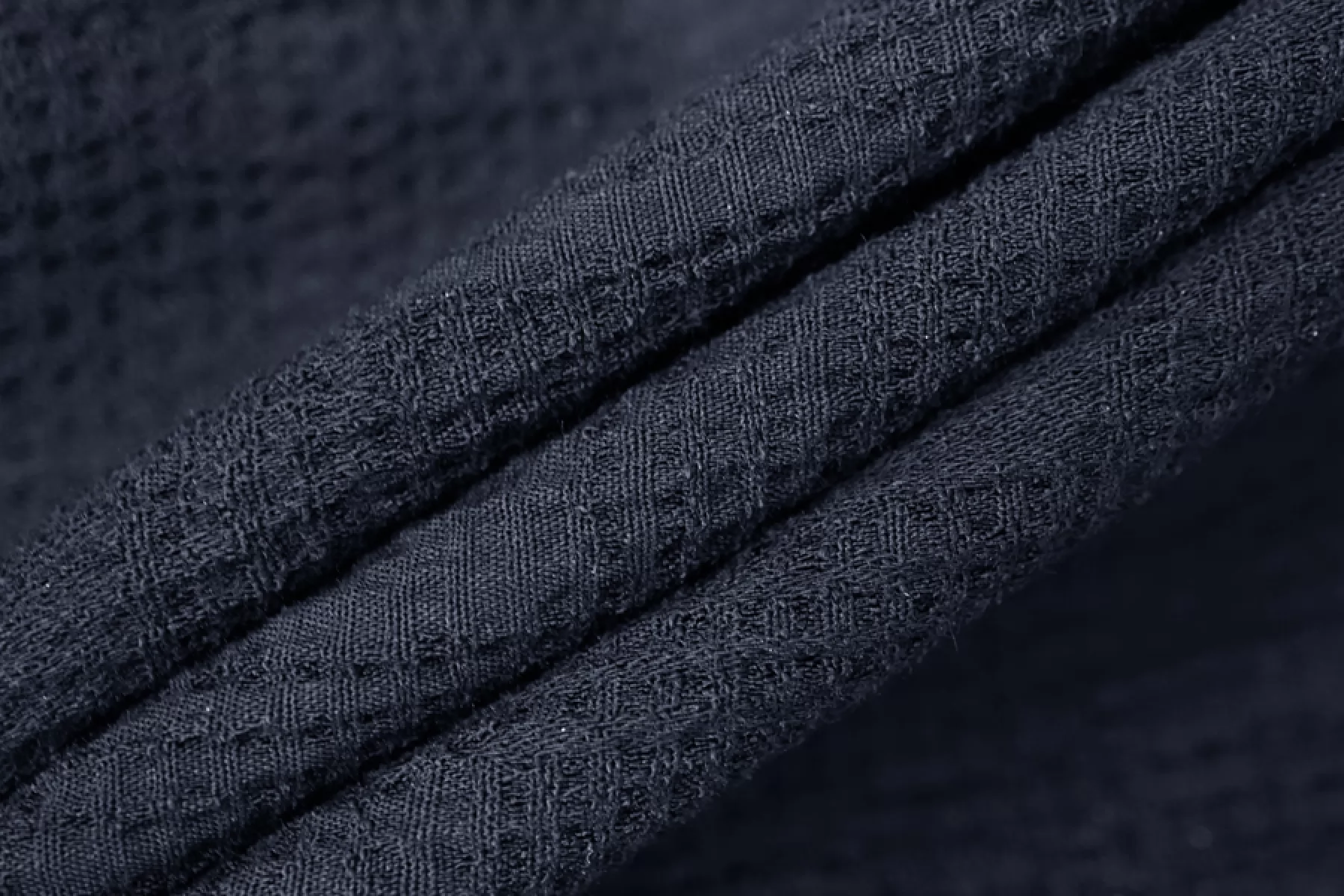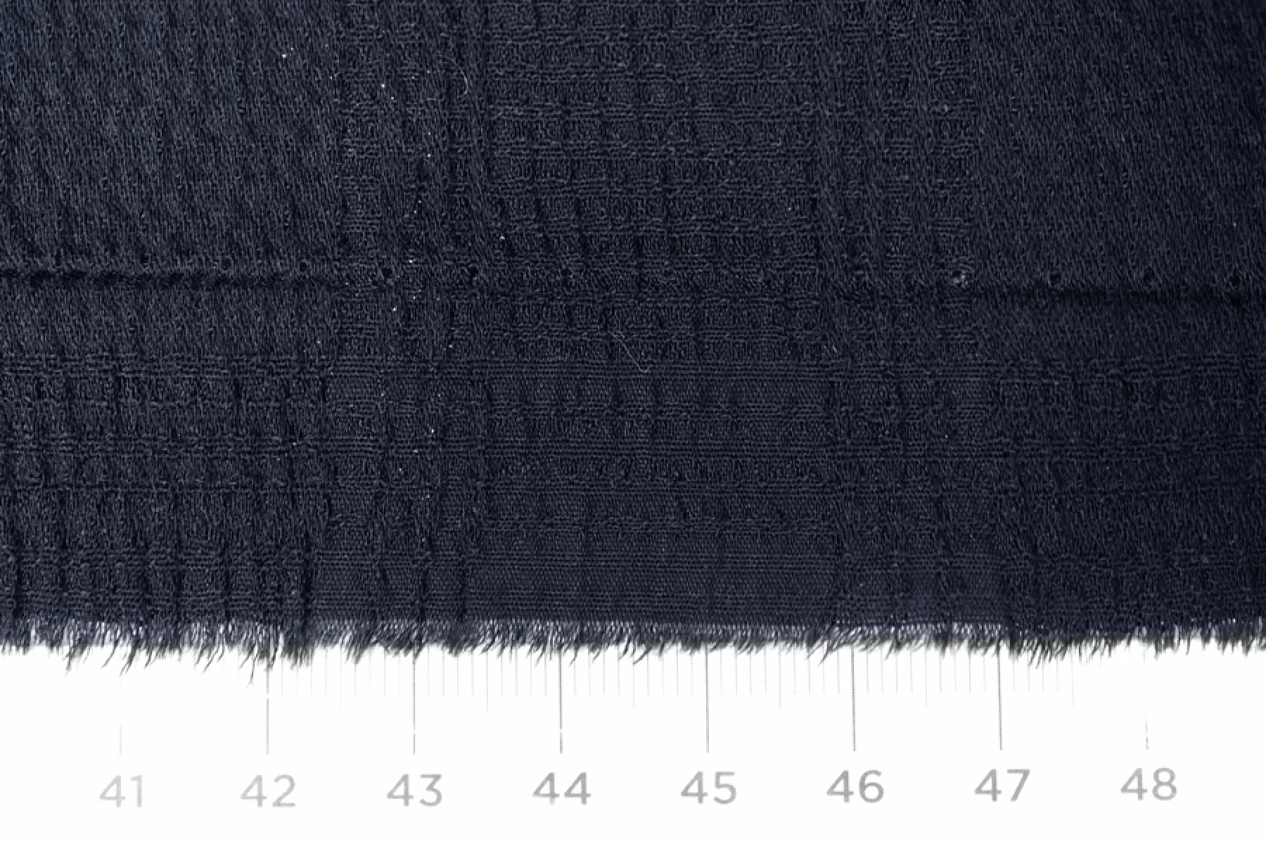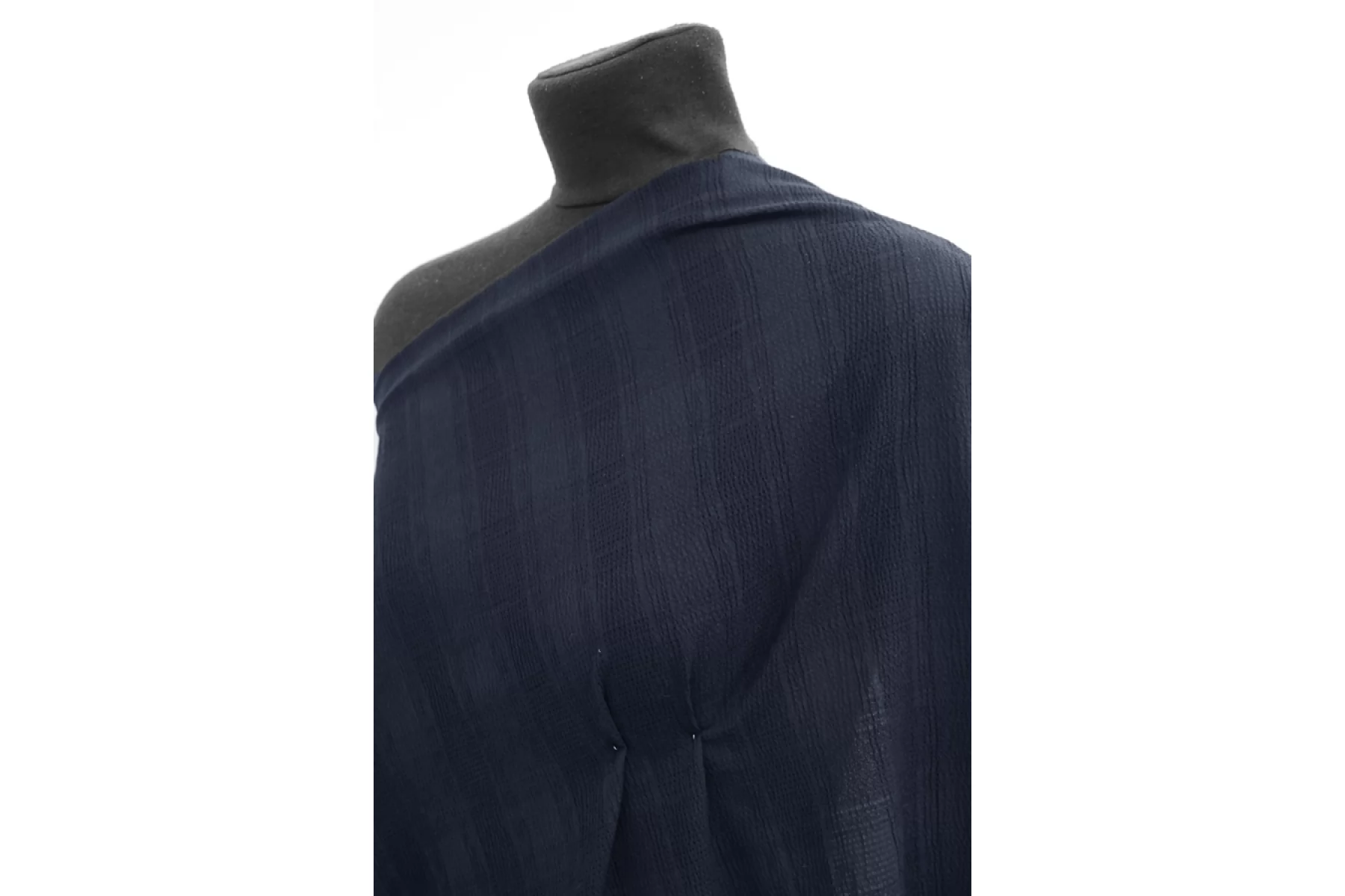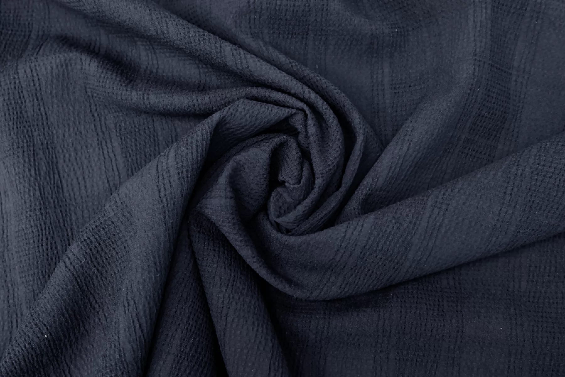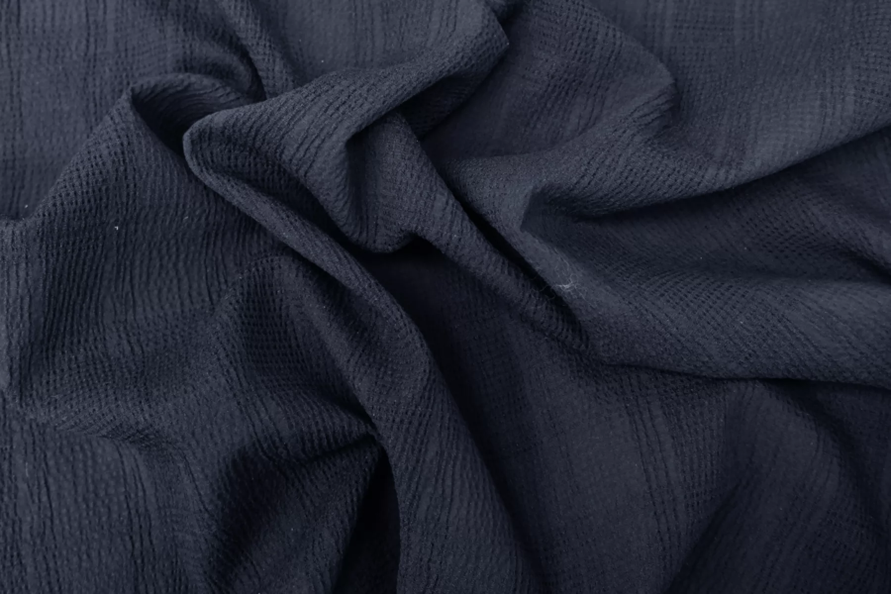 Итальянский рубашечный хлопок-сирсакер очень темного синего цвета, жатость в виде клеток. Тонкий, плотный, чувствуется фактура наощупь. Хорошо тянется. Форму держит совсем немного, не сминается, немного просвечивает. Подойдет для пошива платья, рубашки, юбки. Учитывайте усадку материала.