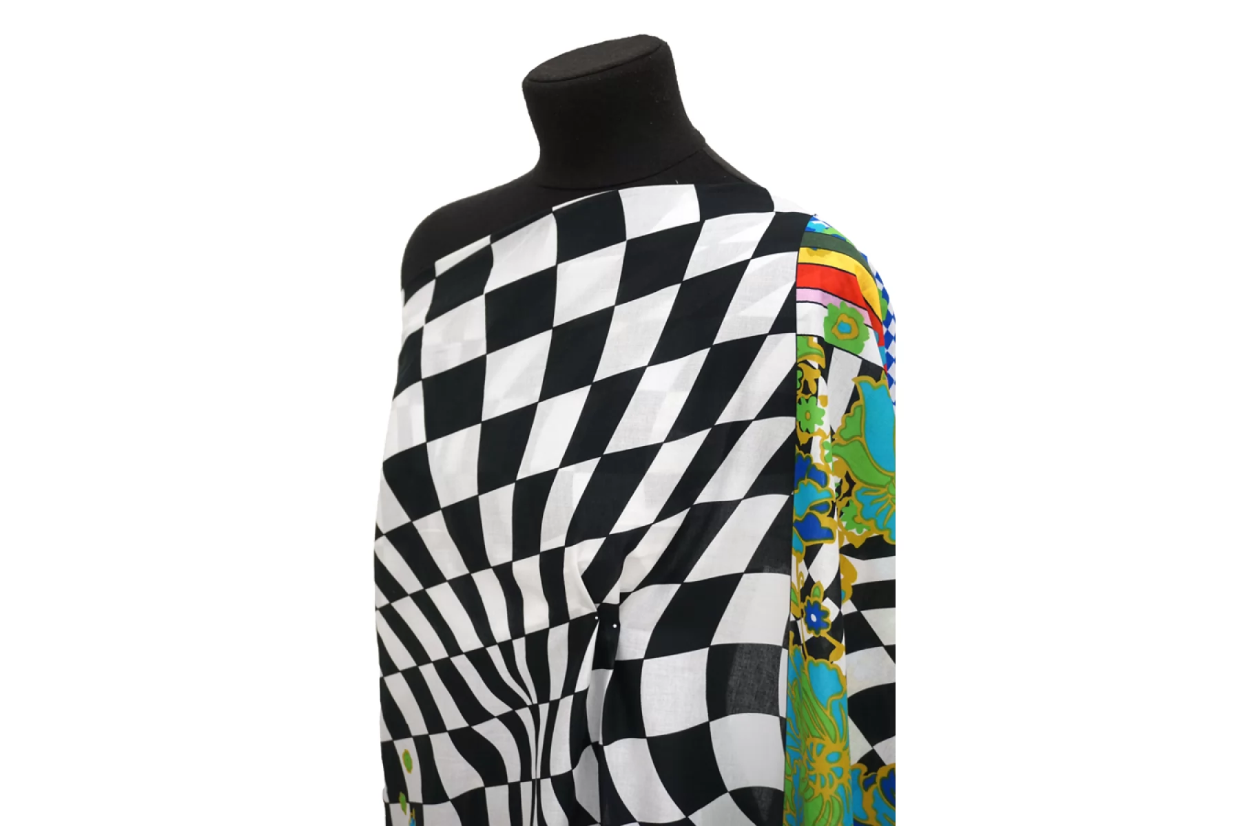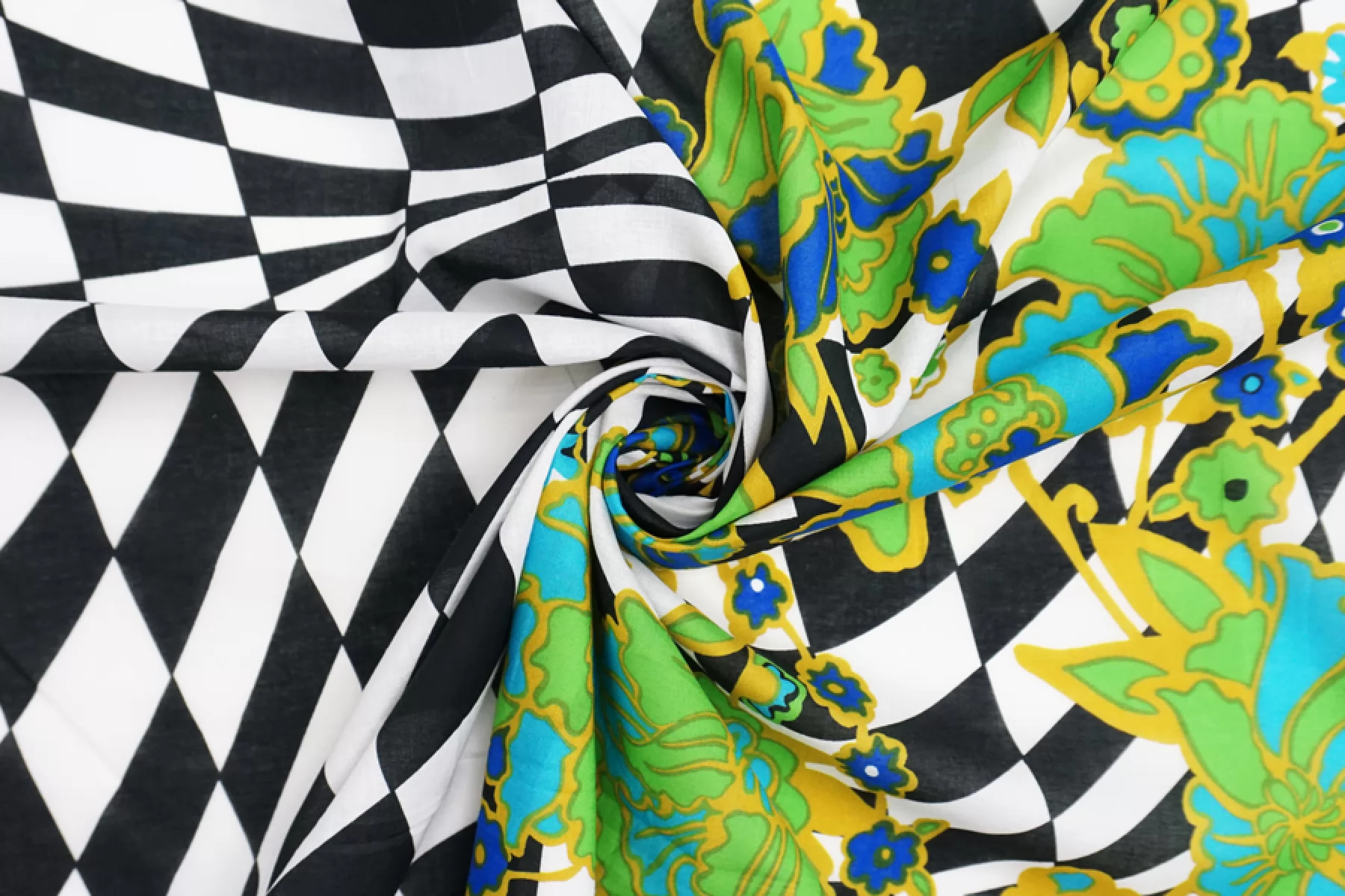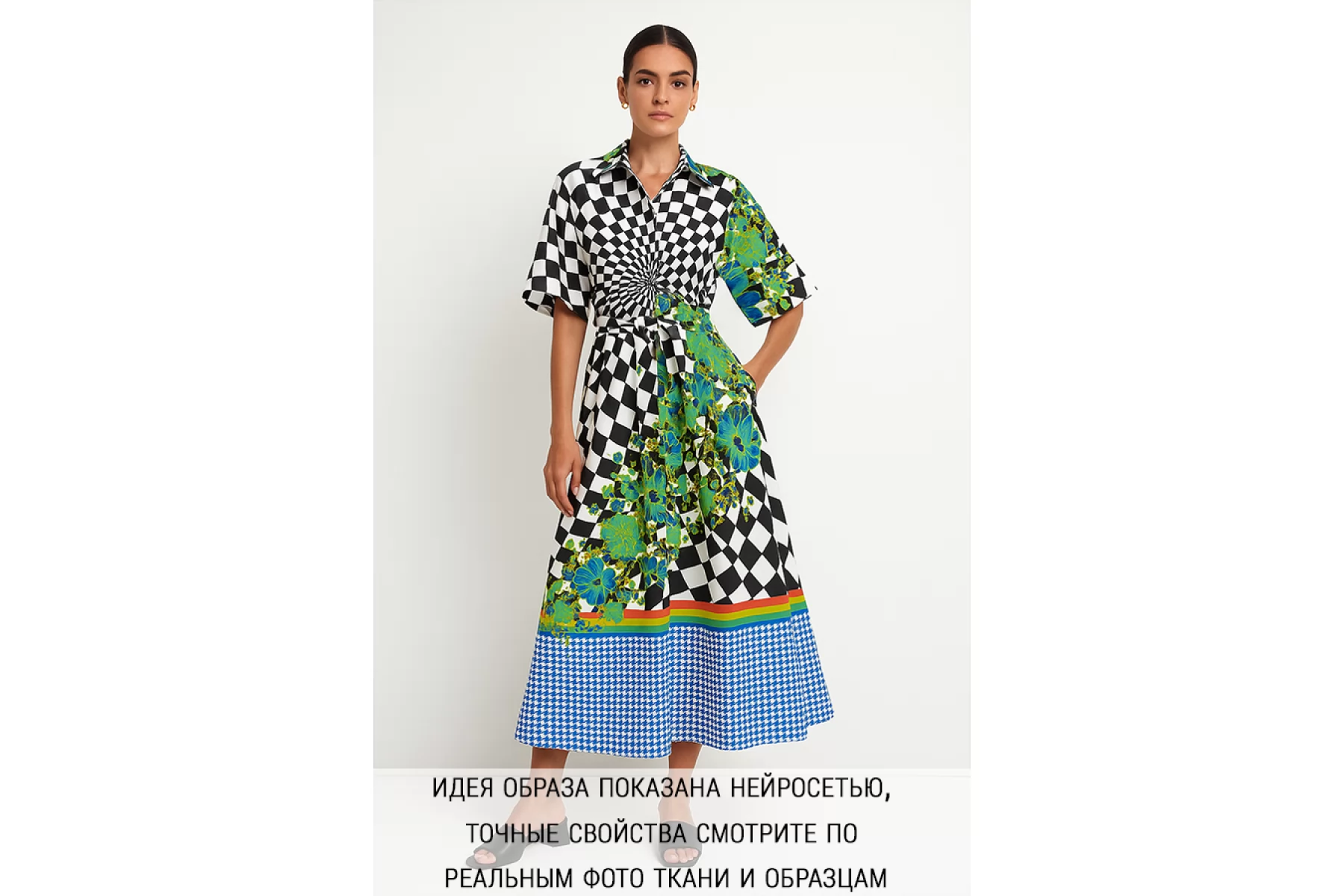 Тонкий рубашечный хлопок Max Mara с оригинальным абстрактным принтом в черно-белую клетку с зелено-синими цветами. Принт купонный! Размер купона 155 см. Материал тактильно приятный, гладкий и легкий. Немного просвечивает. Мнется. Хорошо держит форму и драпируется. Отлично подойдет на легкие летние рубашки, платья, сарафаны и юбки. При необходимости используйте подкладочный материал.