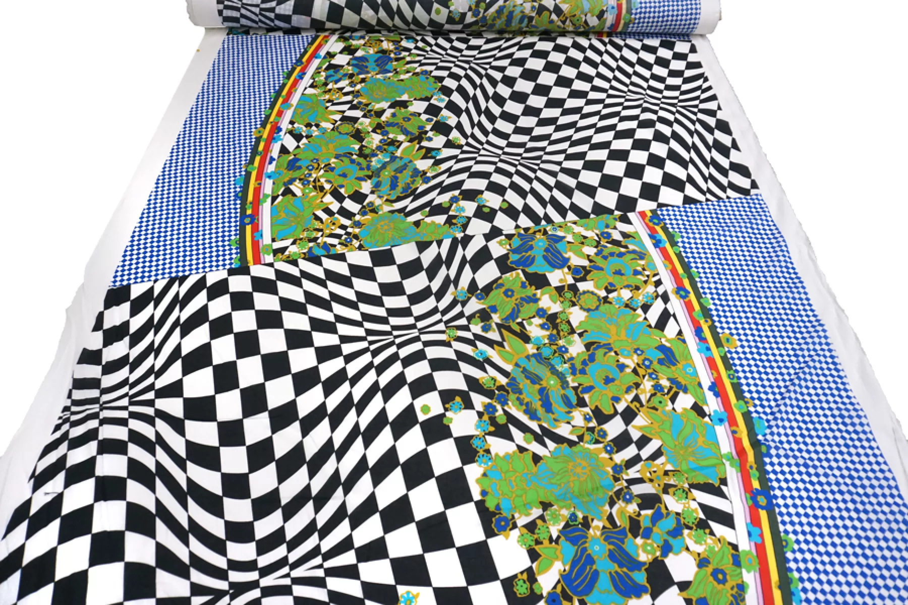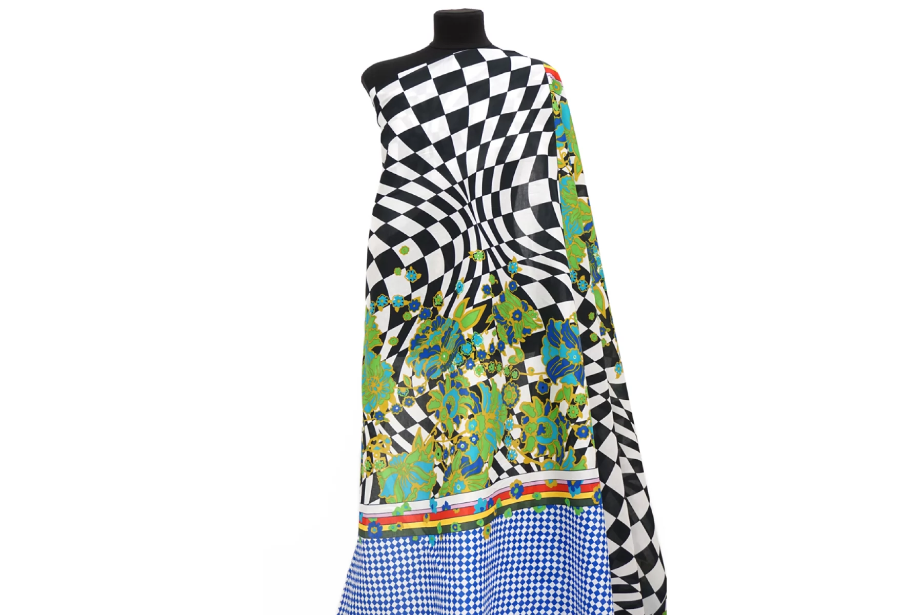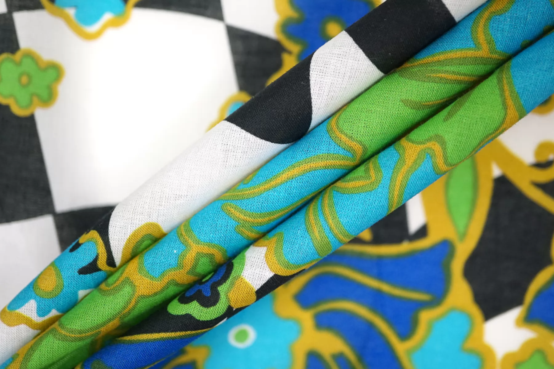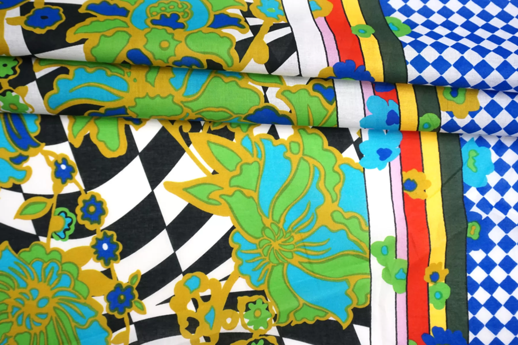 Тонкий рубашечный хлопок Max Mara с оригинальным абстрактным принтом в черно-белую клетку с зелено-синими цветами. Принт купонный! Размер купона 155 см. Материал тактильно приятный, гладкий и легкий. Немного просвечивает. Мнется. Хорошо держит форму и драпируется. Отлично подойдет на легкие летние рубашки, платья, сарафаны и юбки. При необходимости используйте подкладочный материал.