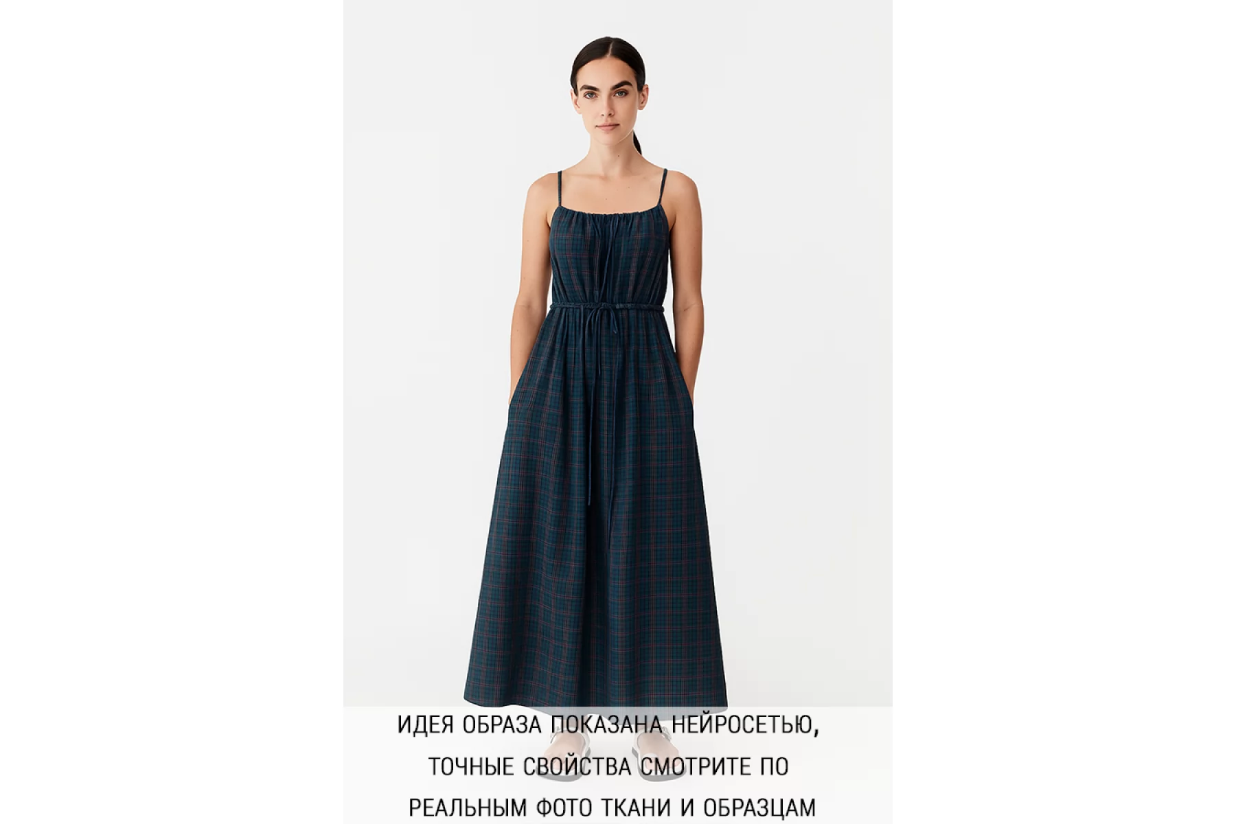 Тонкий батист из хлопка в среднего размера клетку приглушенного зелено-синего оттенка. Материал тактильно очень приятный, мягкий, гладкий и легкий. Просвечивает. Мнется. Хорошо держит форму и драпируется. Немного тянется, благодаря эластану. Отлично подойдет на легкие летние рубашки, платья, сарафаны и юбки. При необходимости используйте подкладочный материал.