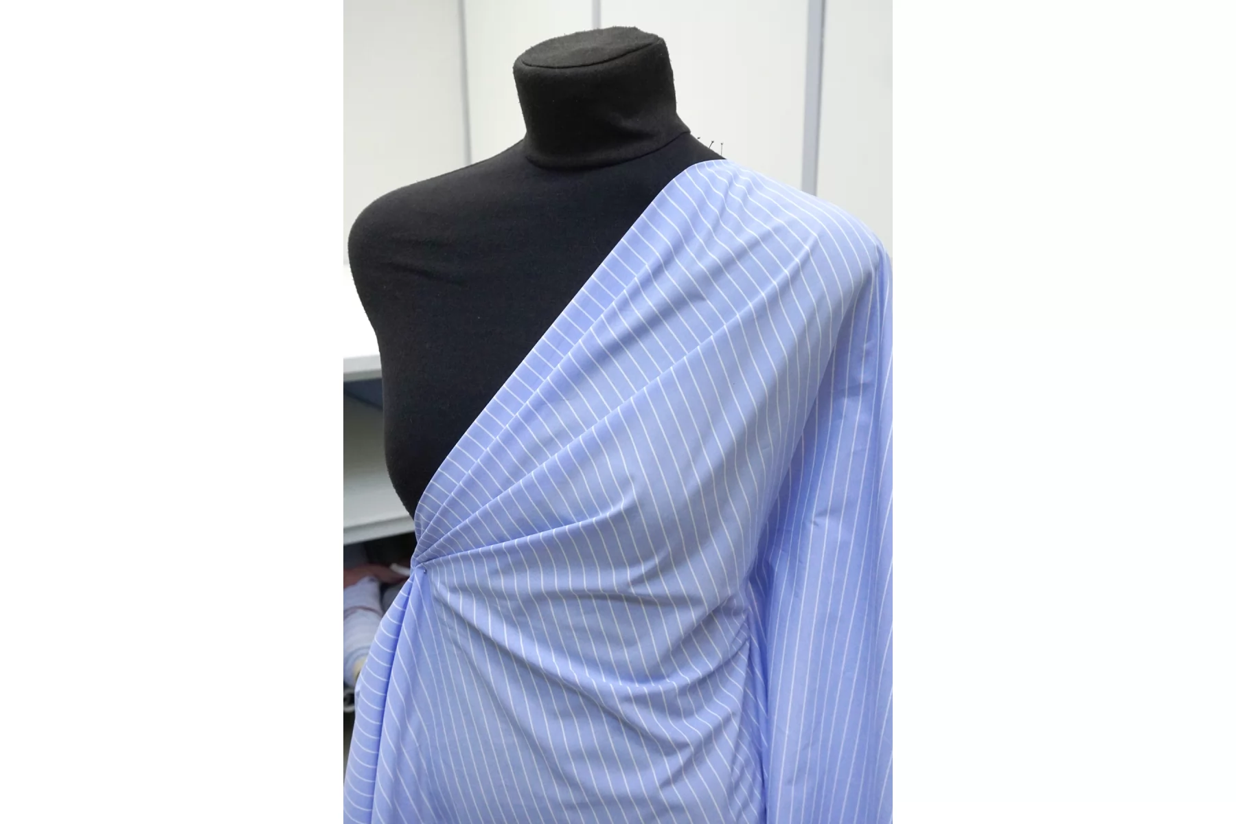Итальянский хлопок от рубашечной плотности, в полоску из нитей голубого и белого цвета. Материал гладкий, мягкий, тонкий. Немного мнется. Немного просвечивает силуэт в один слой, не тянется. Пластичный и немного держит форму. Прекрасный вариант на рубашки, юбки, платья. Материал дает усадку.