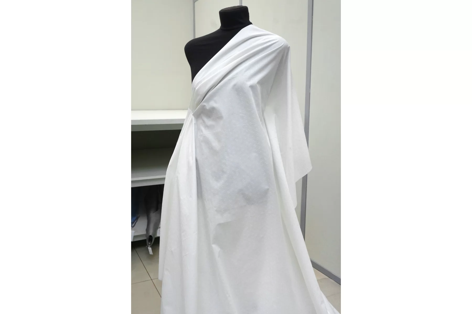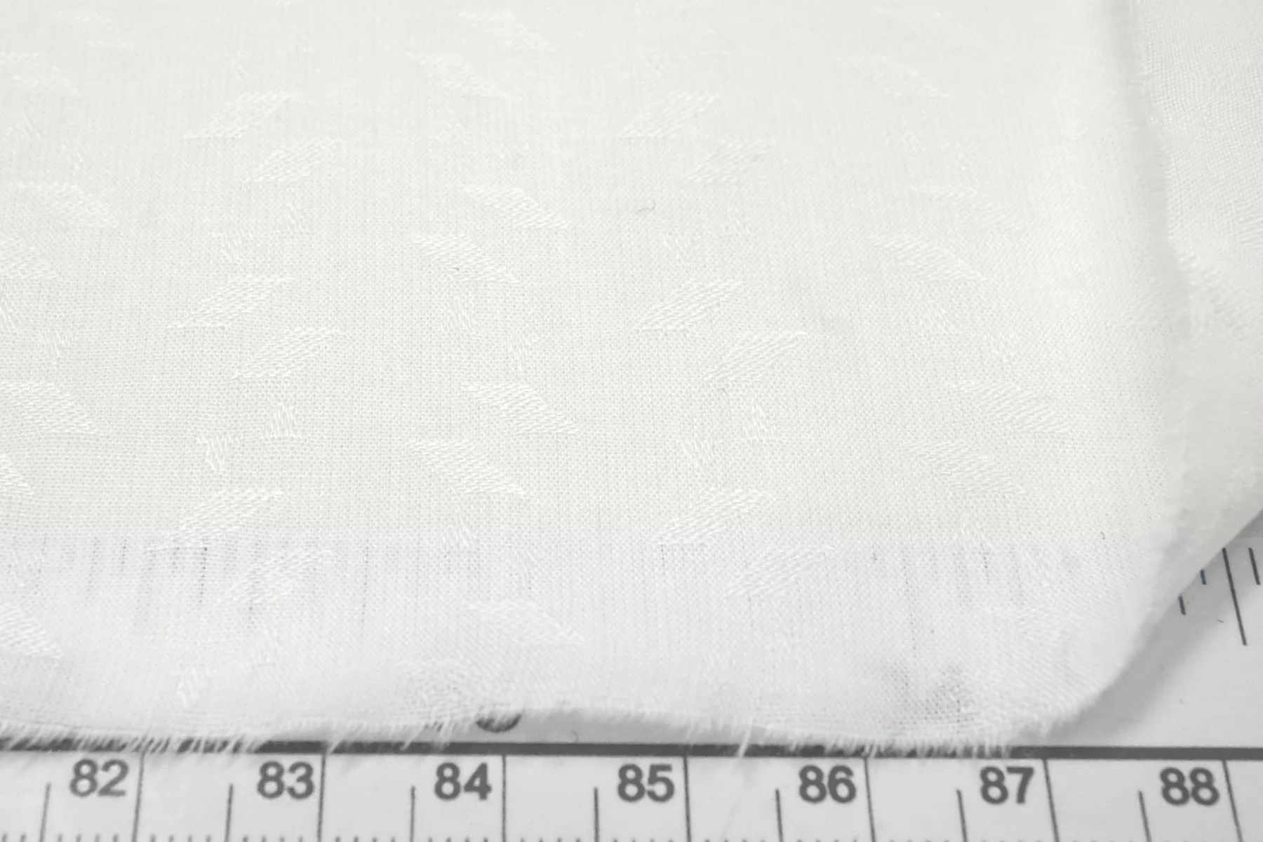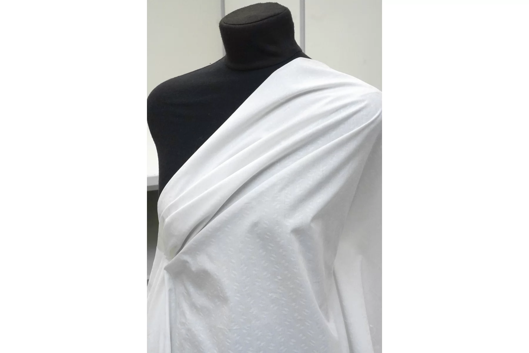 Отличного качества рубашечный жаккардовый хлопок белого цвета. Присутствует жаккардовая выработка. Приятный и мягкий наощупь, гладкий и шелковистый. Материал пластичный, держит форму. Просвечивает, не тянется. Сминается. Идеальный вариант для рубашки, сарафана. Учитывайте усадку материала на 7-10%.