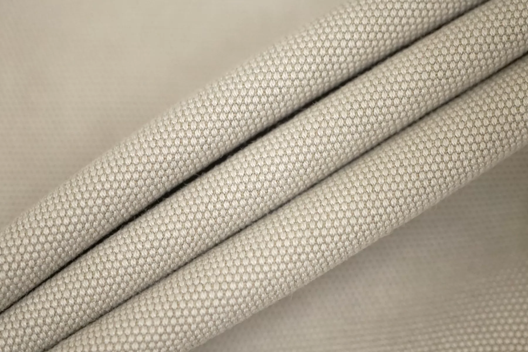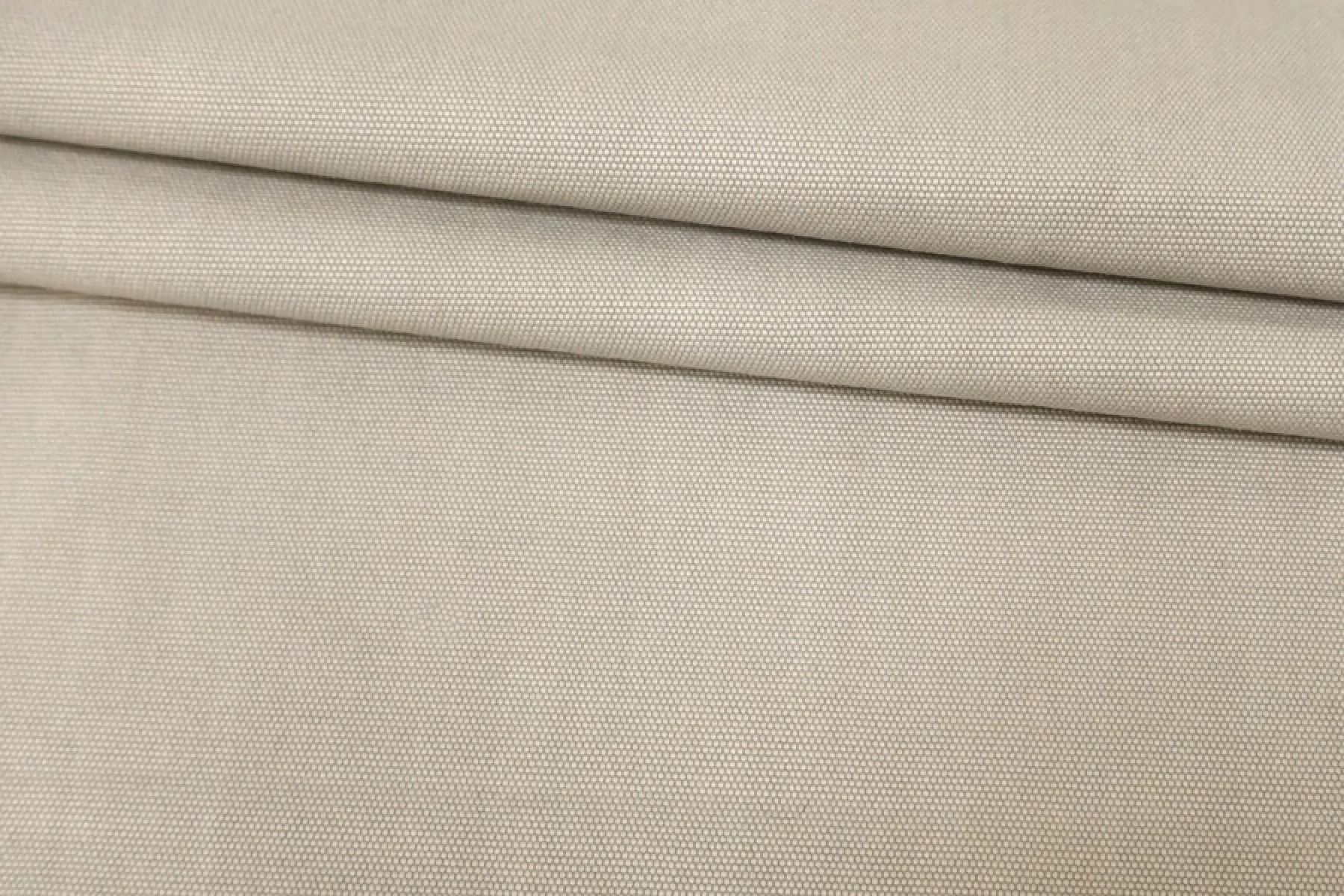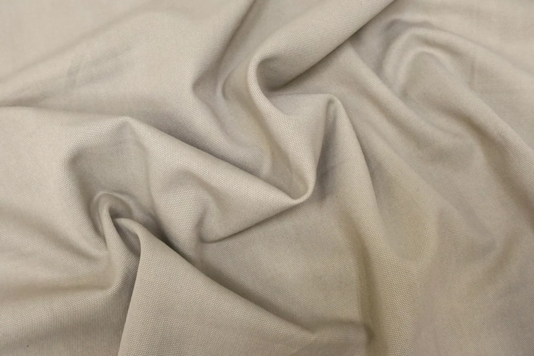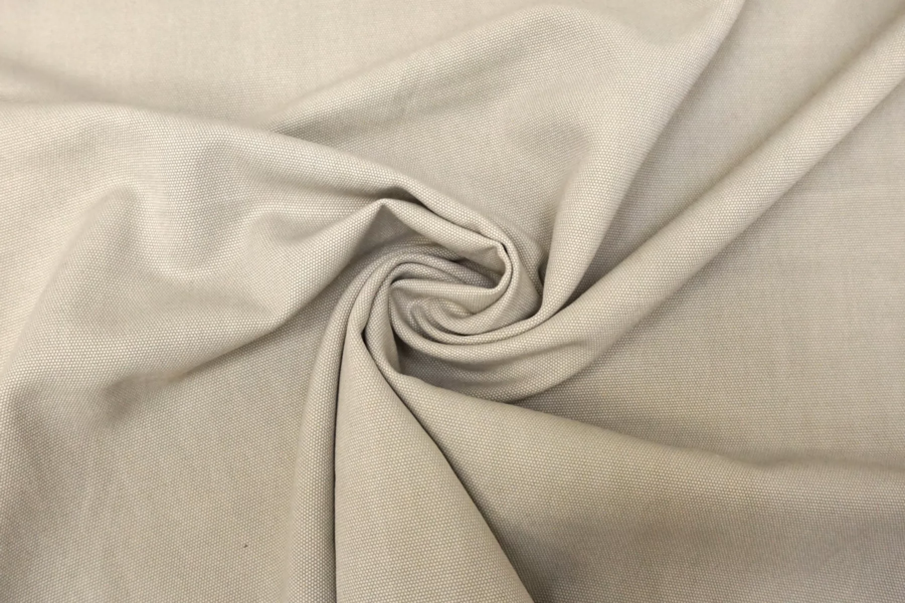 Фактурный хлопок с добавлением купры, в сером цвете с бежевым подтоном. Плетение напоминает канвас. Материал костюмно-плательной плотности, приятный и мягкий тактильно. Пластичный но при этом держит форму. Мнется, не тянется, не просвечивает. Отлично подойдет для пошива летних костюмов, брюк, юбок, платьев.