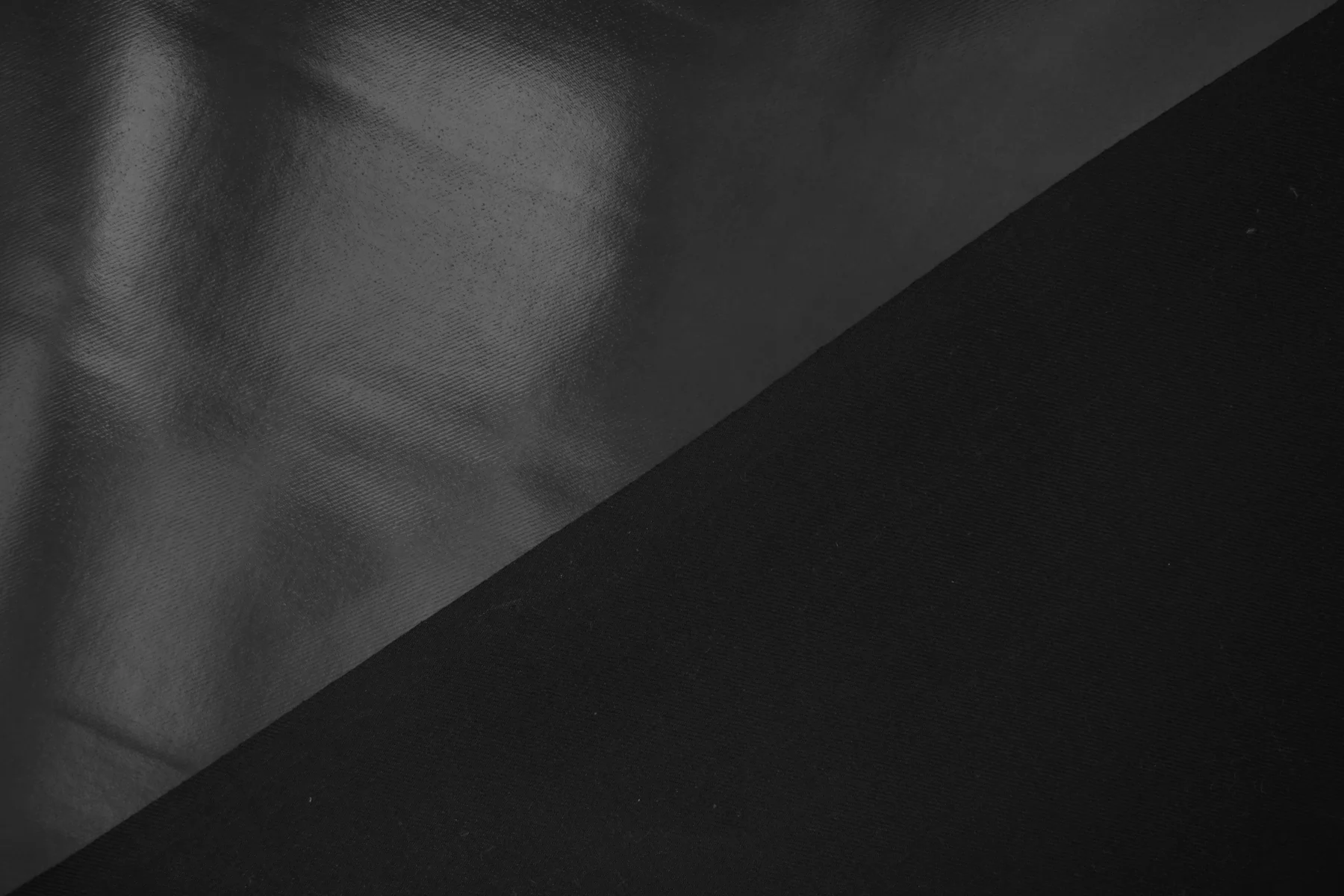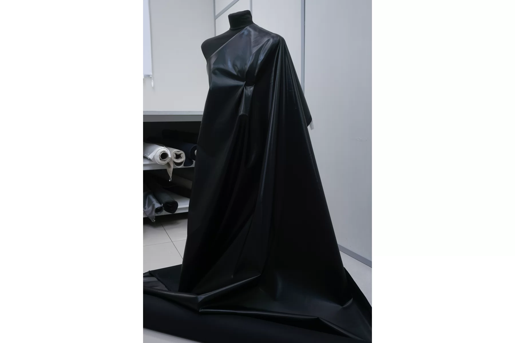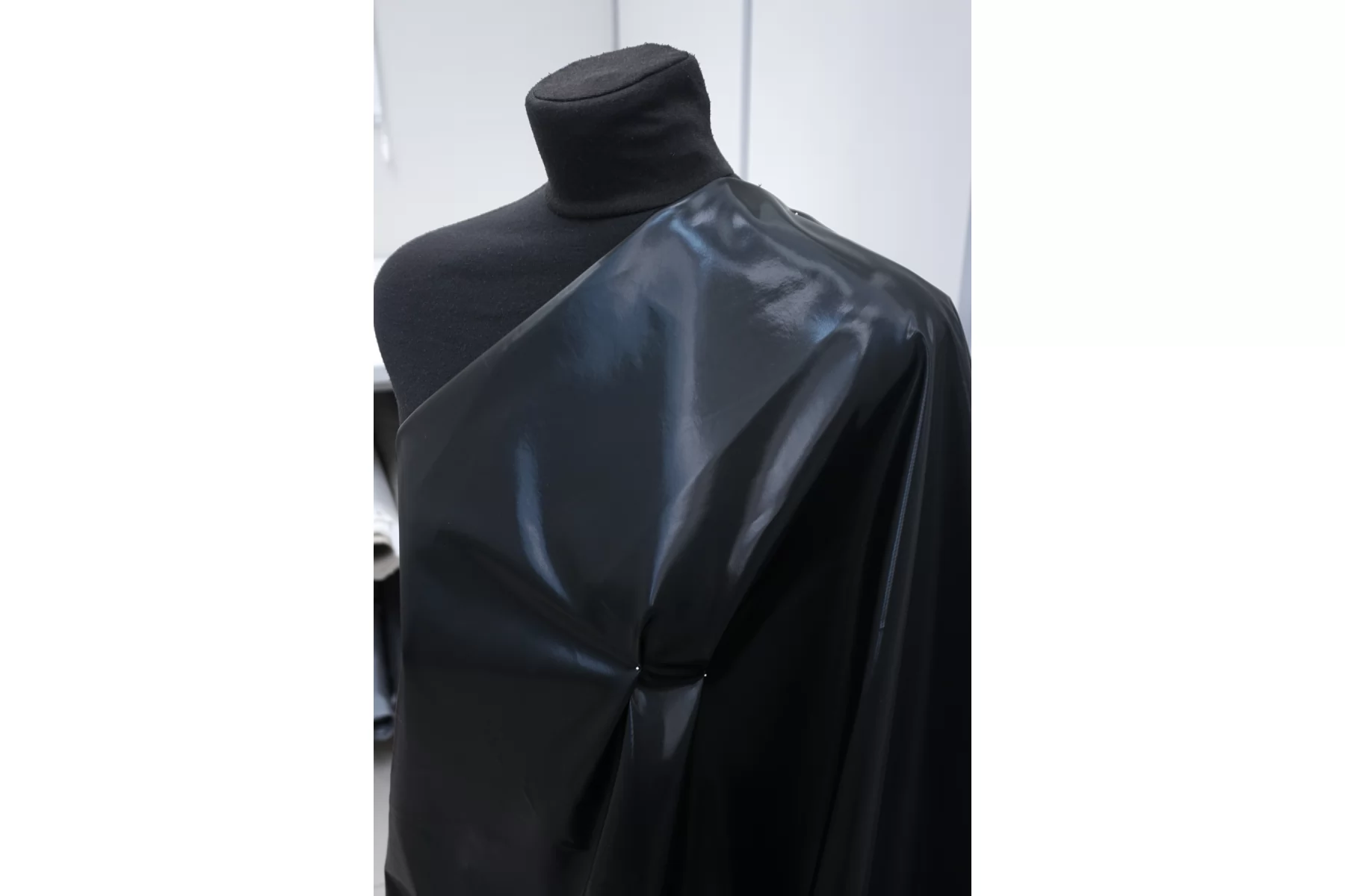 Интересный хлопок чёрного цвета с чёрным полиуретановым покрытием, визуально близким к лаке. Покрытие не промокает, не продувается. Не тянется, хорошо держит форму. Не мнется, не просвечивает. Шьем тренч, жакет, куртку, плащ.