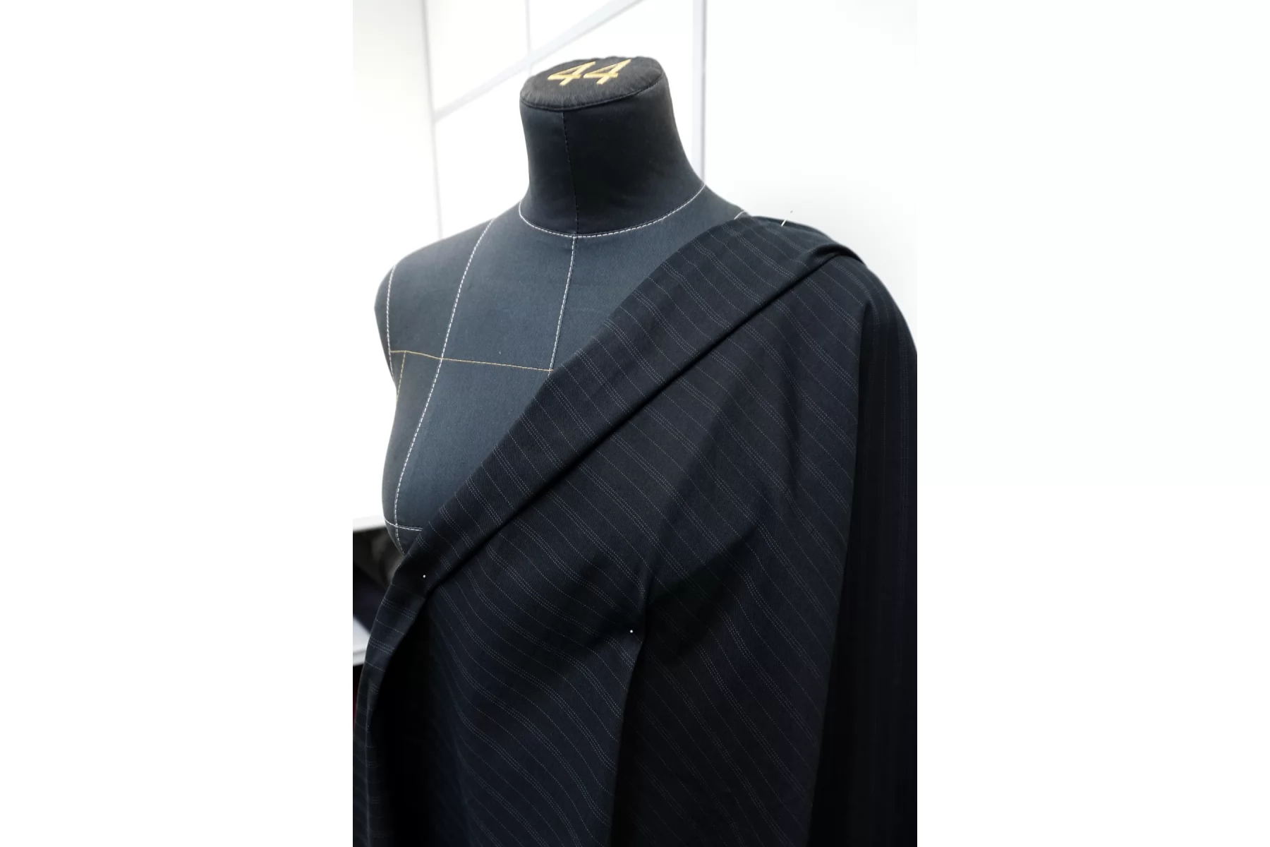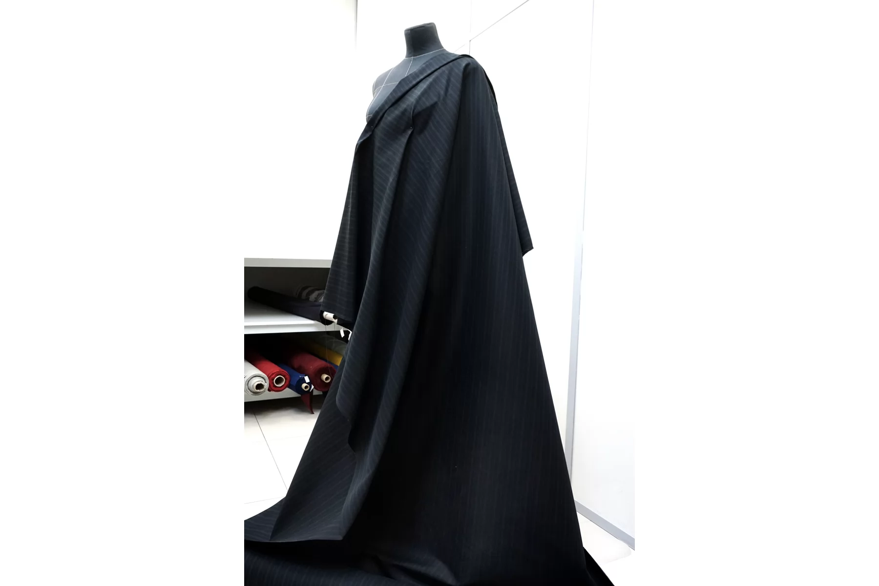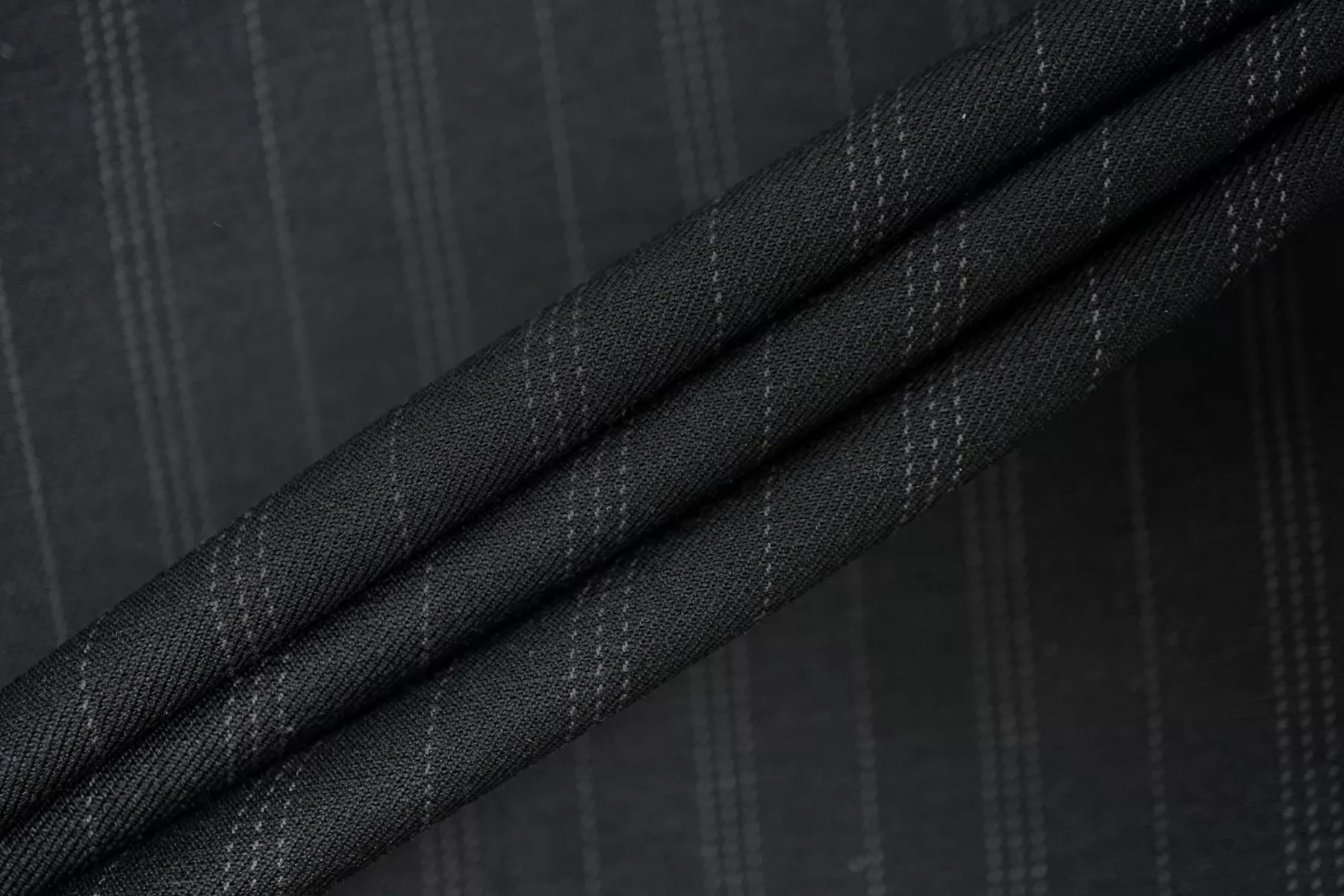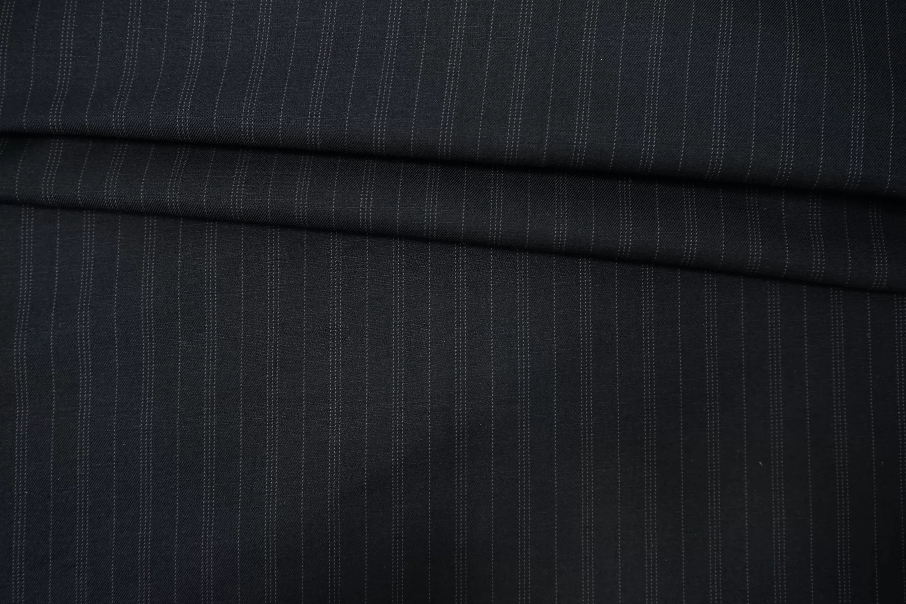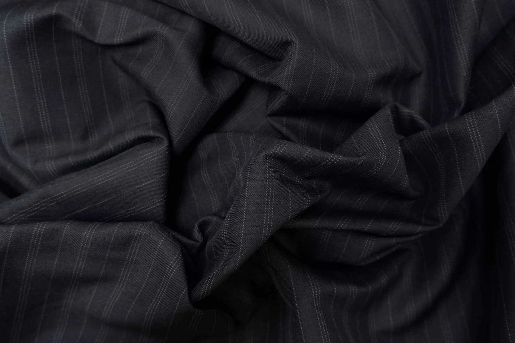 Итальянский костюмный хлопок с добавлением шелка, нити чёрного и синевато-чёрного цвета, тонкая полоска серого цвета. Приятный тактильно. Не тянется. Не просвечивает. Держит форму, средний по пластичности. Слегка мнется. Отличный вариант на летние костюмы, юбки, платья (учитывайте отсутствие эластана).