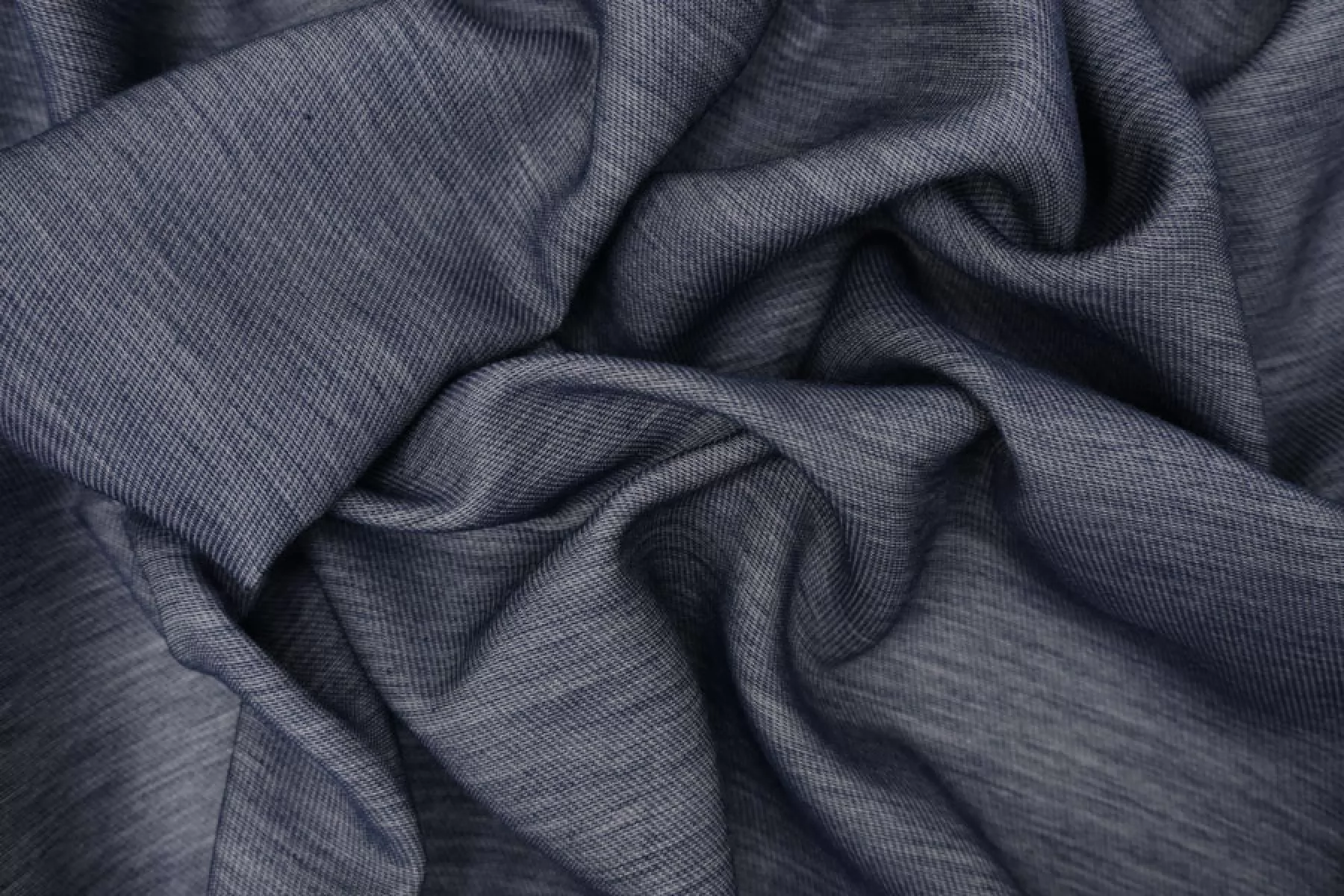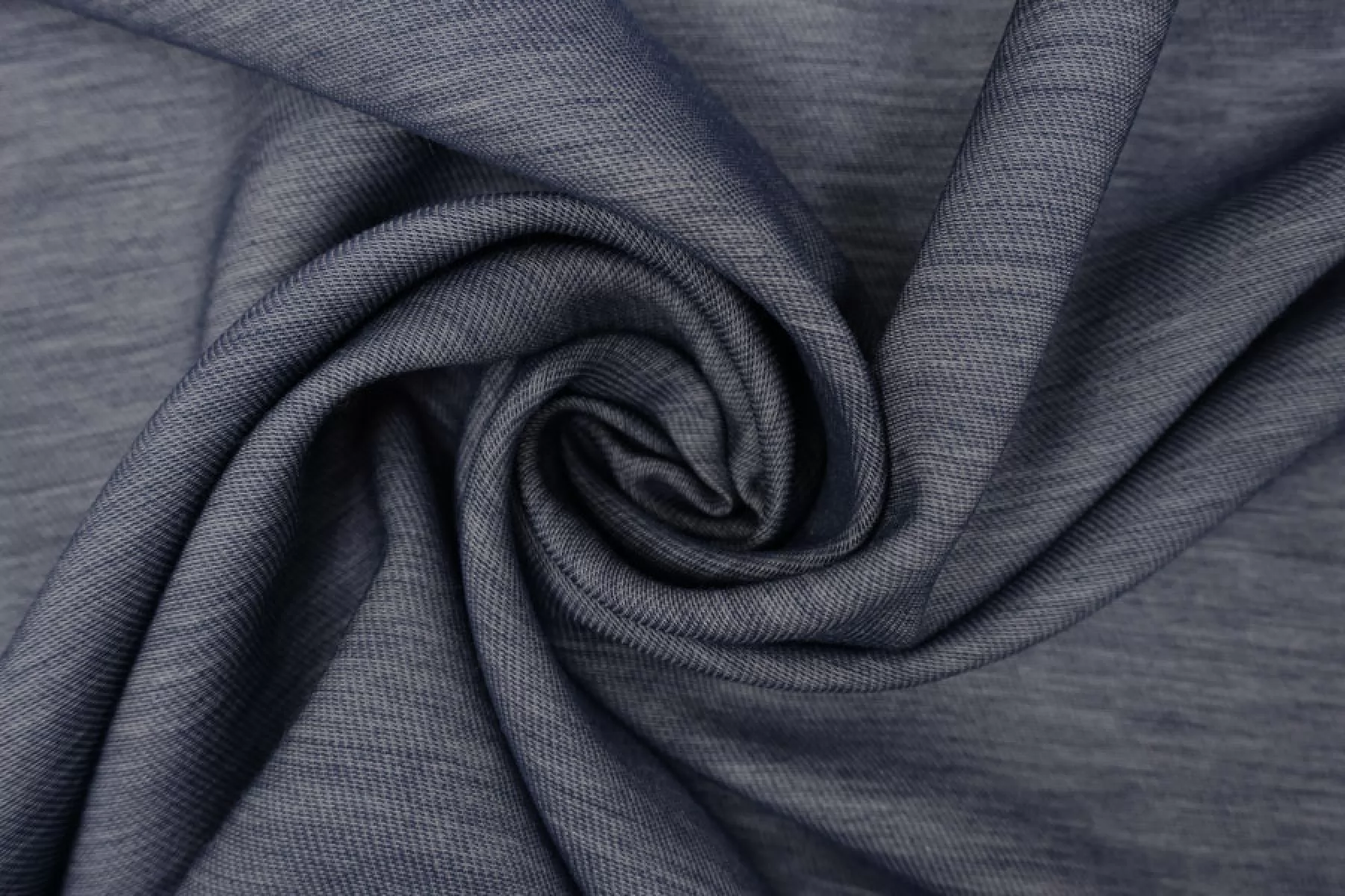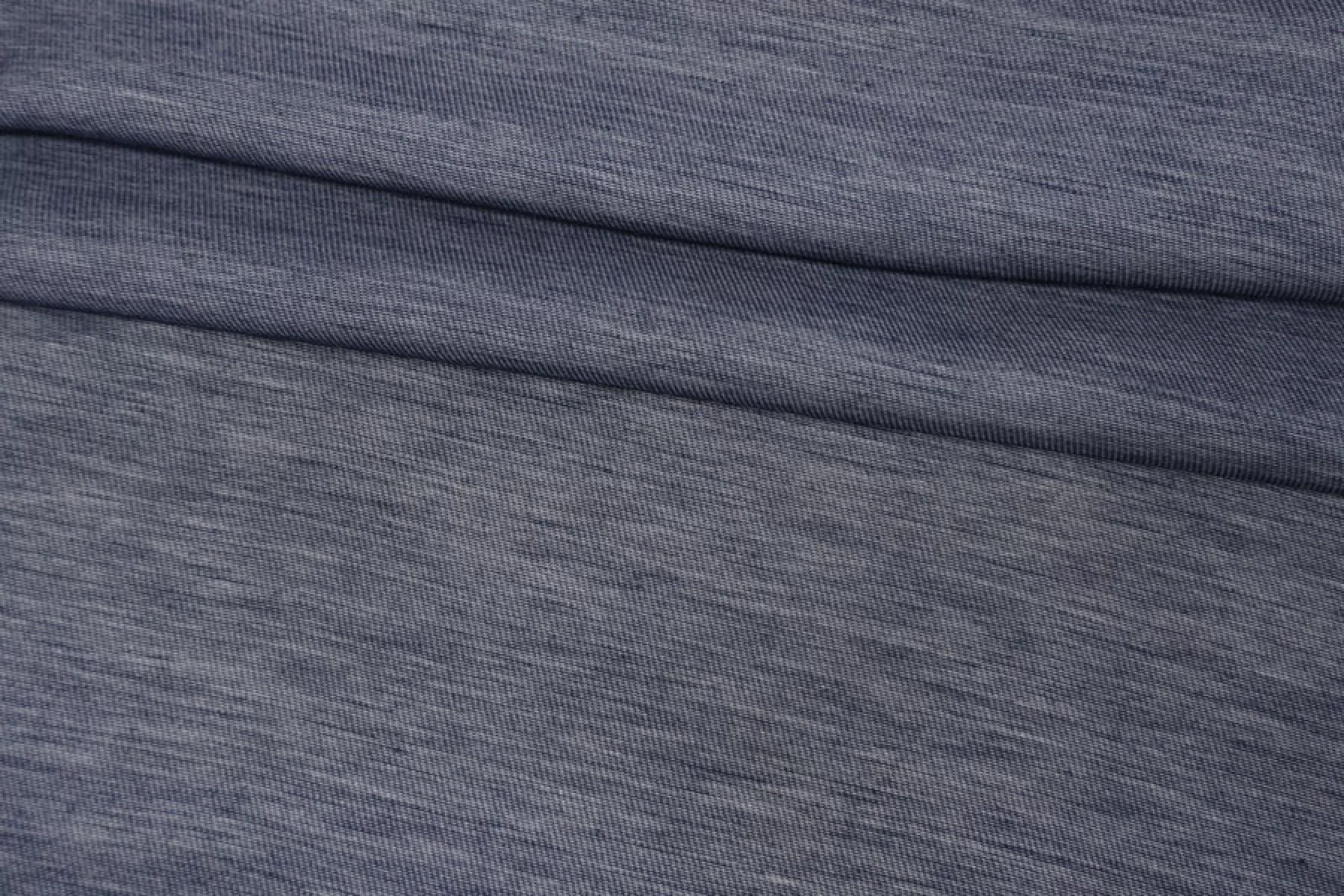 Интересный хлопок на шелке, из нитей темно-синего и белого цвета, с диагональным плетением. По пластике немного упругий (напоминает ткани на капроне), тактильно шероховатый. Немного просвечивает, мнется средне. Отличный вариант для летнего изделия - платья, юбки, рубашки.