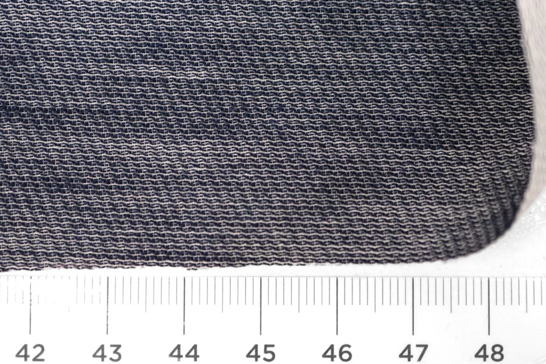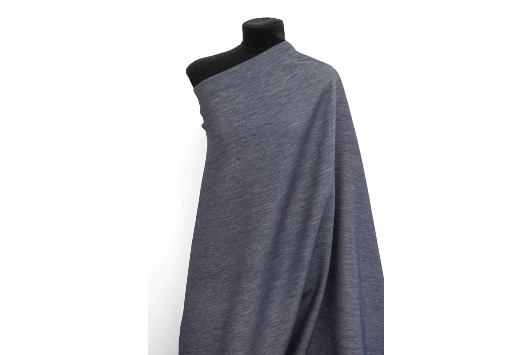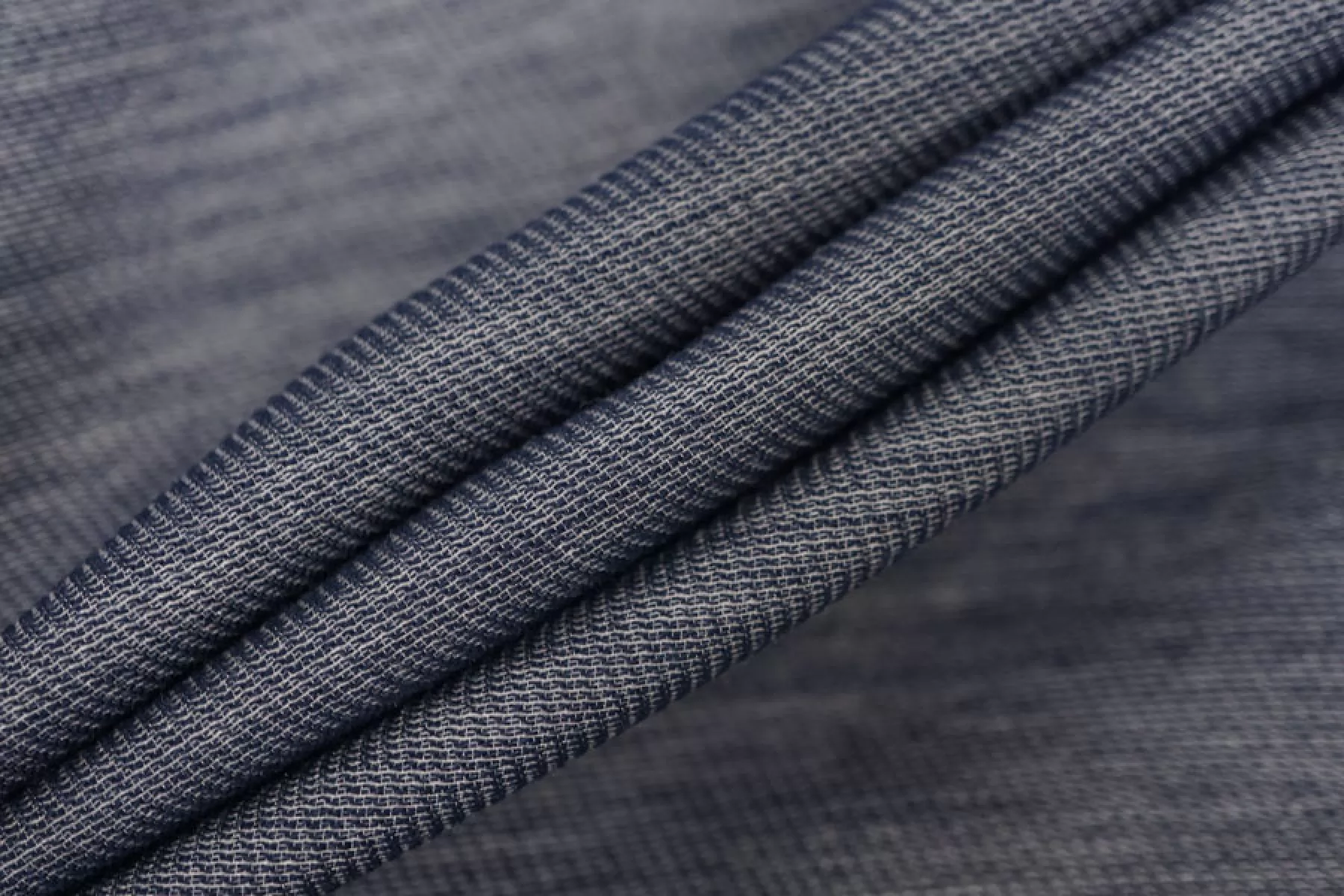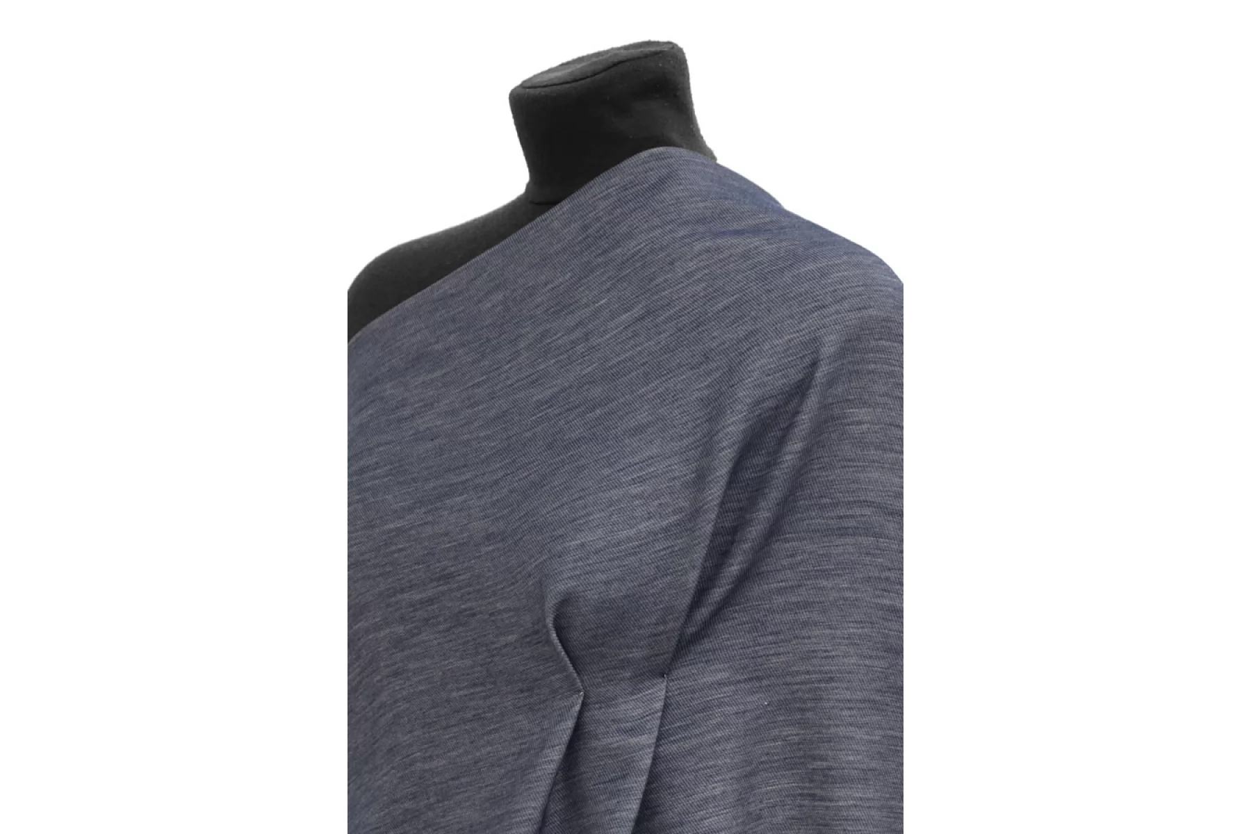 Интересный хлопок на шелке, из нитей темно-синего и белого цвета, с диагональным плетением. По пластике немного упругий (напоминает ткани на капроне), тактильно шероховатый. Немного просвечивает, мнется средне. Отличный вариант для летнего изделия - платья, юбки, рубашки.
