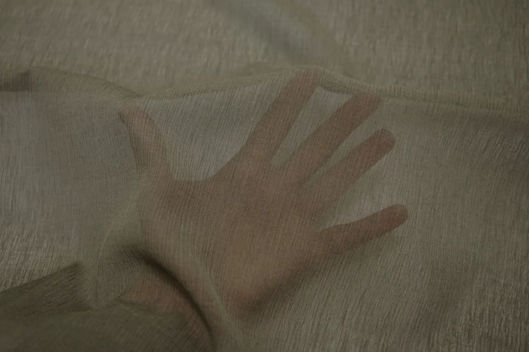 Прекрасный крепон из хлопка с шелком в зеленом оттенке хаки. Материал мягкий, креповый наощупь, обладает красивым лоском. Полупрозрачный. Пластичный, форму не держит. Немного пружинит за счет крешированной поверхности. Практически не мнется. Шьем блузки, платья, многослойные юбки и не только. Уход за материалом деликатный.