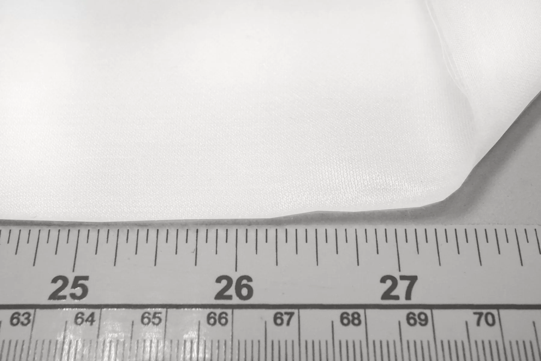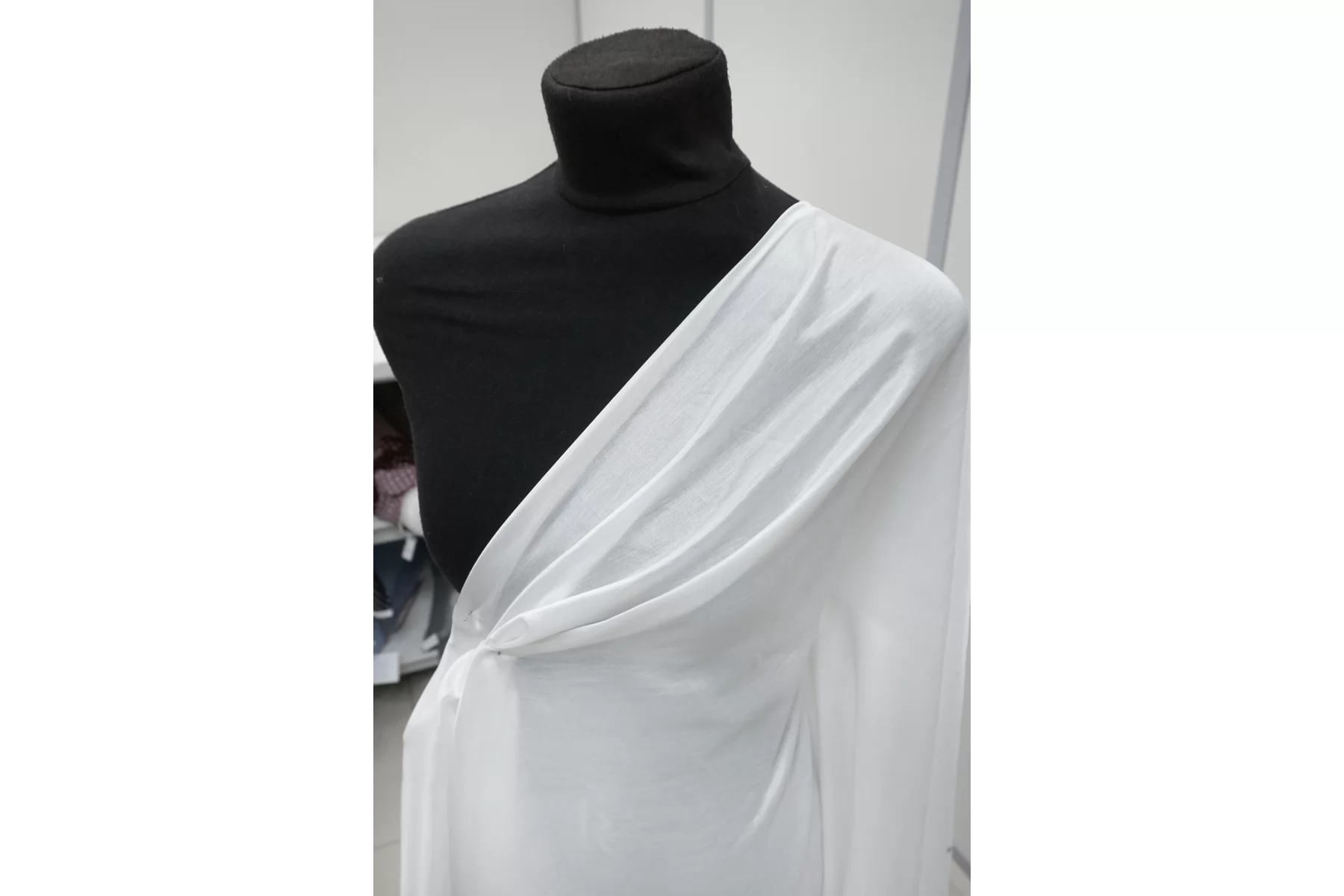 Прекрасного качества плательно-блузочный хлопок с шелком белого цвета (подтон тёплый). Лицевая сторона с мягким сатиновым лоском, изнанка матовая. Приятный и мягкий тактильно. Чувствуется наощупь наличие шелка в составе. Просвечивает в один слой. Отлично драпируется. Не тянется. Мнется. Вариант на блузки, рубашки, платья, юбки и не только. При необходимости используем подкладочный материал. Уход за материалом деликатный.