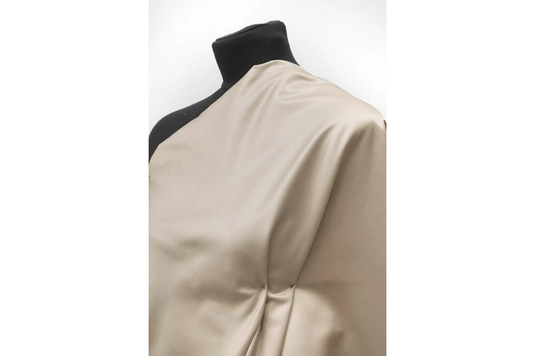 Прекрасного качества рубашечно-плательный хлопок с шелком в ненасыщенном бежевом цвете. Лицевая сторона с мягким сатиновым лоском, изнанка матовая. Приятный и мягкий тактильно. Чувствуется наощупь наличие шелка в составе. Просвечивает если смотреть насквозь в один слой. Отлично драпируется и немного держит форму. Не тянется. Мнется. Вариант на блузки, рубашки, платья, юбки и не только. При необходимости используем подкладочный материал. Уход за материалом деликатный.