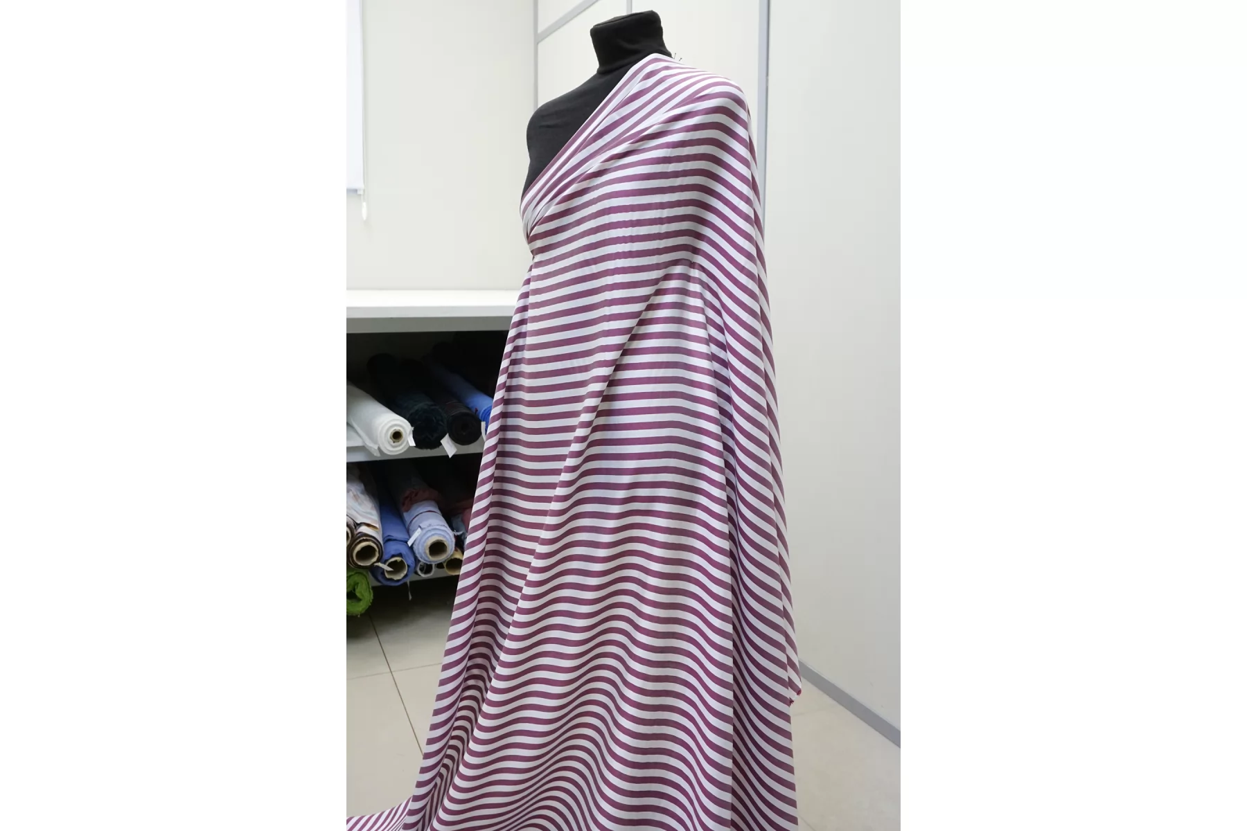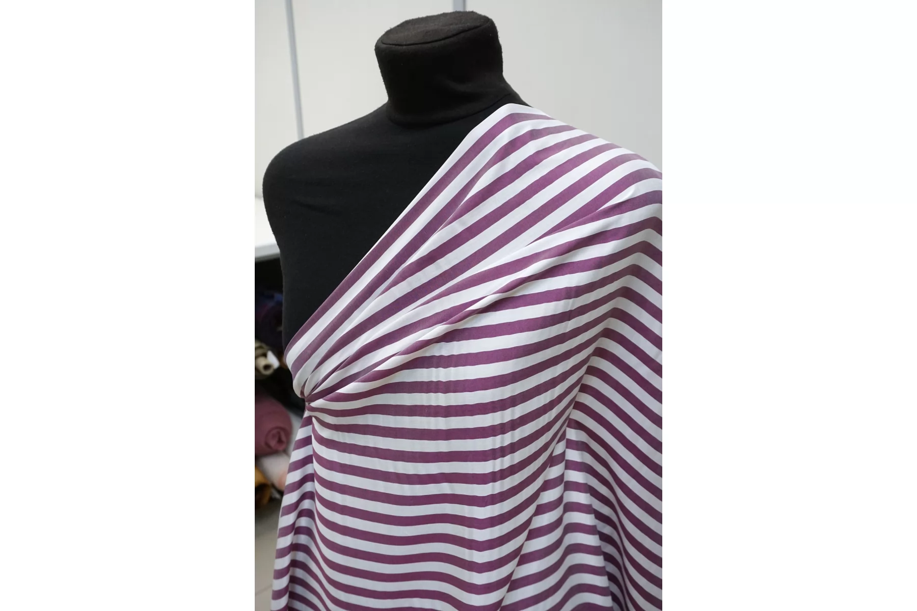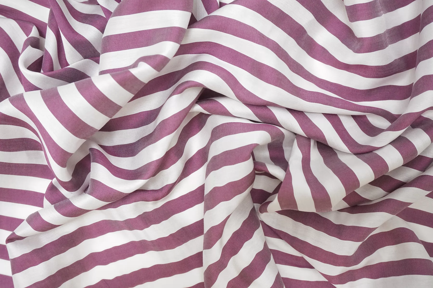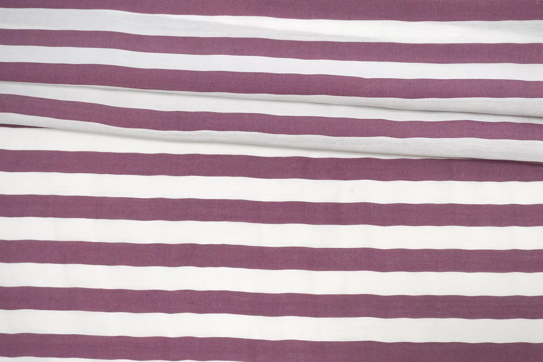 Рубашечно-плательный хлопок с шёлком, с узором полоской (поперек кромки), из нитей белого и сливового цвета. Приятный и мягкий тактильно. С лёгким лоском. Чувствуется наощупь наличие шелка в составе. Просвечивает в один слой. Отлично драпируется и практически не держит форму. Не тянется. Мнется. Вариант на блузки, рубашки, платья, юбки и не только. При необходимости используем подкладочный материал. Уход за материалом деликатный.