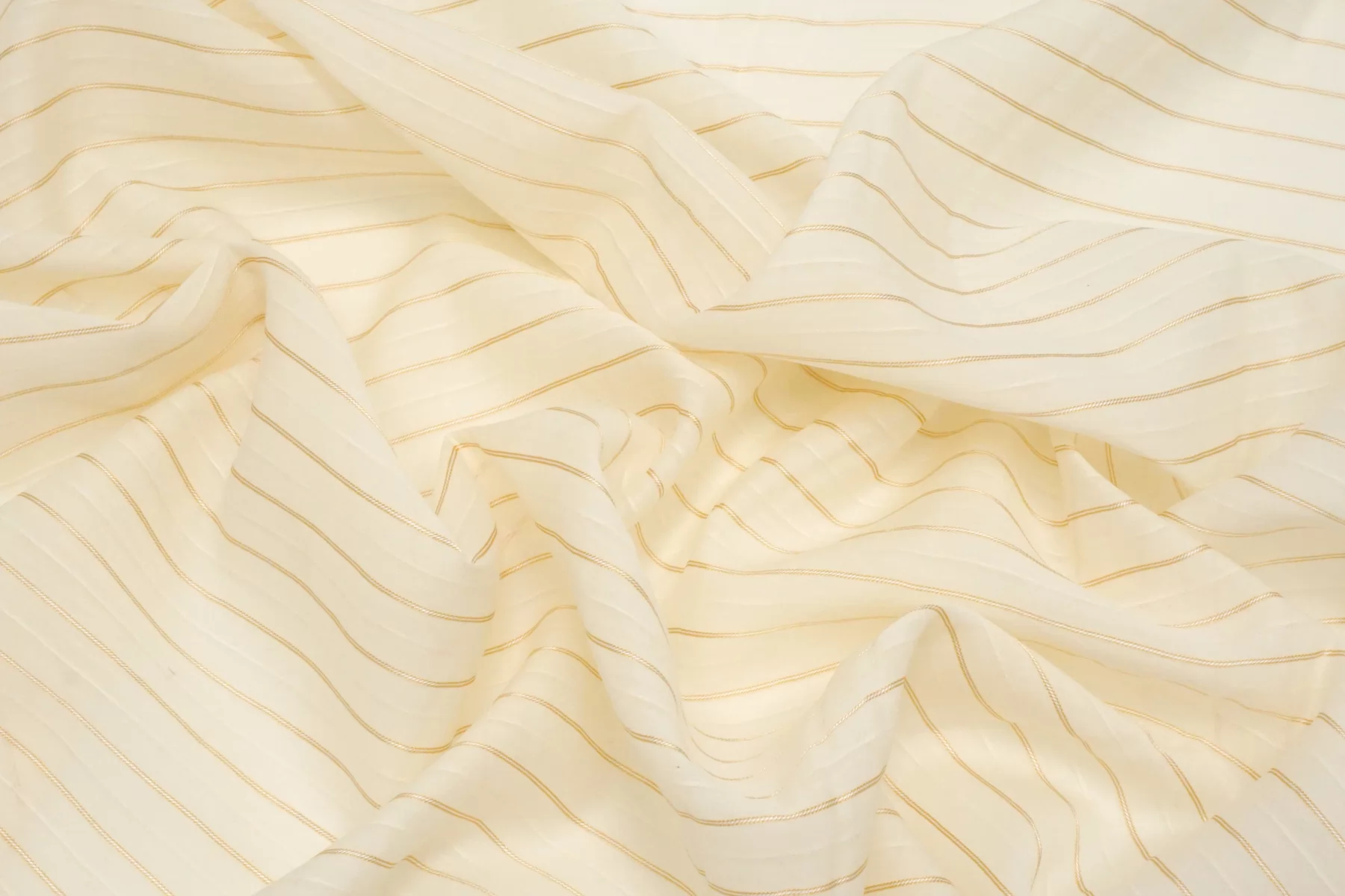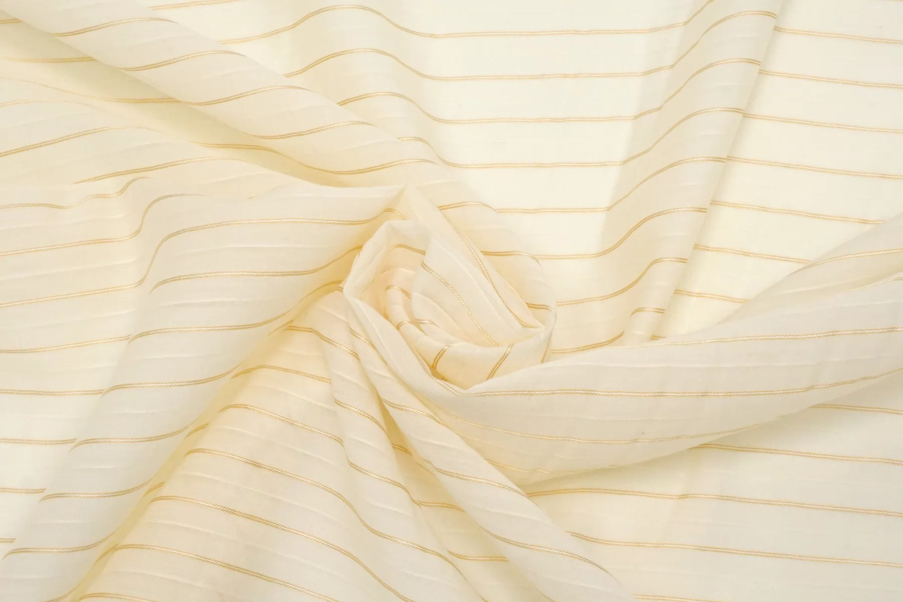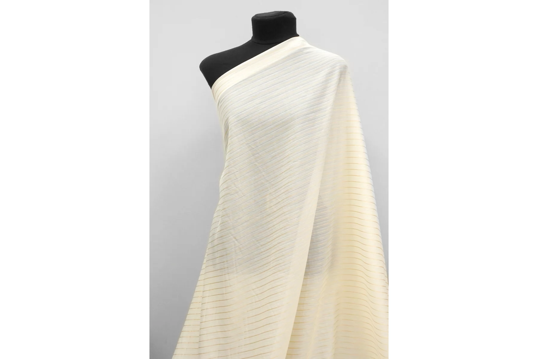 Интересный хлопок с добавкой шёлка и вискозы, молочного цвета в полоску белого и золотистого цвета. Плетение близко к батисту. Тактильно приятный, лёгкий, дышащий. Не тянется, слегка сминается. Просвечивает. Форму слегка держит. Отлично подойдет на свободные рубашки, платья или юбки. Уход деликатный, шьем тонкими иглами.