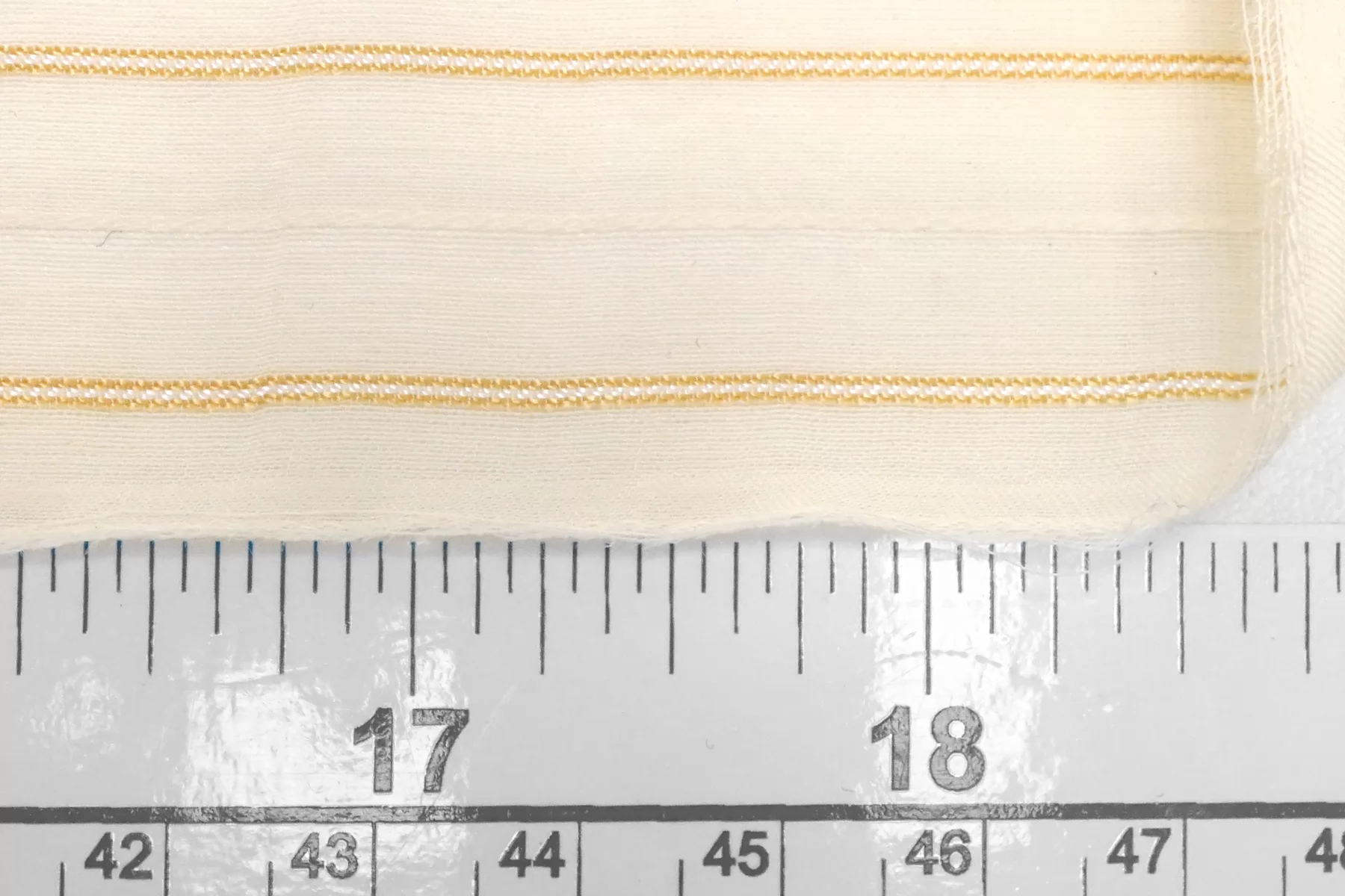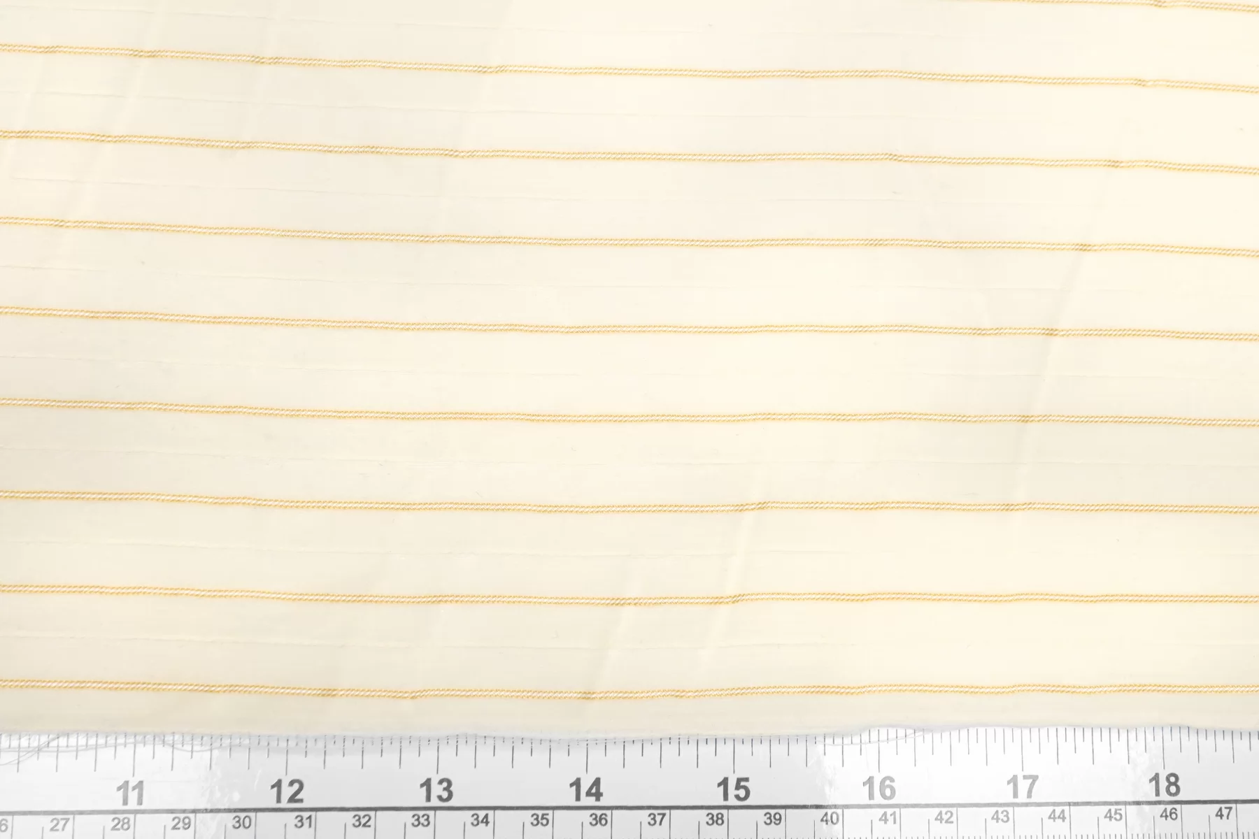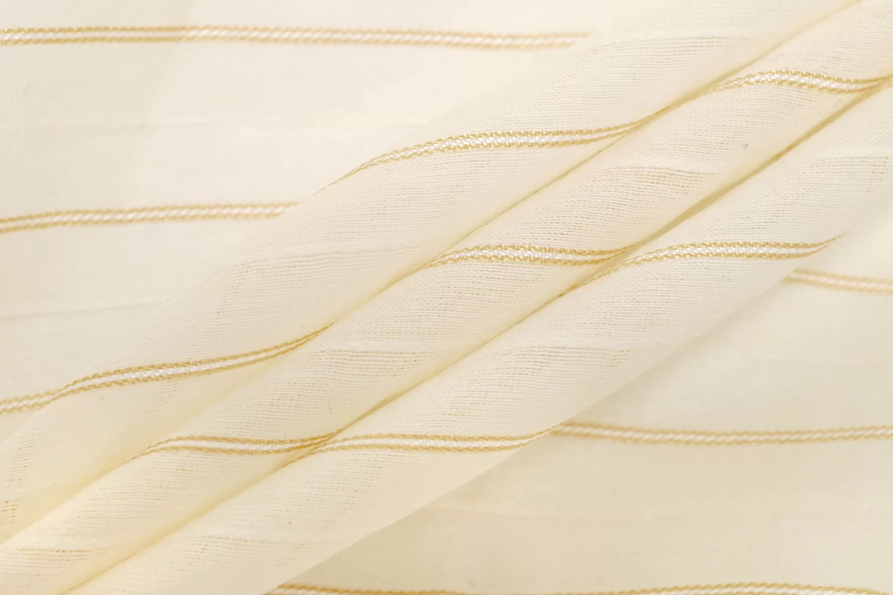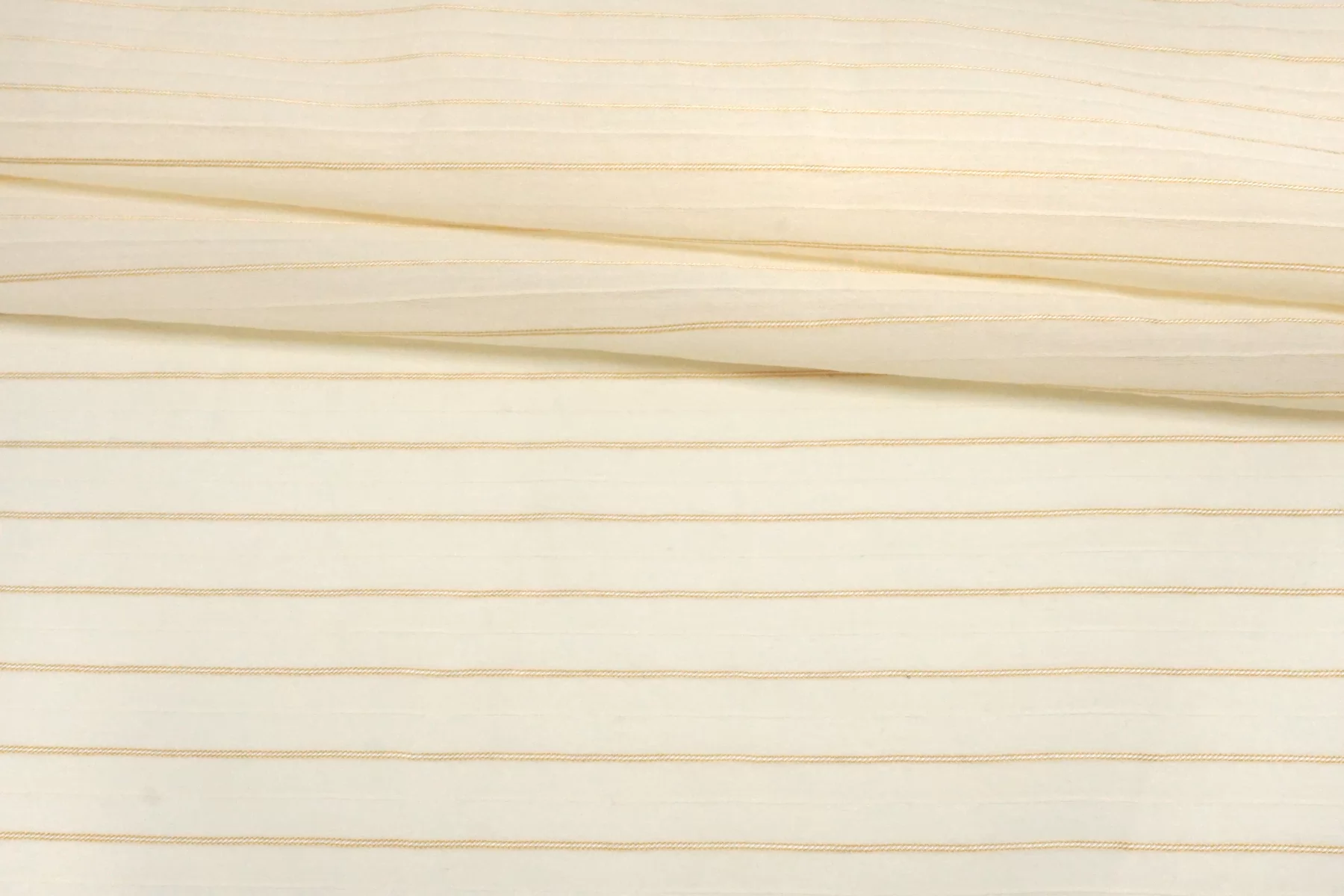 Интересный хлопок с добавкой шёлка и вискозы, молочного цвета в полоску белого и золотистого цвета. Плетение близко к батисту. Тактильно приятный, лёгкий, дышащий. Не тянется, слегка сминается. Просвечивает. Форму слегка держит. Отлично подойдет на свободные рубашки, платья или юбки. Уход деликатный, шьем тонкими иглами.