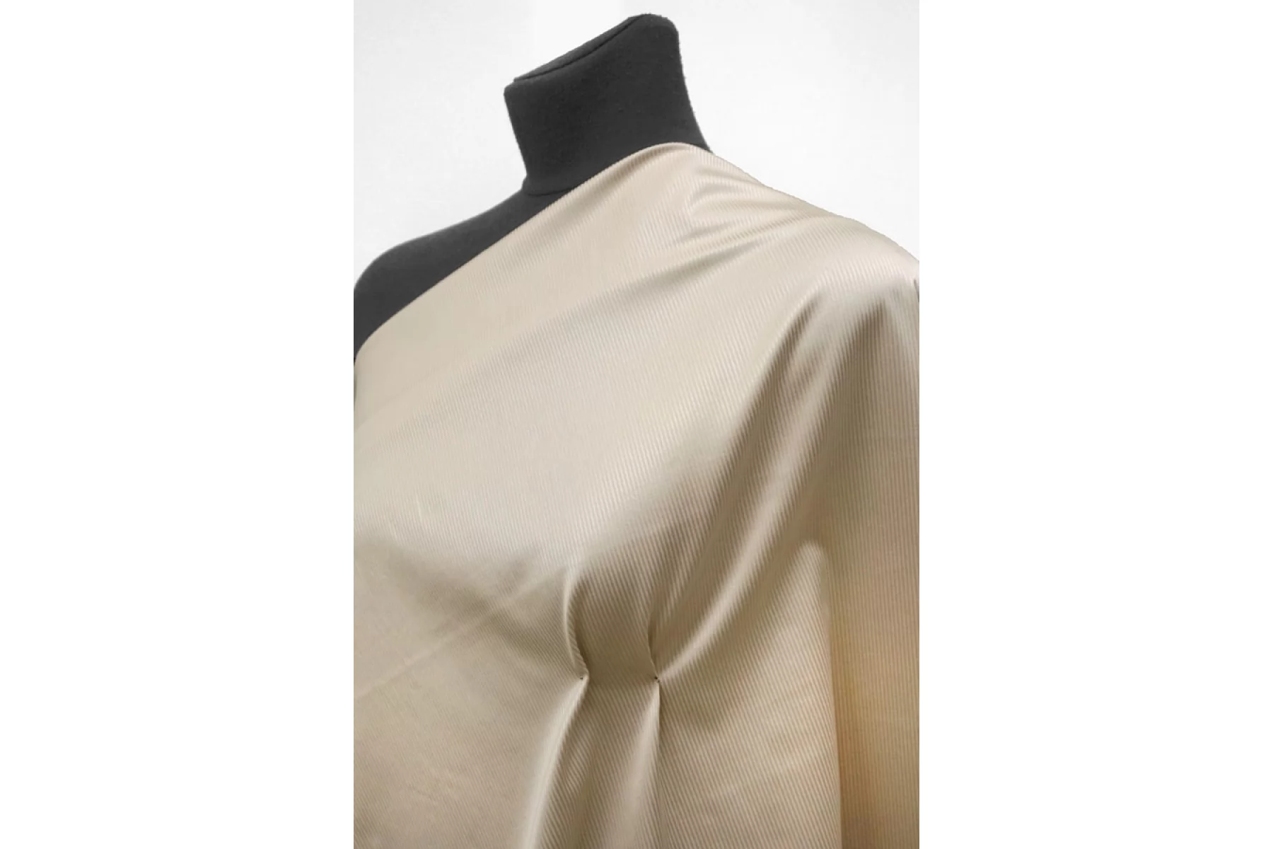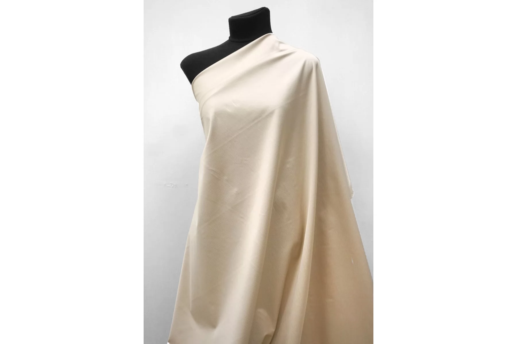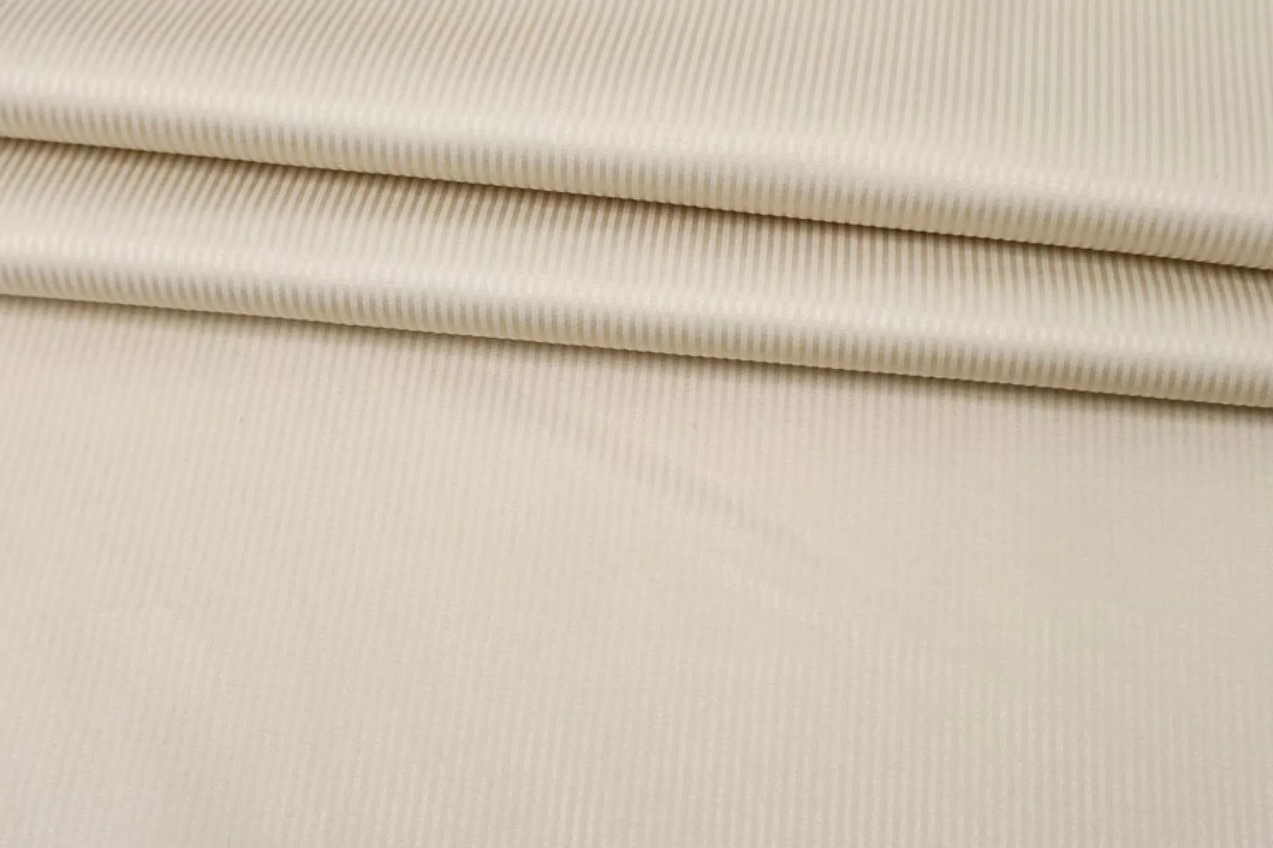 Итальянская ткань из хлопка с вискозой, плательно-костюмной плотности. Цвет разбеленный бежевый, ненасыщенный (близкий к цвету слоновой кости). Матовые и отблескивающие полосы расположена вдоль кромки. Тактильно очень приятный и мягкий, гладкий. Мнется умеренно, хорошо тянется. Не просвечивает. Пластичный но форму держит. Прекрасный вариант на летние платья, брюки, юбки, легкие костюмы.