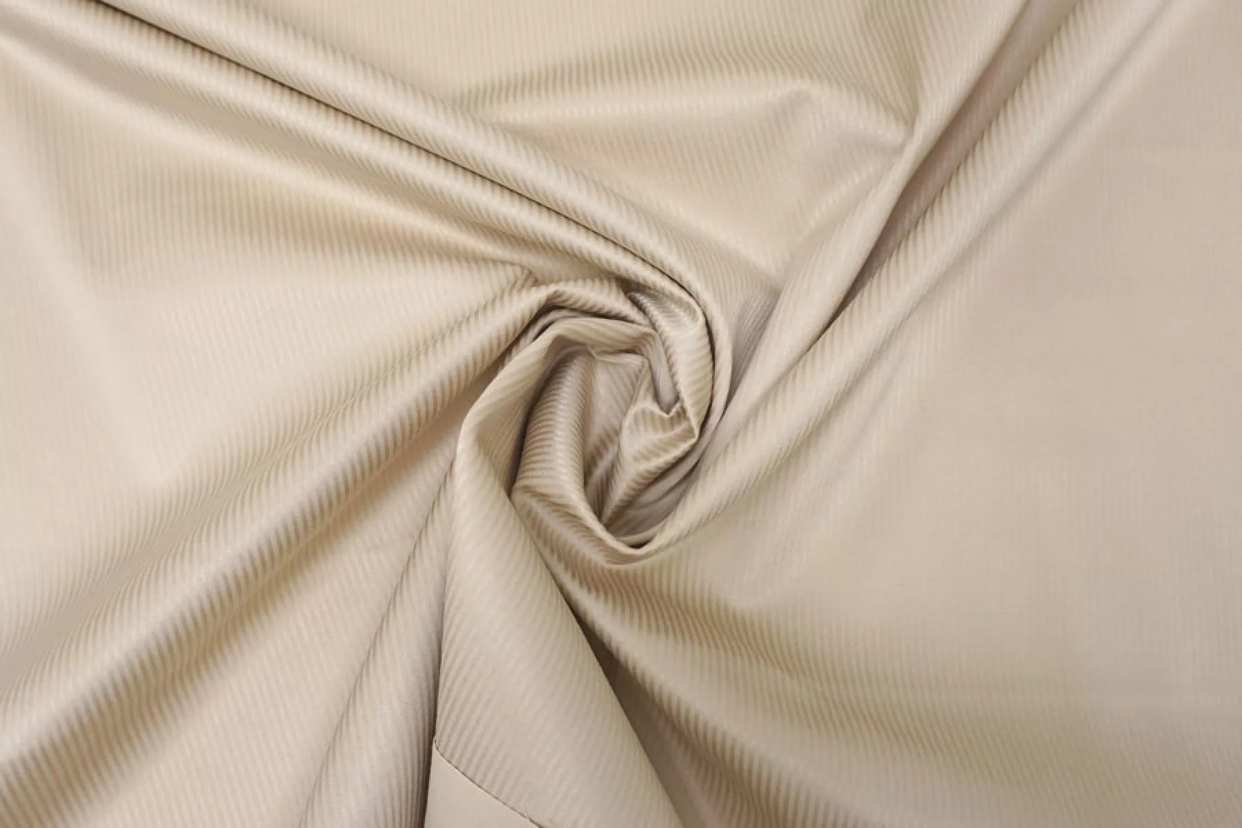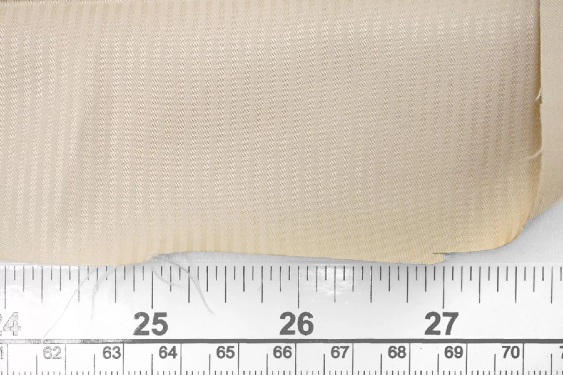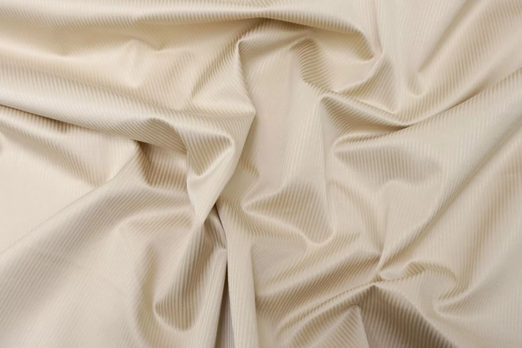 Итальянская ткань из хлопка с вискозой, плательно-костюмной плотности. Цвет разбеленный бежевый, ненасыщенный (близкий к цвету слоновой кости). Матовые и отблескивающие полосы расположена вдоль кромки. Тактильно очень приятный и мягкий, гладкий. Мнется умеренно, хорошо тянется. Не просвечивает. Пластичный но форму держит. Прекрасный вариант на летние платья, брюки, юбки, легкие костюмы.