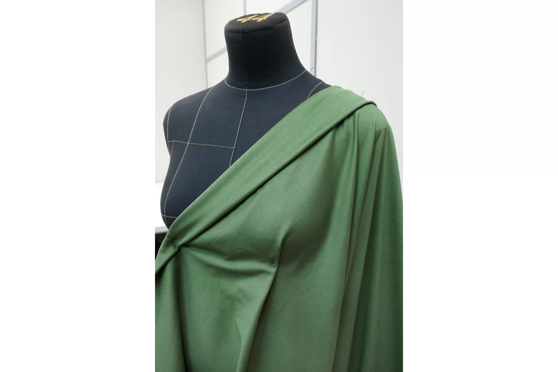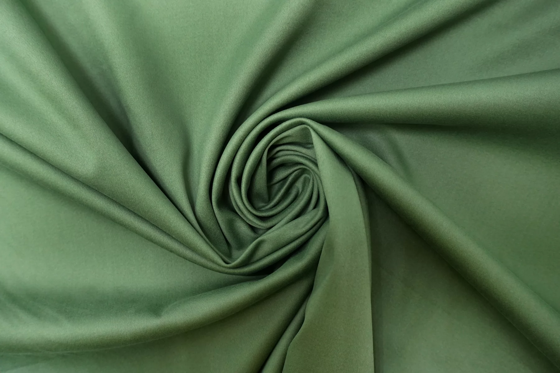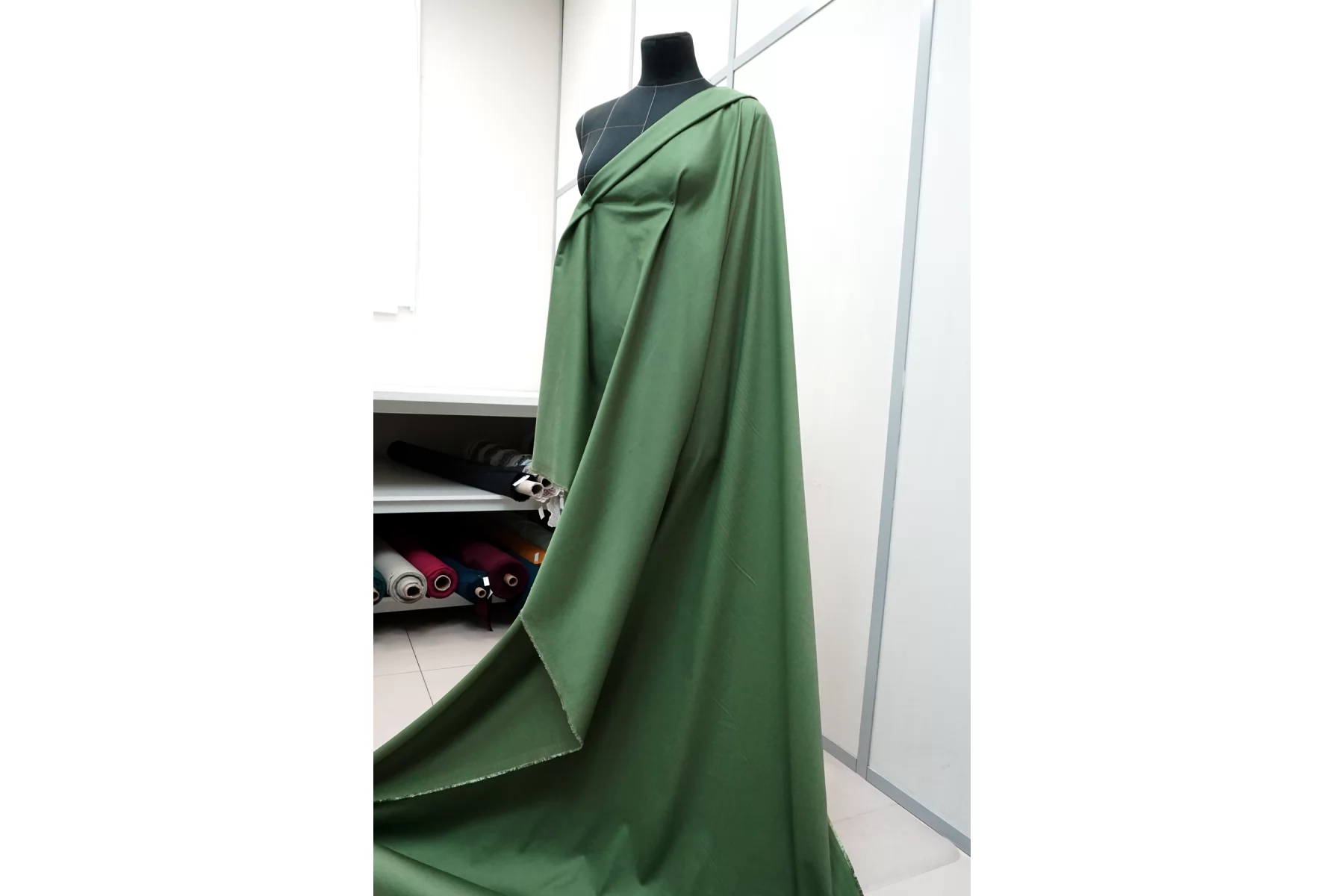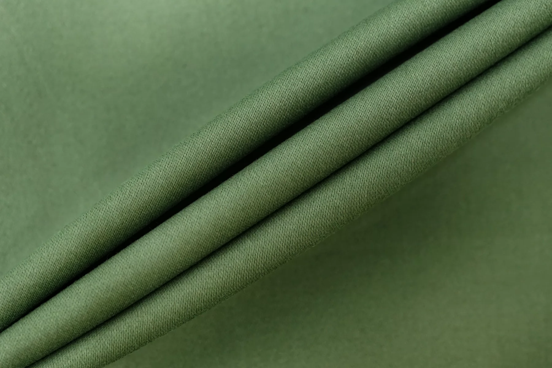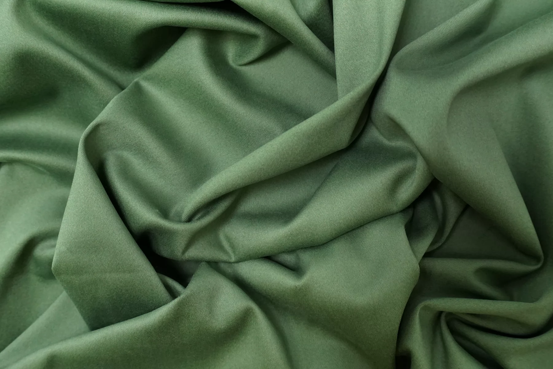 Классный костюмно-плательный хлопок с добавкой вискозы, сатиновый, в спокойном зелёном цвете. Поверхность бархатистая, с peach - эффектом. Тактильно приятный, мягкий, пластичный, гладкий. Обладает лёгким лоском. Достаточно плотненький, при этом тонкий. Не просвечивает. Сминается. Тянется. Умеренно держит форму, пластичный. Вариант на костюмы, платья, юбки, брюки.