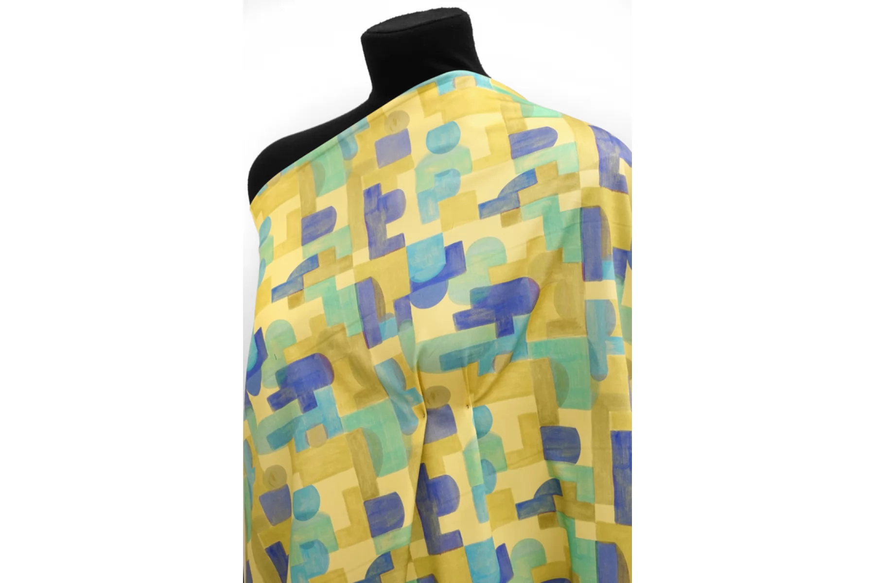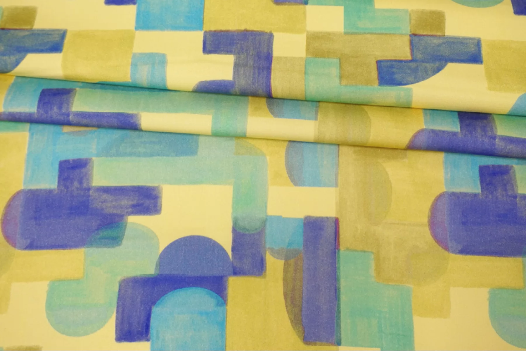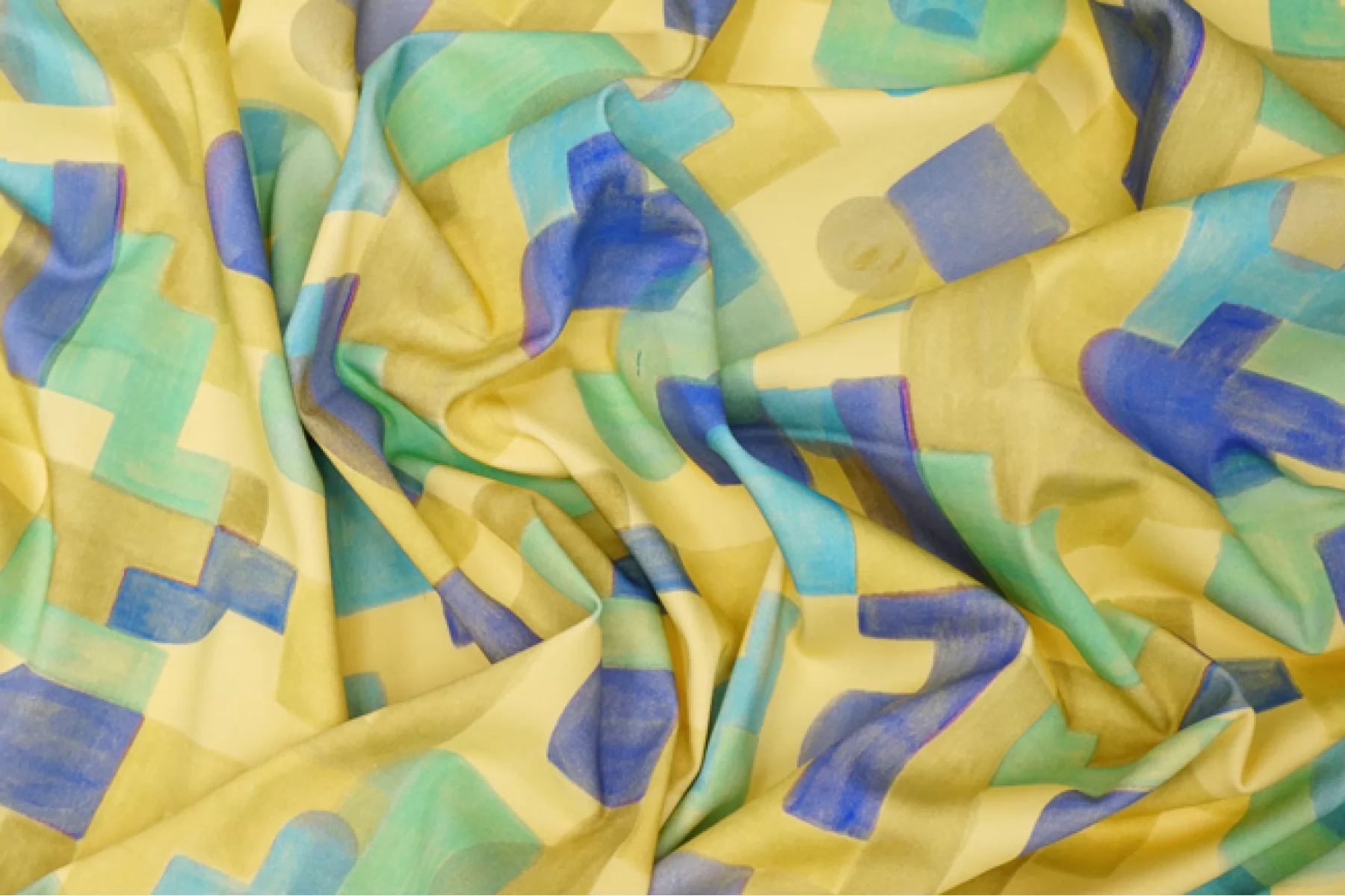Костюмно-плательный сатиновый хлопок с принтом в виде геометрической абстракции в желтом, голубом, фиолетовом и зеленом оттенках от бренда Achille Pinto. Очень гладкий и мягкий. Не просвечивает, хорошо тянется, пластичный. Держит форму. Красиво драпируется. Подойдет для пошива брюк, шорт, платья, юбки, жакета.
