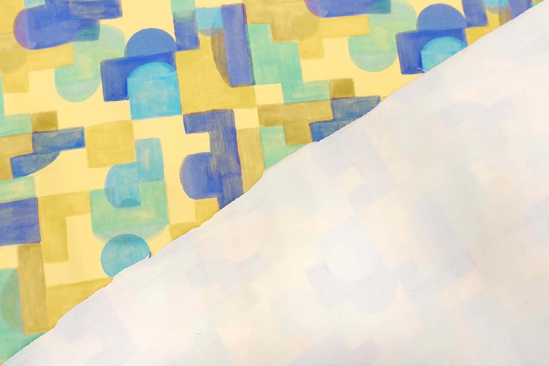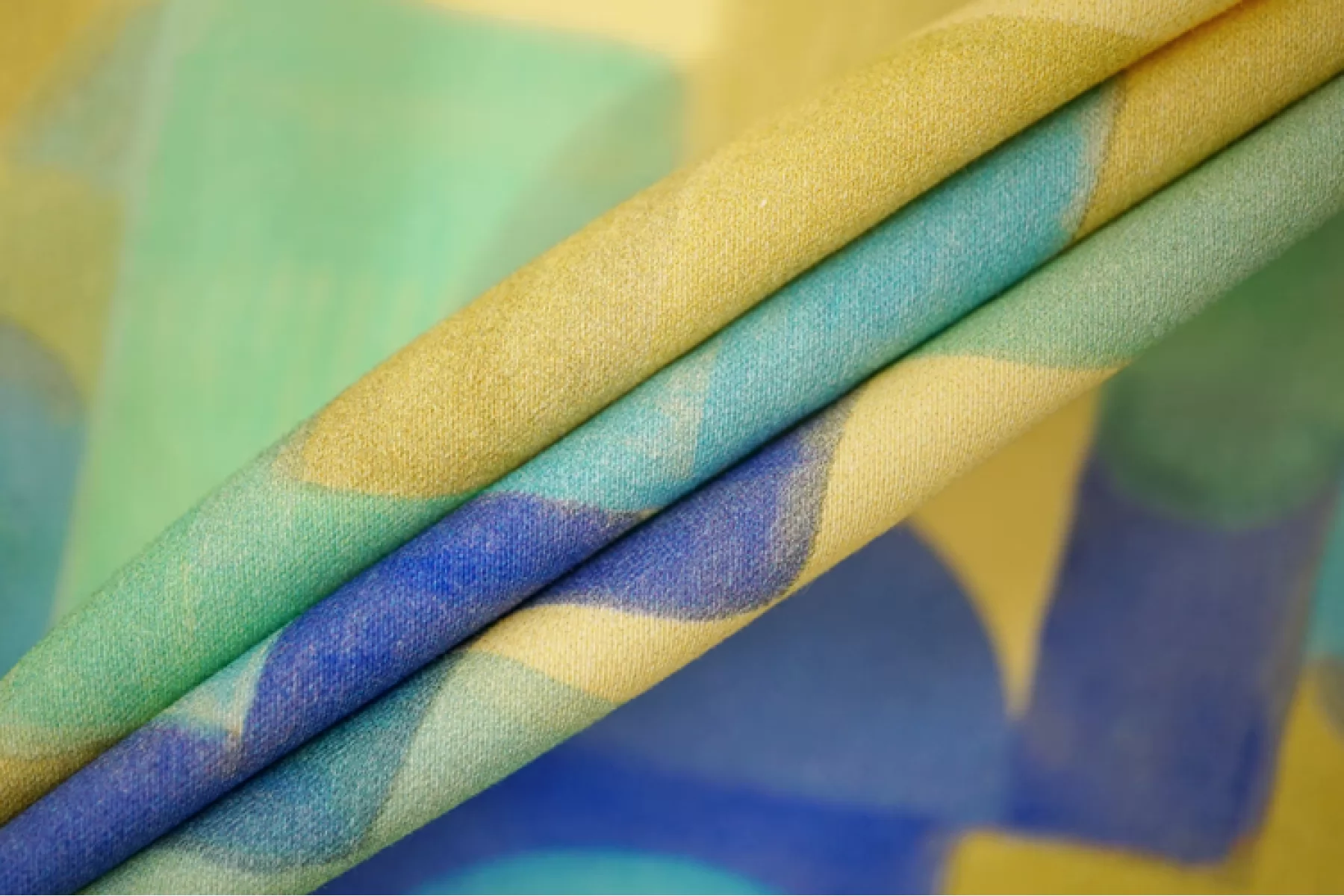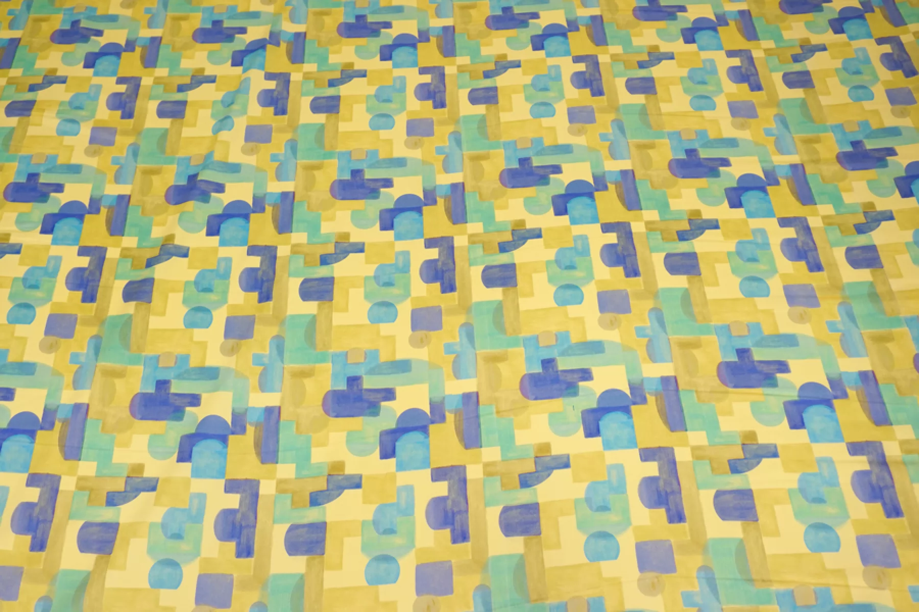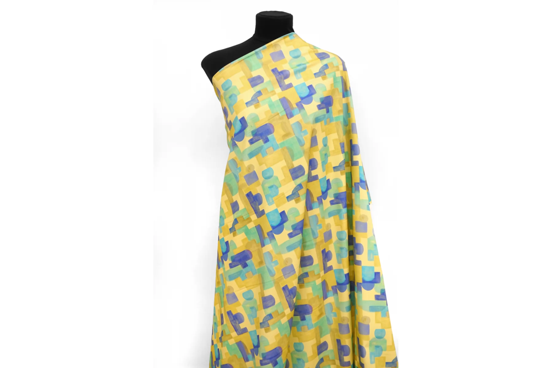 Костюмно-плательный сатиновый хлопок с принтом в виде геометрической абстракции в желтом, голубом, фиолетовом и зеленом оттенках от бренда Achille Pinto. Очень гладкий и мягкий. Не просвечивает, хорошо тянется, пластичный. Держит форму. Красиво драпируется. Подойдет для пошива брюк, шорт, платья, юбки, жакета.