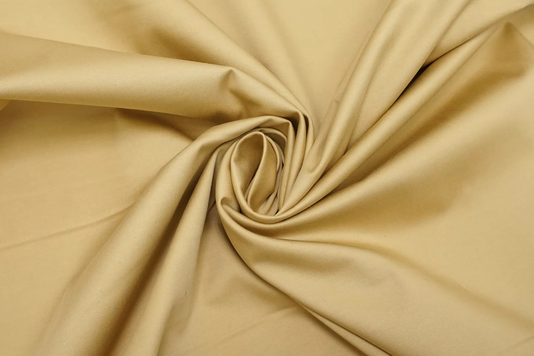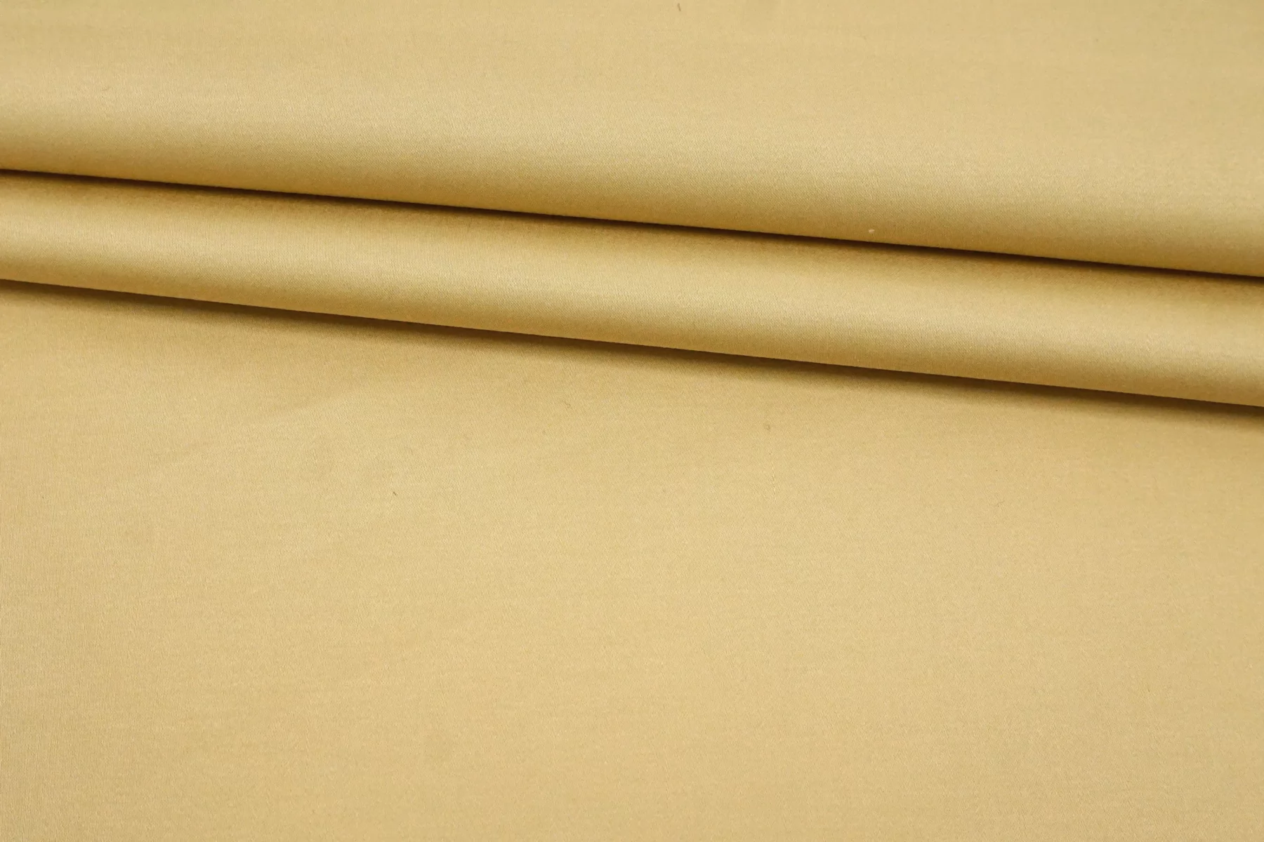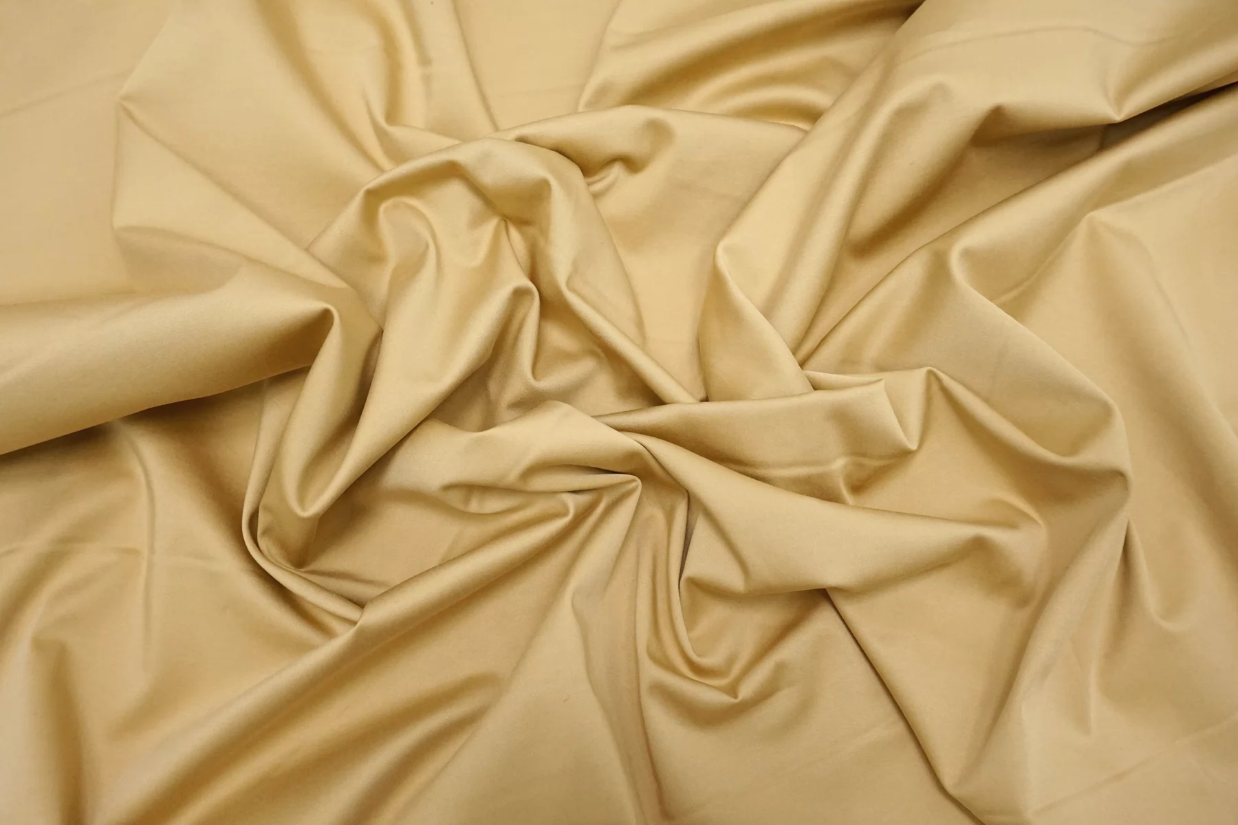 Классный костюмно-плательный хлопок, сатиновый, приятного песочного оттенка (желтовато-бежевый). Тактильно приятный, мягкий, пластичный, гладкий. Обладает лёгким лоском. Достаточно плотненький, при этом тонкий. Минимально просвечивает силуэт в один слой. Сминается. Тянется. Умеренно держит форму, пластичный. Вариант на платья, юбки, брюки.