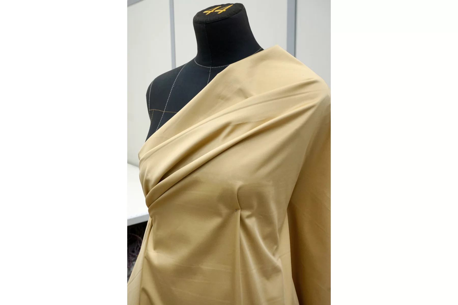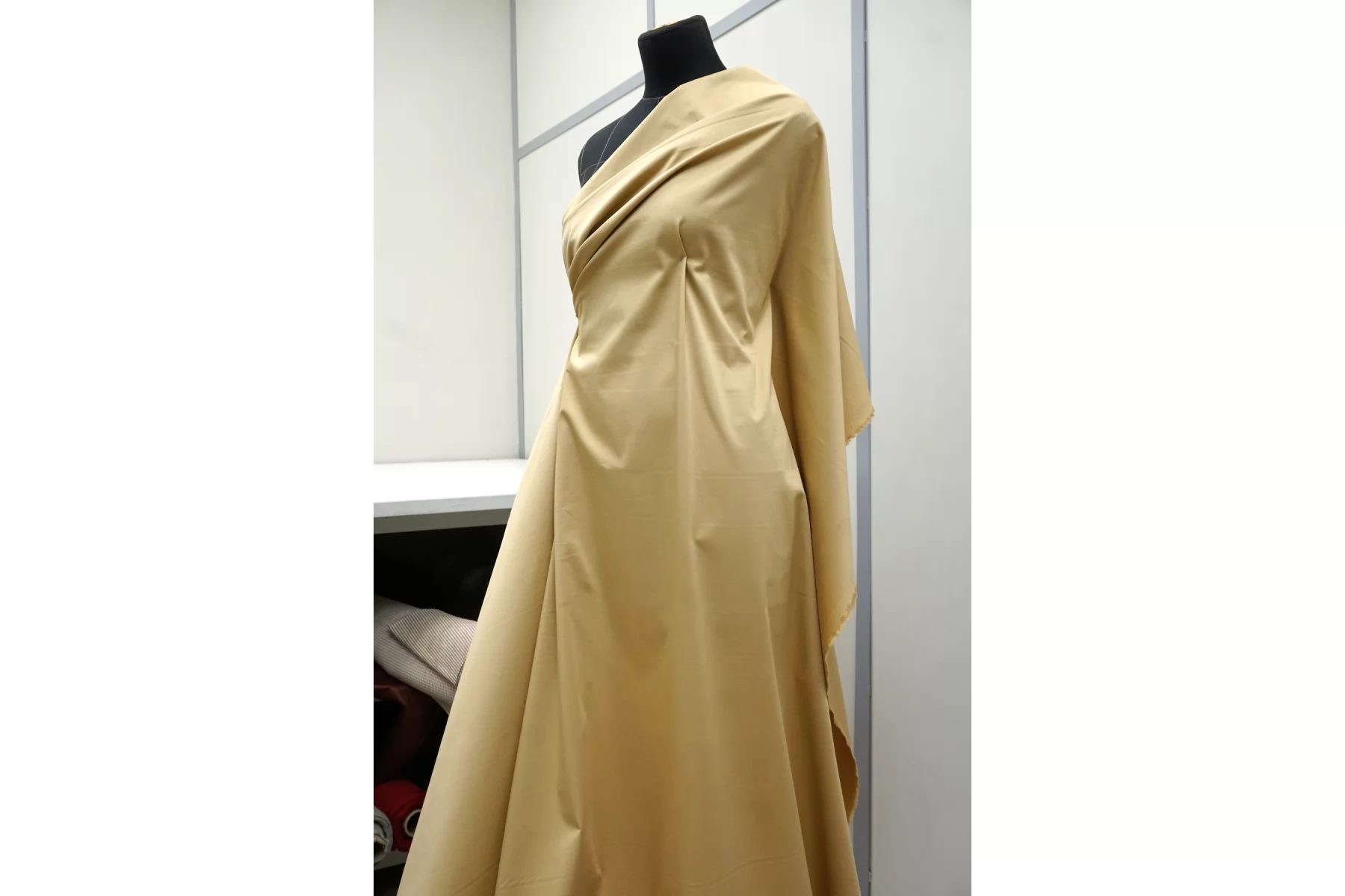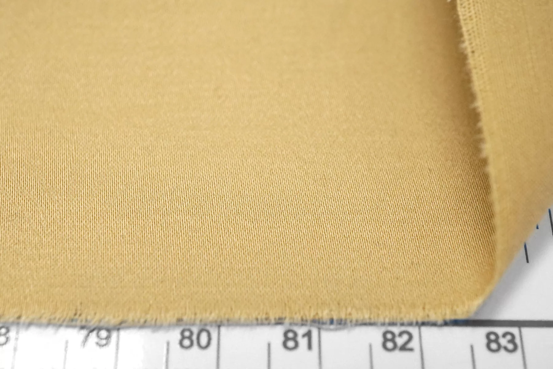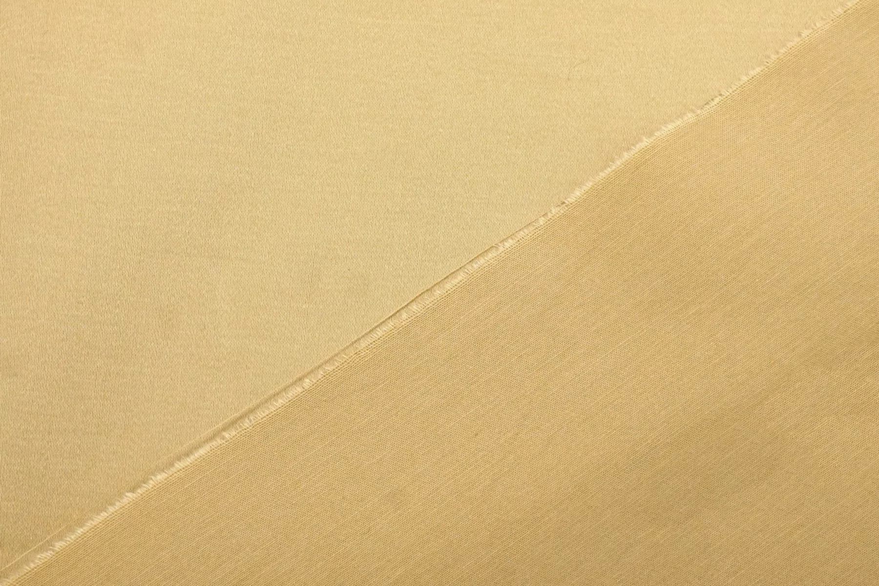 Классный костюмно-плательный хлопок, сатиновый, приятного песочного оттенка (желтовато-бежевый). Тактильно приятный, мягкий, пластичный, гладкий. Обладает лёгким лоском. Достаточно плотненький, при этом тонкий. Минимально просвечивает силуэт в один слой. Сминается. Тянется. Умеренно держит форму, пластичный. Вариант на платья, юбки, брюки.