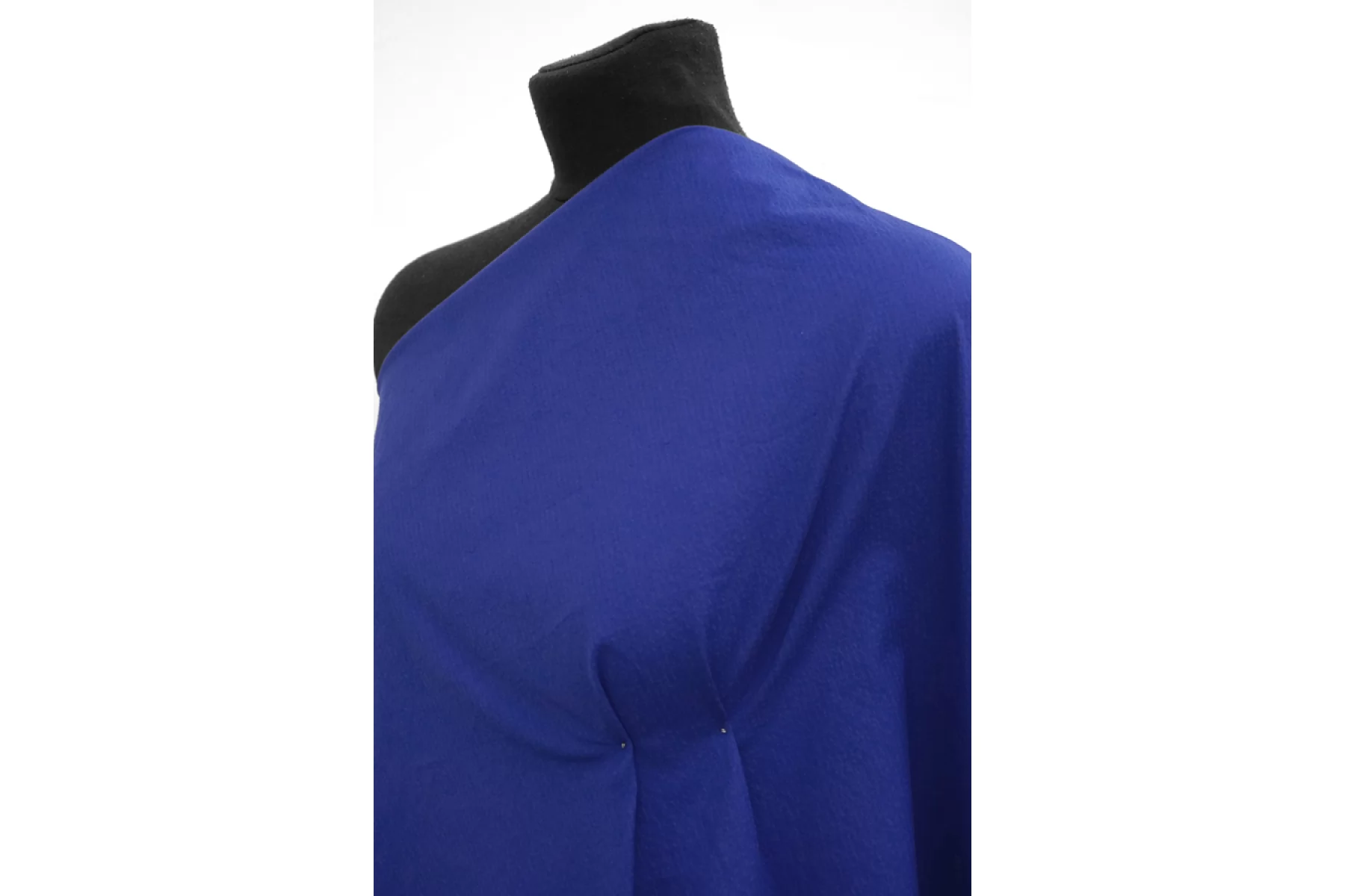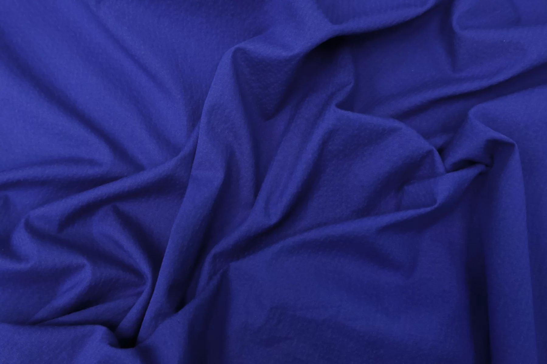 Итальянский рубашечный хлопок-сирсакер синего цвета. Тонкий, плотный, чувствуется фактура наощупь. Форму не держит, немного сминается, не просвечивает. Плетение тянется совсем немного. Подойдет для пошива платья, рубашки, юбки. Учитывайте усадку материала.