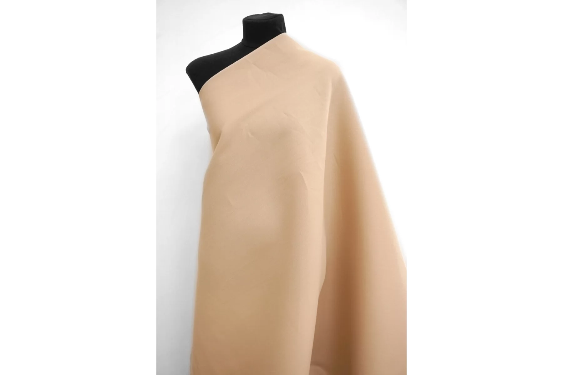 Прекрасный фактурный хлопок со льном костюмной плотности, в светлом песочно-бежевом оттенке. Тактильно суховатый, шероховатый, плетение чувствуется. Есть нити с очень легким лоском. Не тянется, мнется, не просвечивает. Форму держит. Отличный костюмный вариант. Учитывайте возможную усадку.