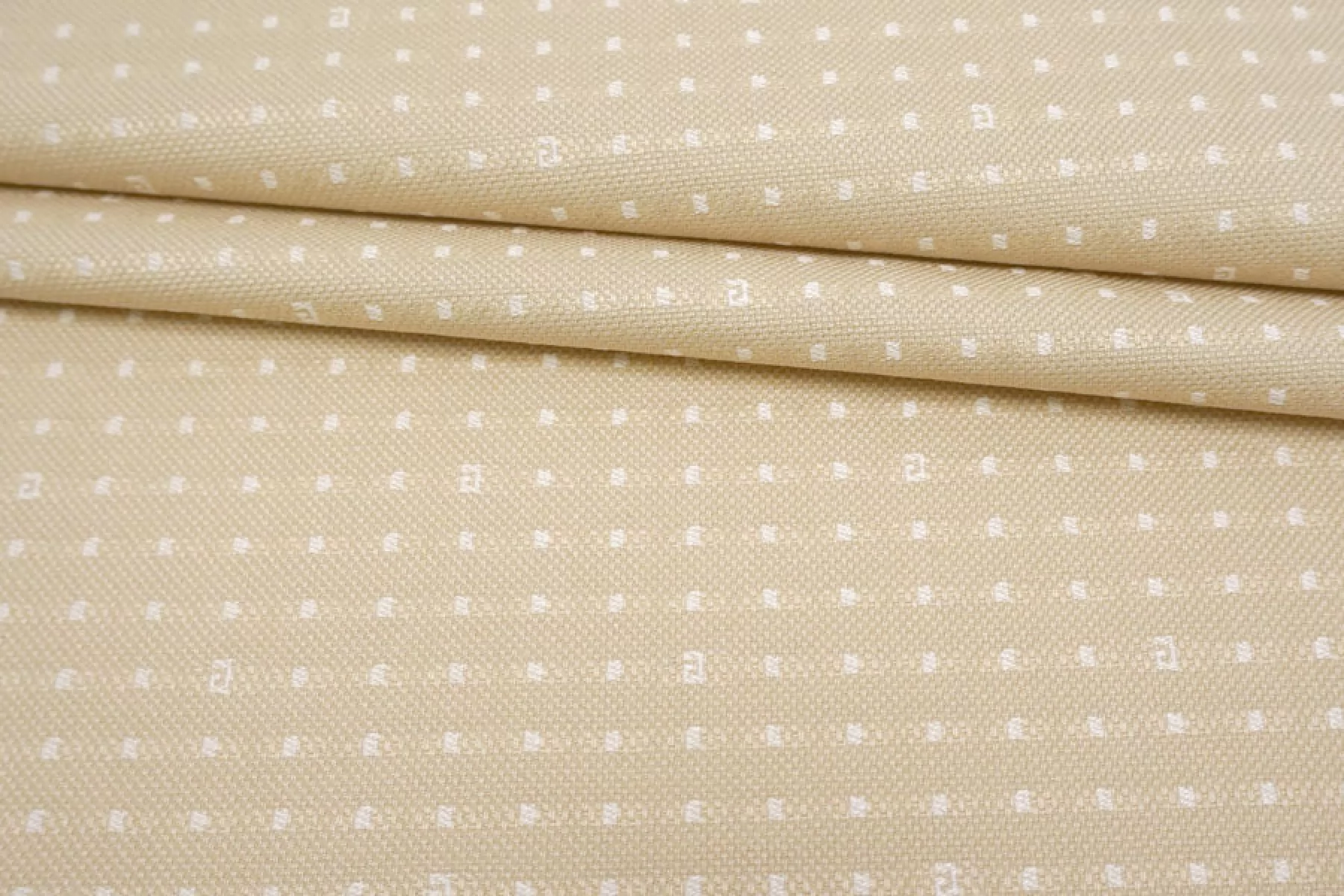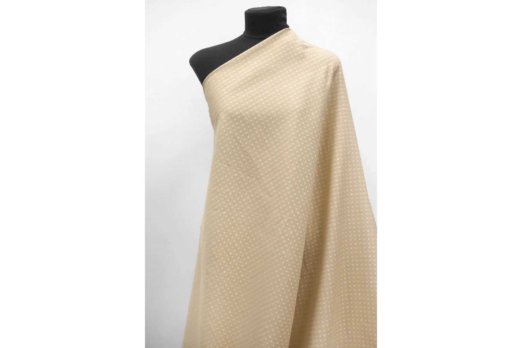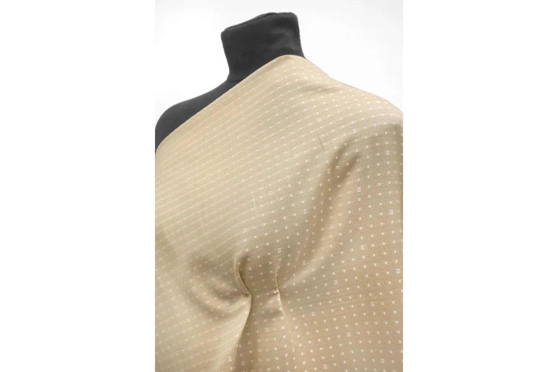 Костюмно-плательный хлопок со льном от бренда Gucci, красивого светло-бежевого оттенка, с белой выработкой-филькупе. Тактильно мягкий и чуть суховатый. Поверхность с красивым легким лоском Пластичный, но при этом формодержащий материал. Не тянется, не просвечивает. Мнется средне. Прекрасно подойдет на платья, свободные рубашки верхнего слоя, юбки, летние костюмы.