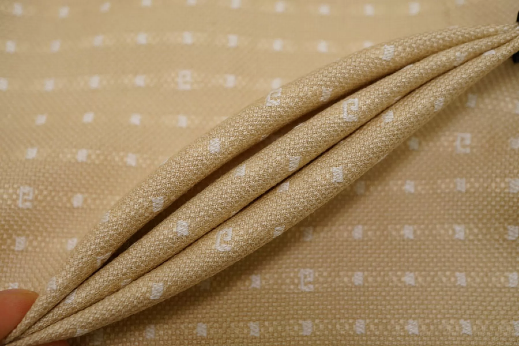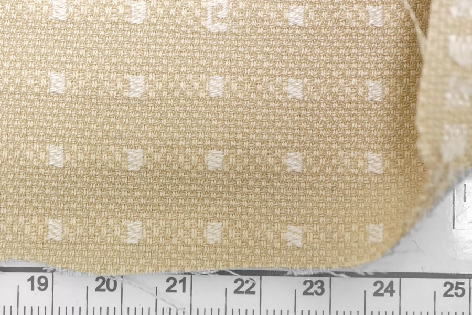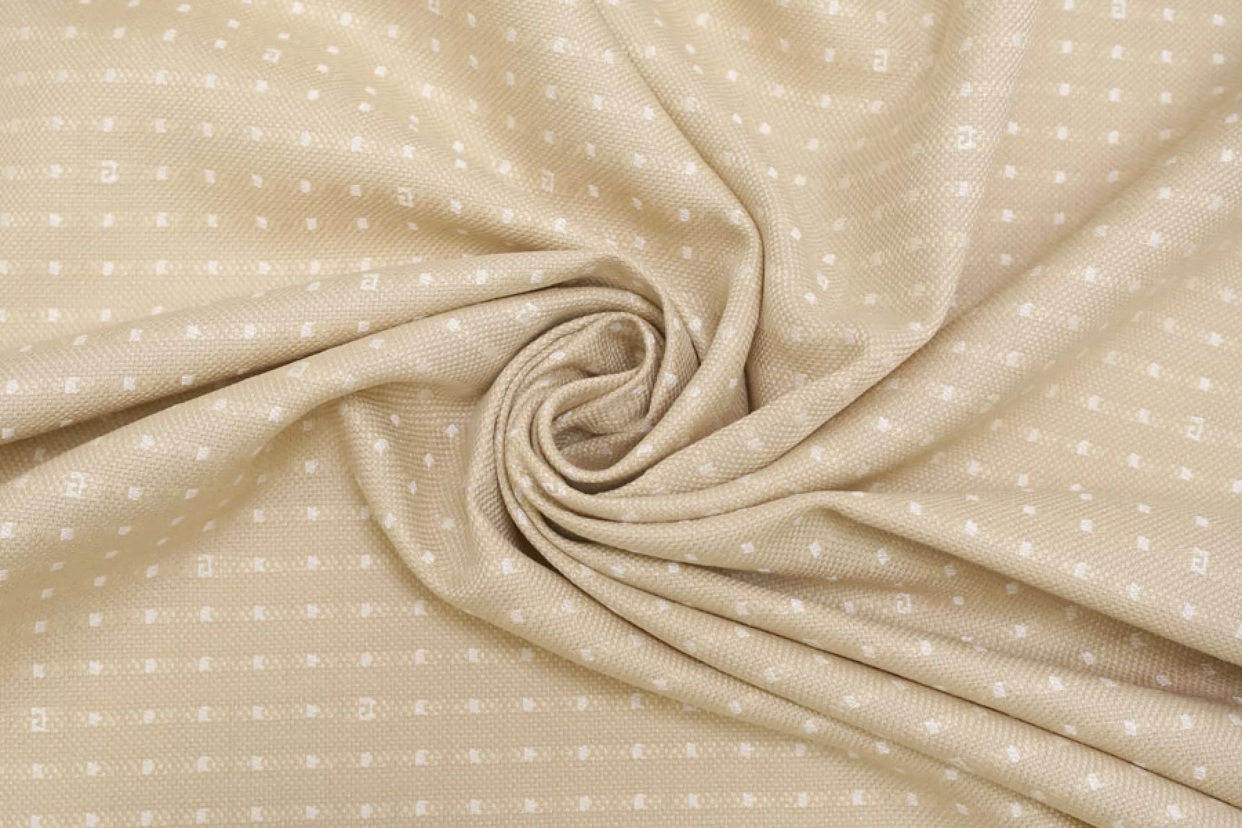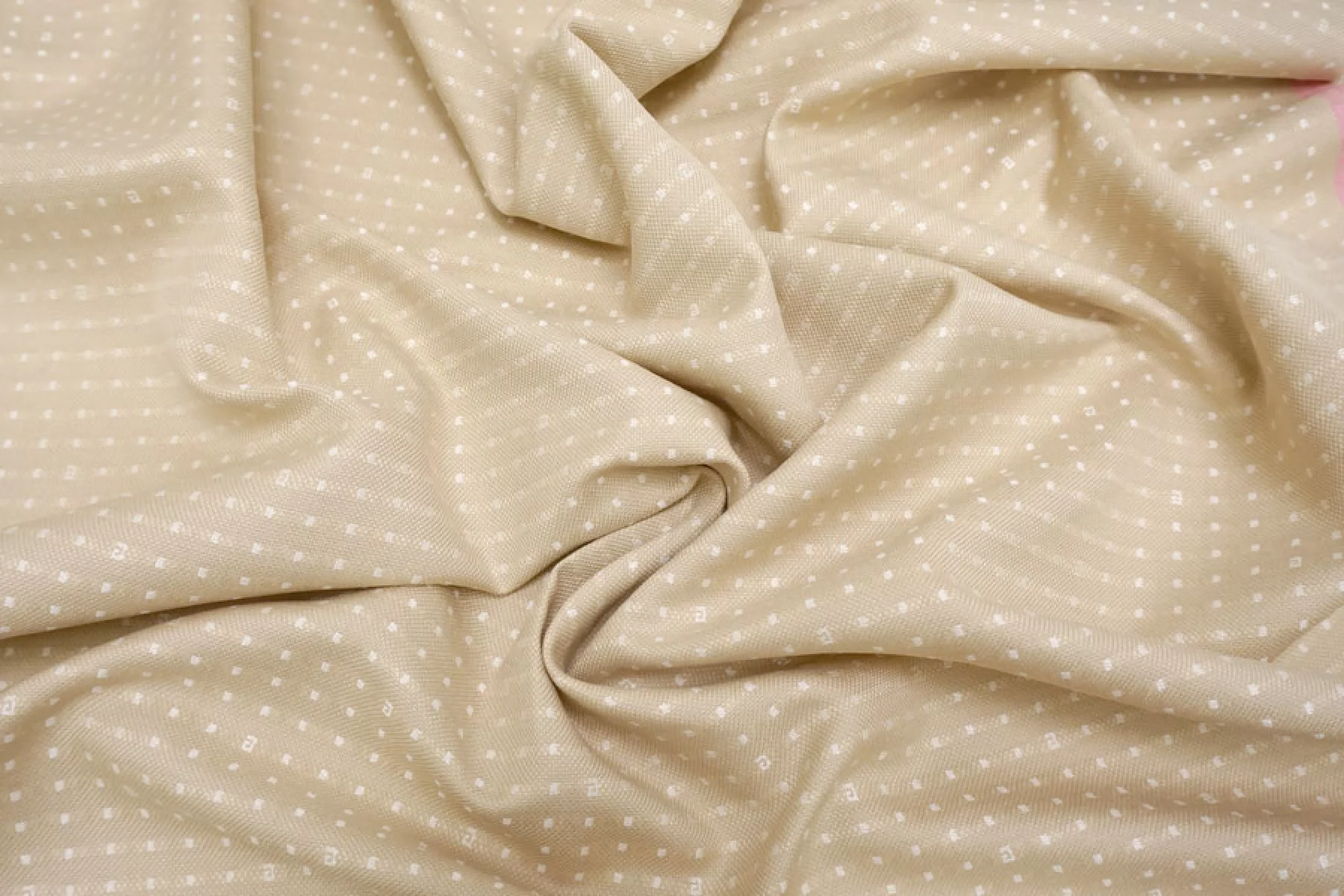 Костюмно-плательный хлопок со льном от бренда Gucci, красивого светло-бежевого оттенка, с белой выработкой-филькупе. Тактильно мягкий и чуть суховатый. Поверхность с красивым легким лоском Пластичный, но при этом формодержащий материал. Не тянется, не просвечивает. Мнется средне. Прекрасно подойдет на платья, свободные рубашки верхнего слоя, юбки, летние костюмы.