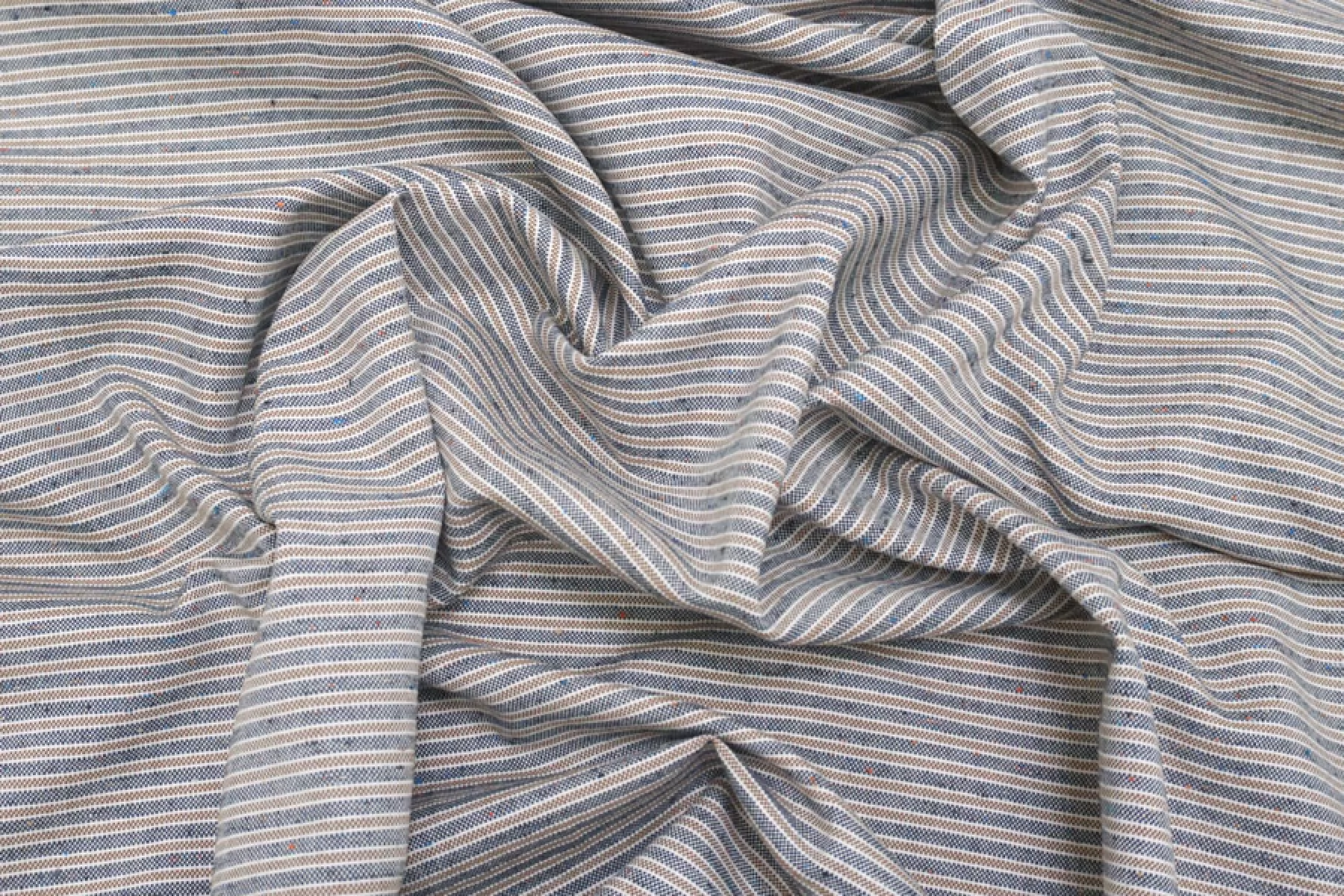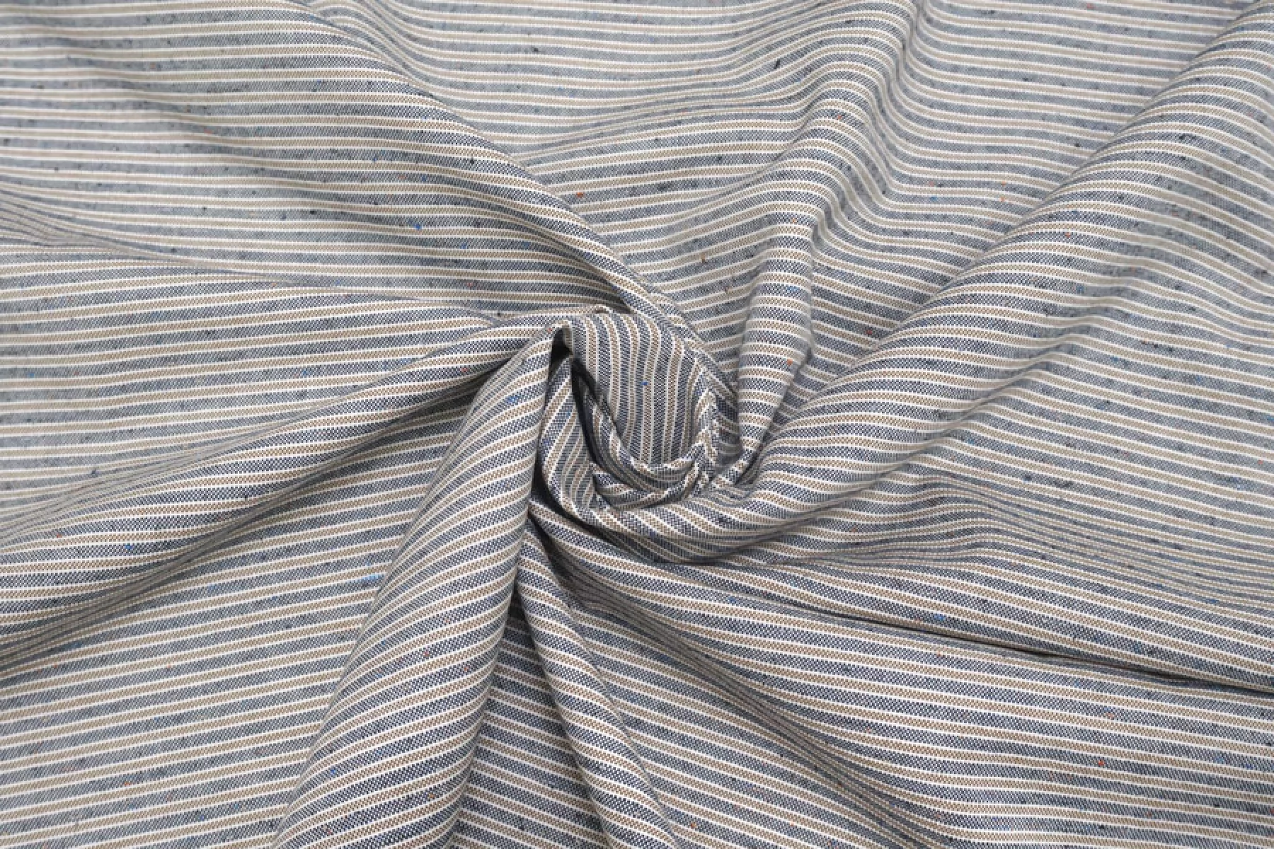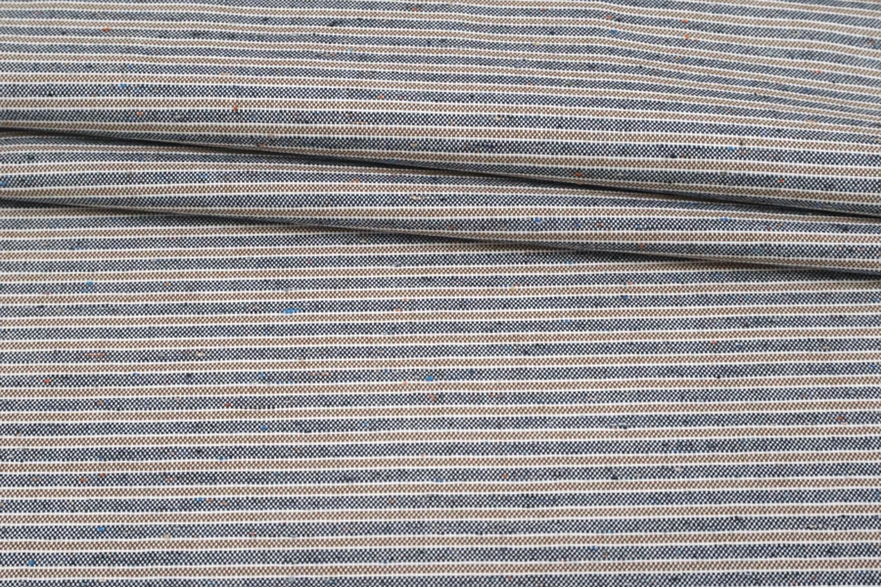 Костюмно-плательный хлопок со льном, с узором-полоской (вдоль кромки), нити белого, чёрного и бежево-коричневого цвета, плюс вкрапления сине-голубых и рыжевато-коричневых нитей. Визуально напоминает благодаря этим вкраплениям и утолщениям твид. Тактильно очень приятный, мягкий. Пластичный, но при этом формодержащий материал. Не тянется, не просвечивает. Мнется средне. Прекрасно подойдет на платья, свободные рубашки верхнего слоя, юбки, летние костюмы.