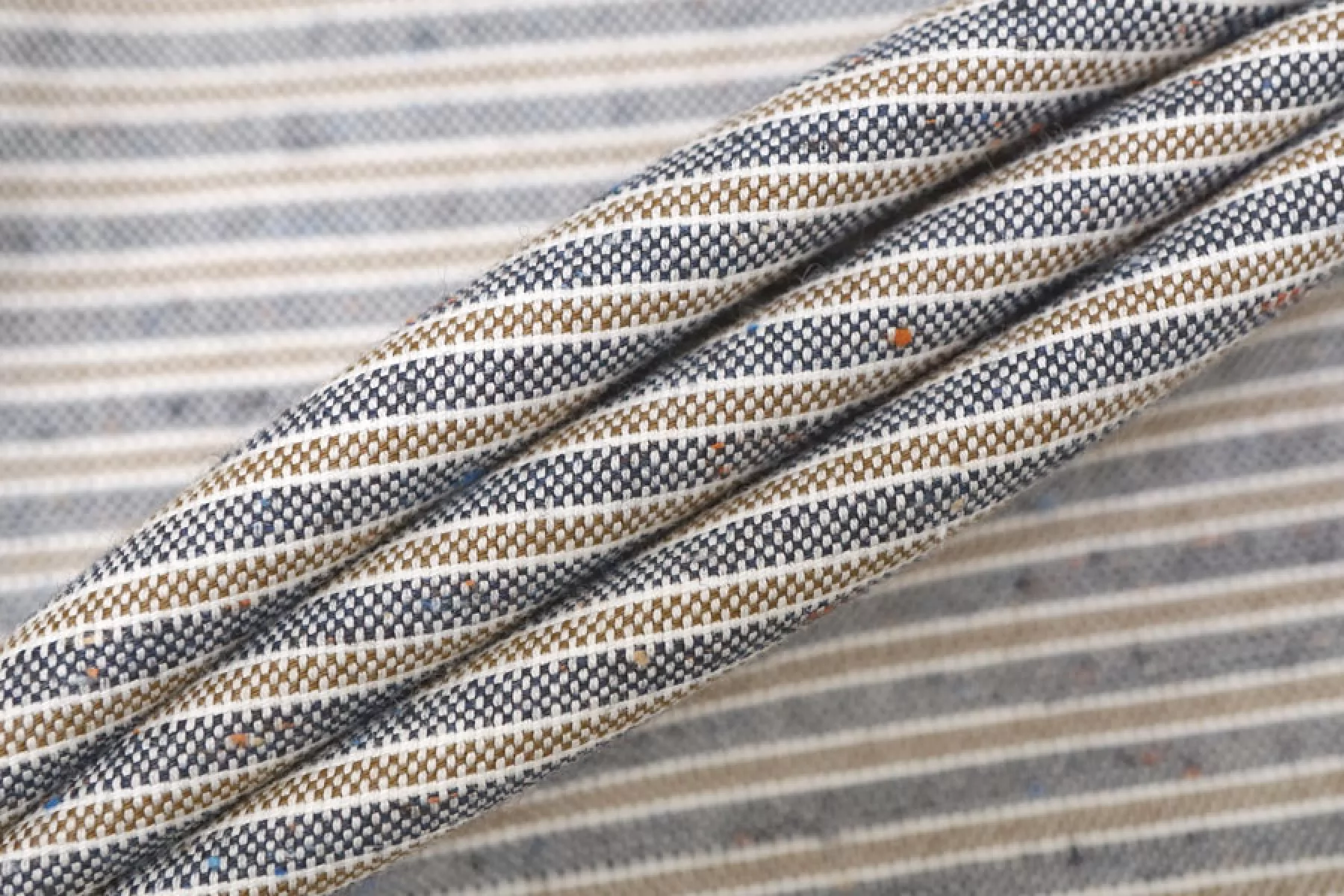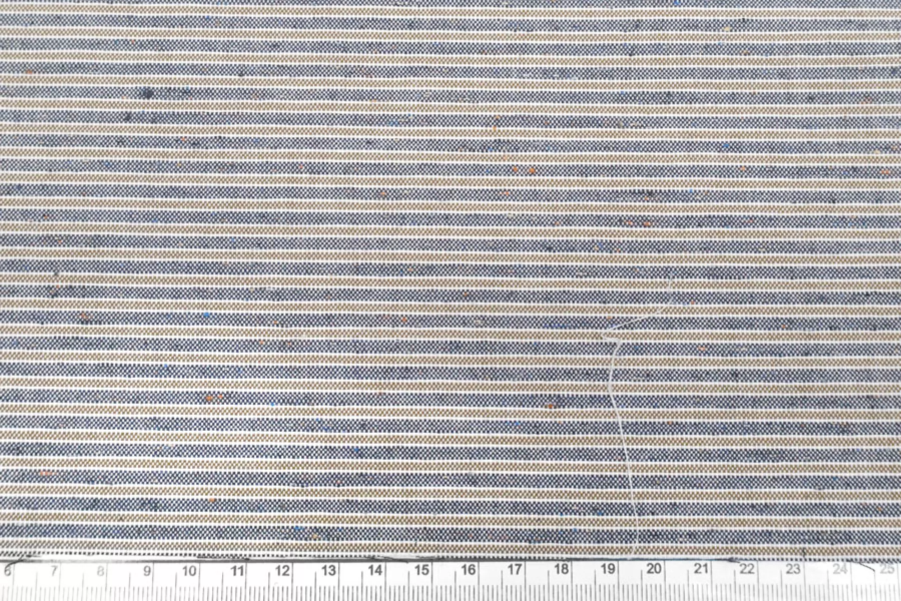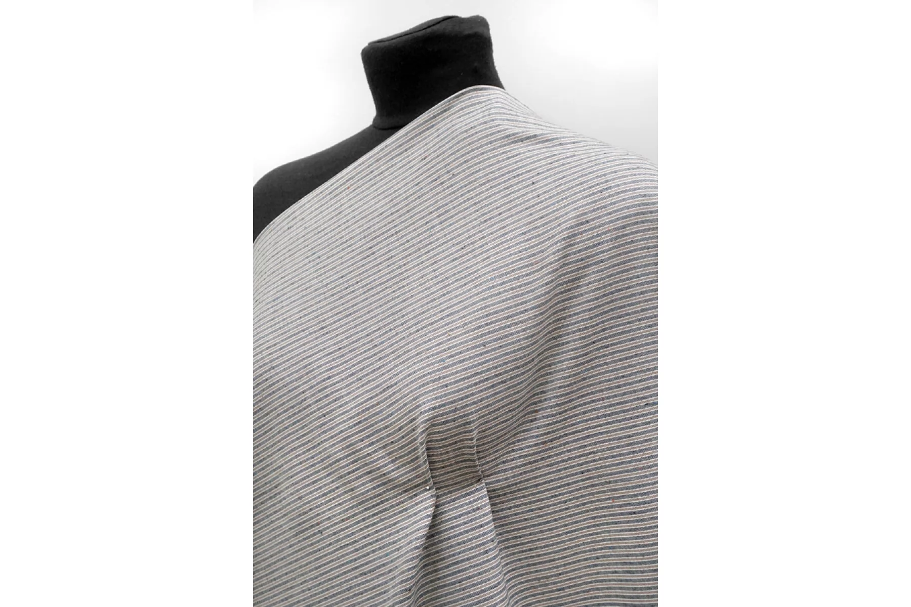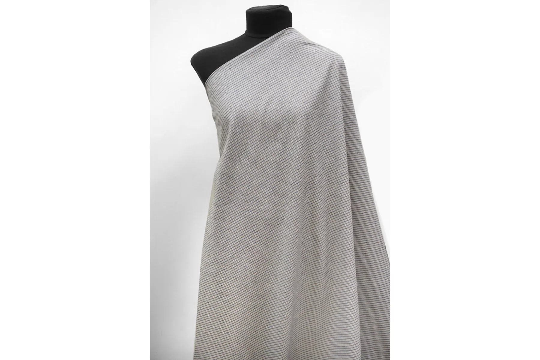 Костюмно-плательный хлопок со льном, с узором-полоской (вдоль кромки), нити белого, чёрного и бежево-коричневого цвета, плюс вкрапления сине-голубых и рыжевато-коричневых нитей. Визуально напоминает благодаря этим вкраплениям и утолщениям твид. Тактильно очень приятный, мягкий. Пластичный, но при этом формодержащий материал. Не тянется, не просвечивает. Мнется средне. Прекрасно подойдет на платья, свободные рубашки верхнего слоя, юбки, летние костюмы.