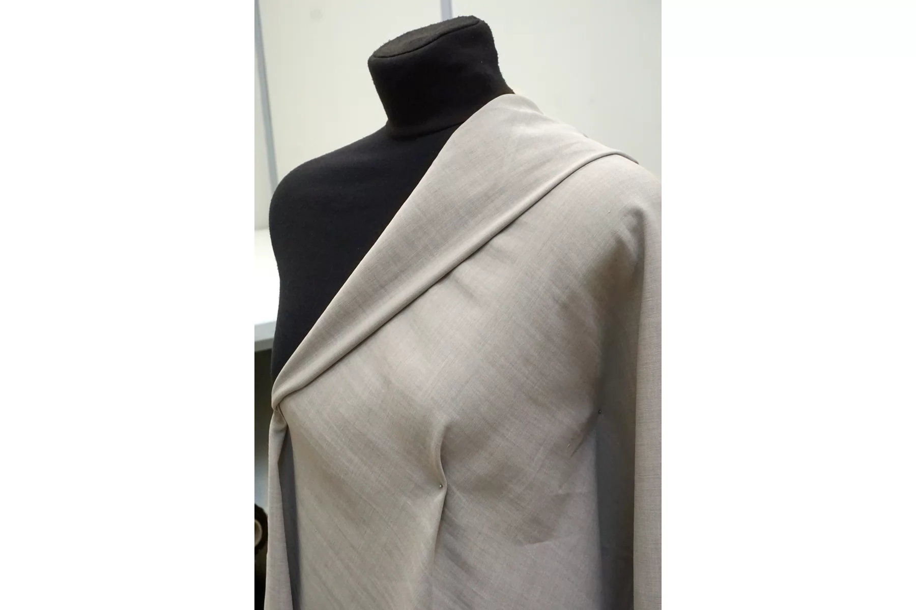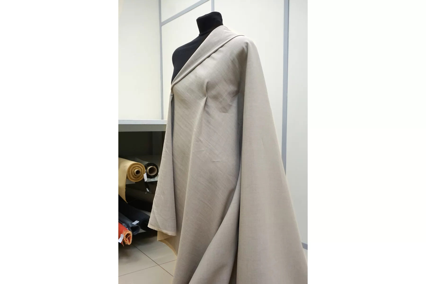 Хлопок со льном, костюмной плотности, одна сторона серо-бежевая, другая более светлая бледно-бежевая с желтинкой. Плотный, с упругой пластикой. Сухость льна ощущается. Формодержащий, образовывает округлые складки. Мнется. Не просвечивает силуэт. Подойдет для необычных жакетов, юбок, формодержащих платьев. Уход деликатный.
