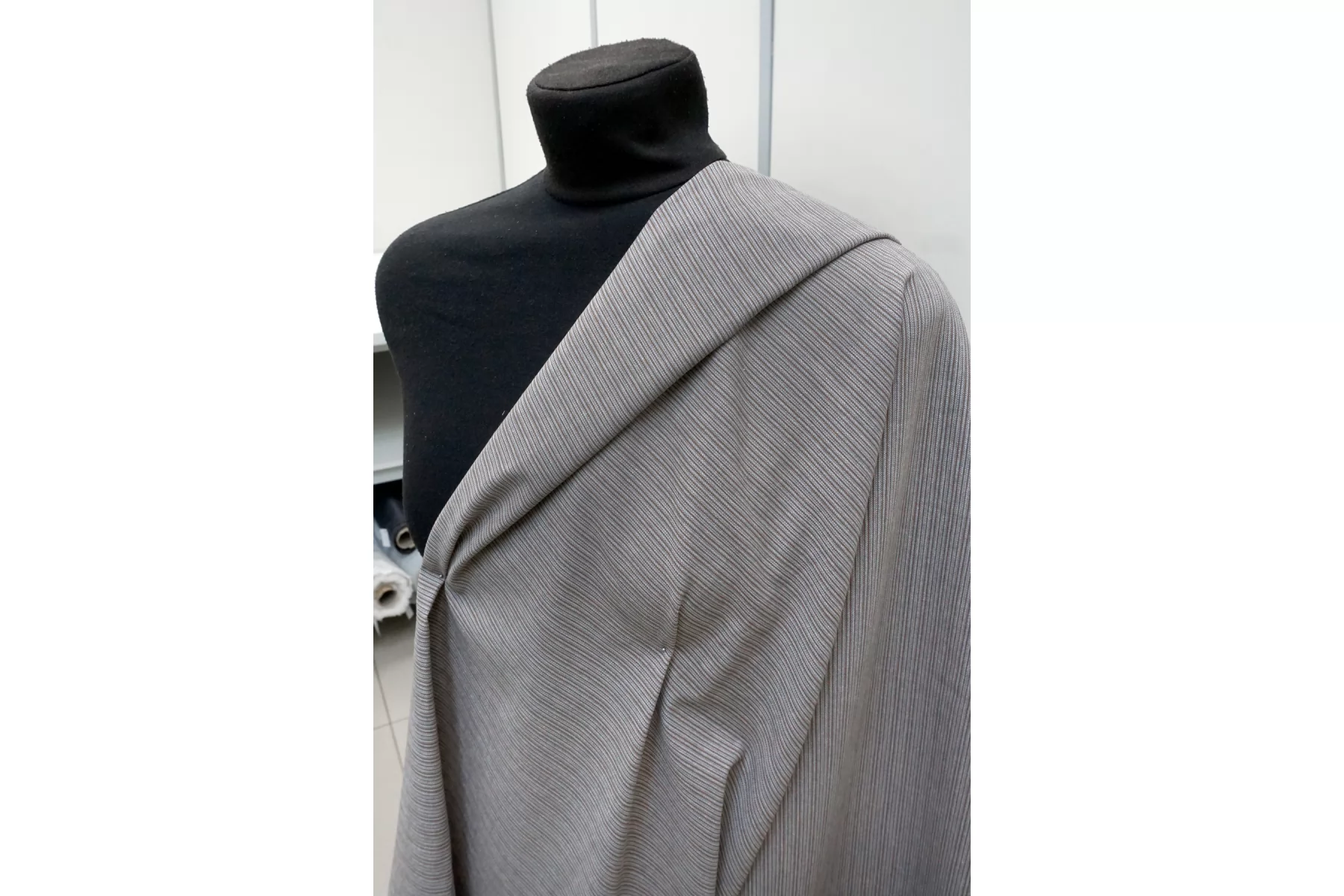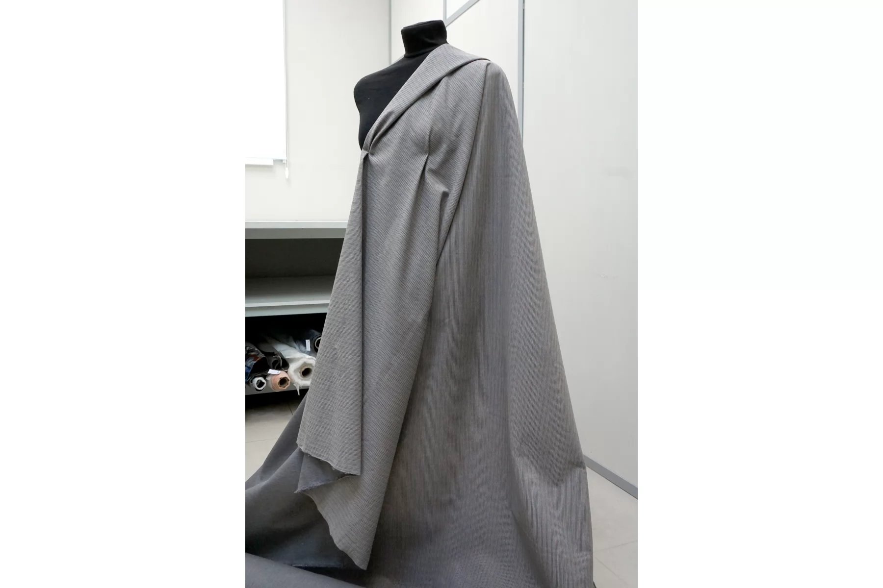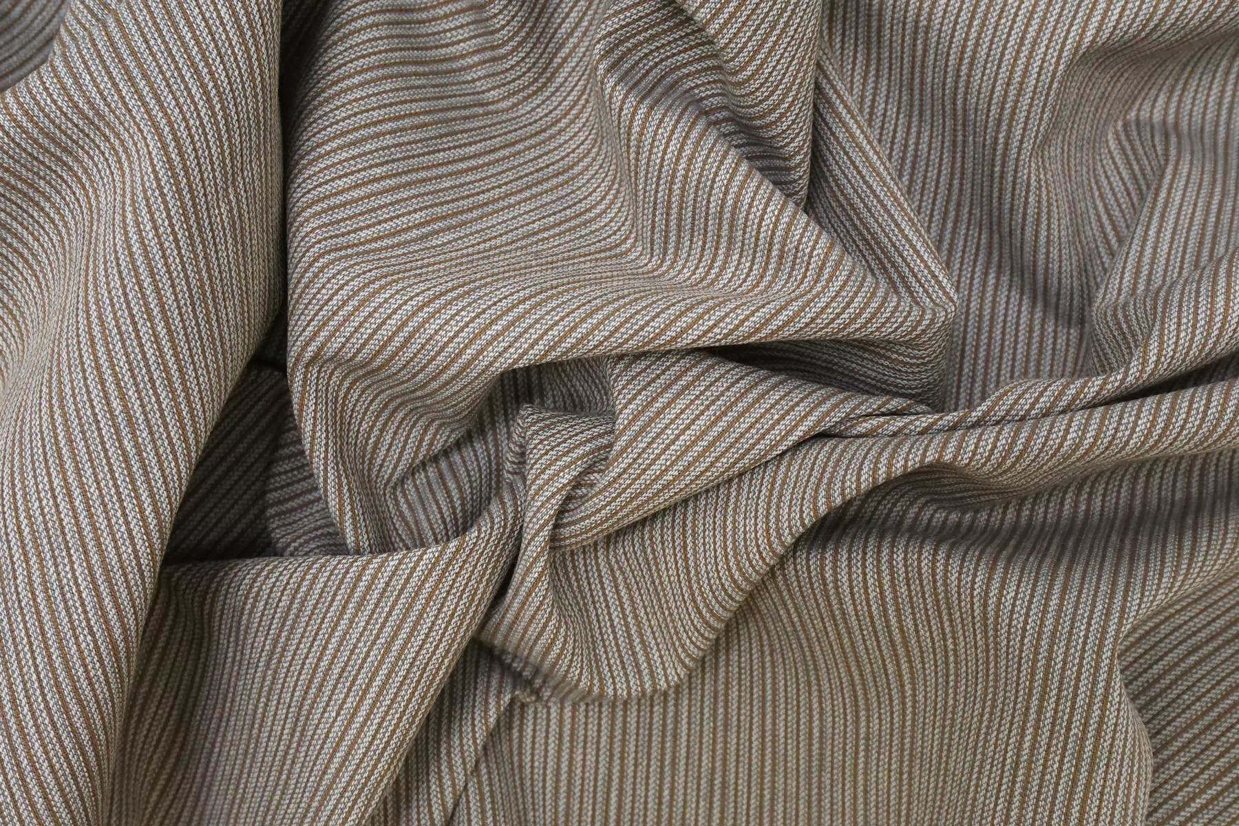 Костюмно-плательный хлопок со льном, в полоску, нити светло-серого, серого и коричневого цвета. Тактильно немного суховат. Пластичный, но при этом формодержащий материал. Не тянется, не просвечивает. Мнется средне. Прекрасно подойдет на отрезные платья, свободные рубашки верхнего слоя, юбки, летние костюмы.