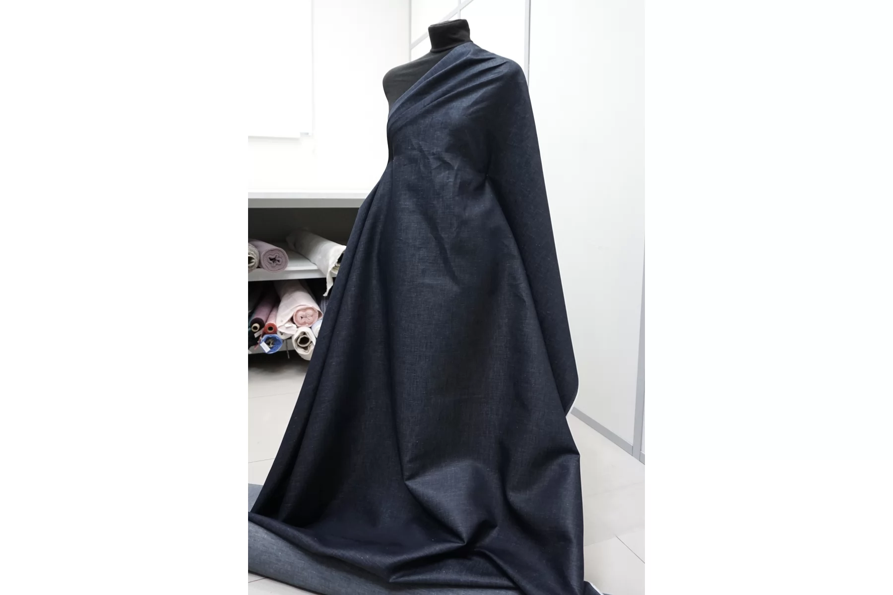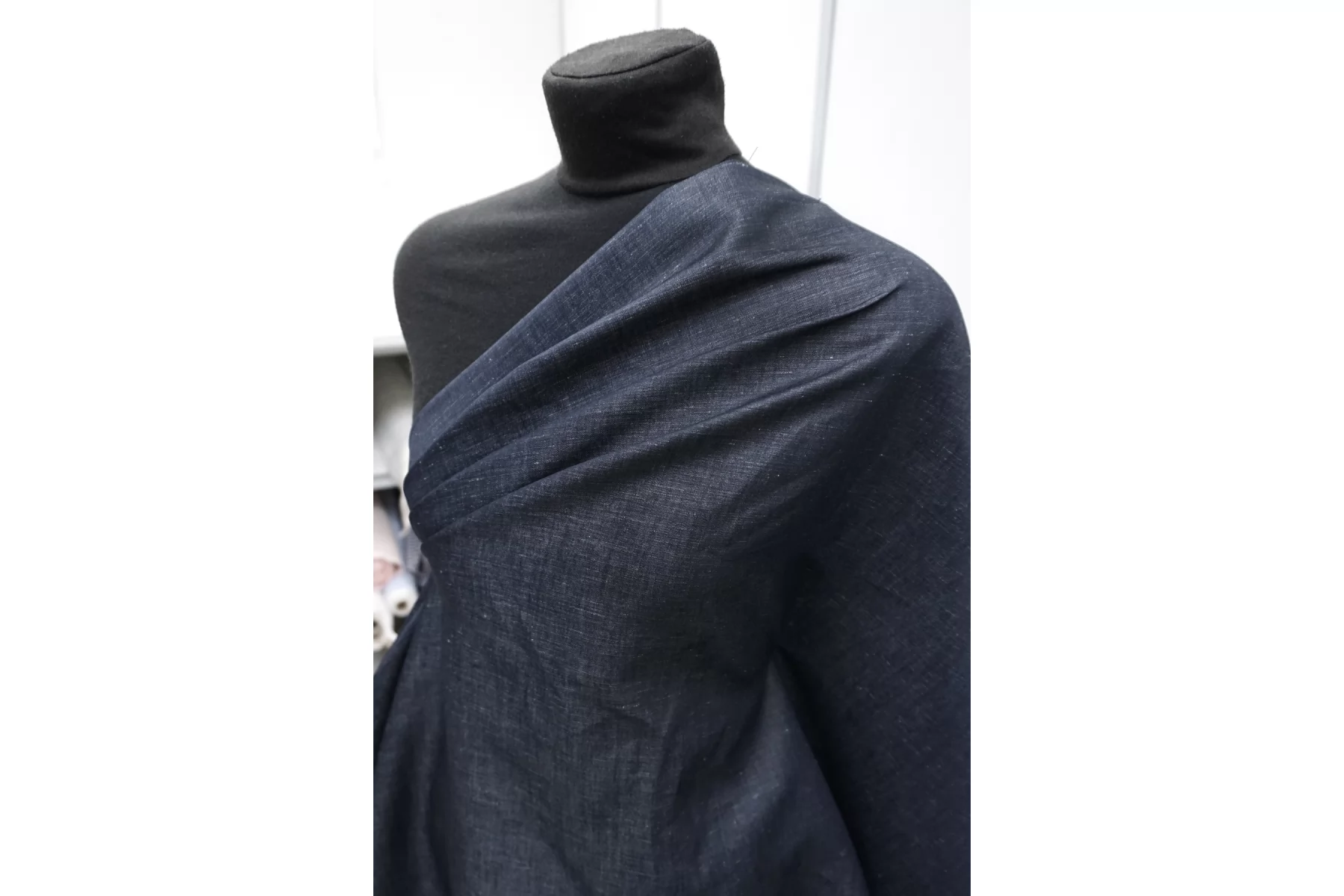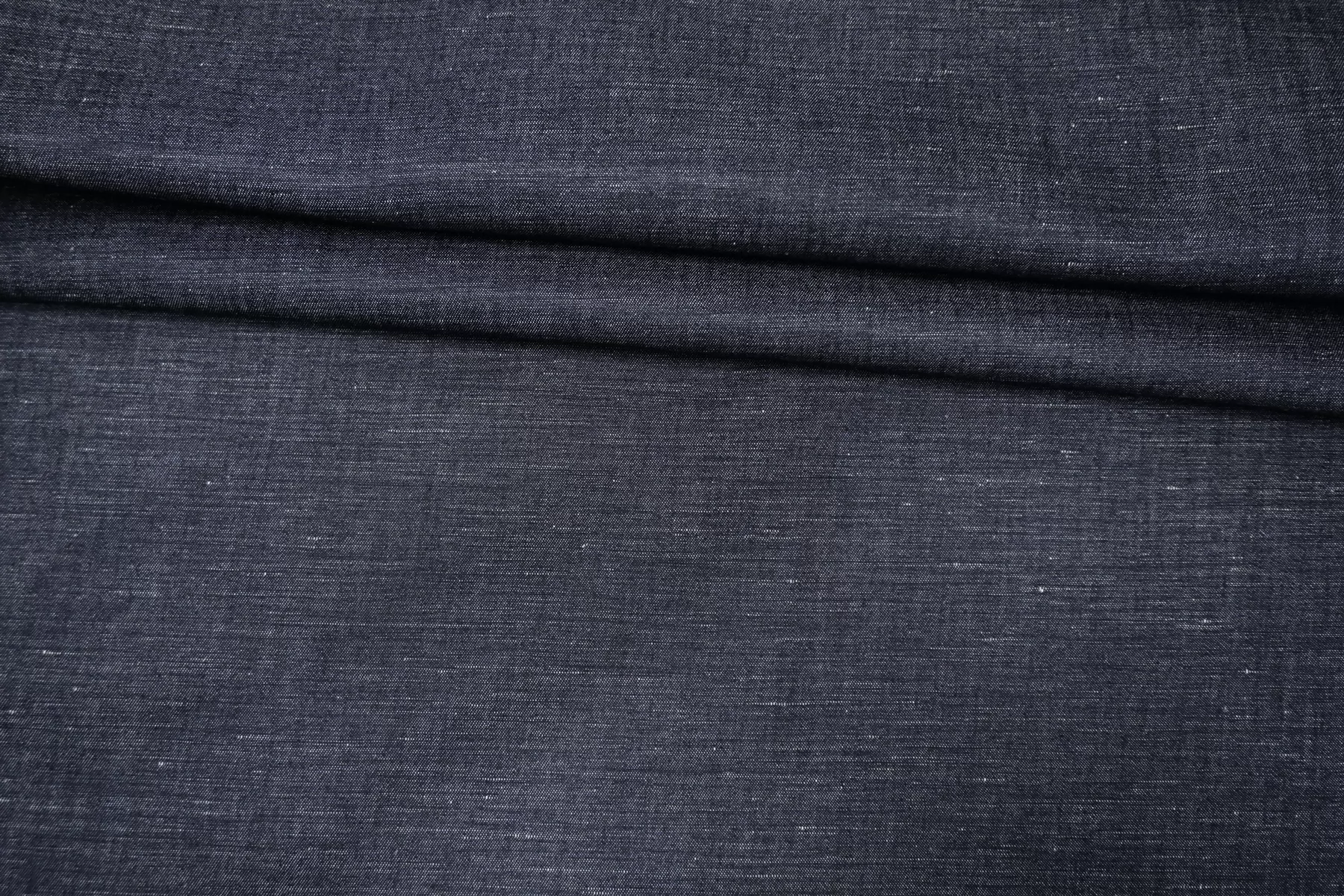 Прекрасный хлопок с добавлением льна рубашечно-плательной плотности, нити темно-синего и белого цвета. Материал гладкий, тонкий, чувствуется сухость льна. Мнется. Минимально просвечивает силуэт, не тянется. Пластичный, но при этом держит форму. Прекрасный вариант на рубашки, юбки, платья. Материал дает усадку.