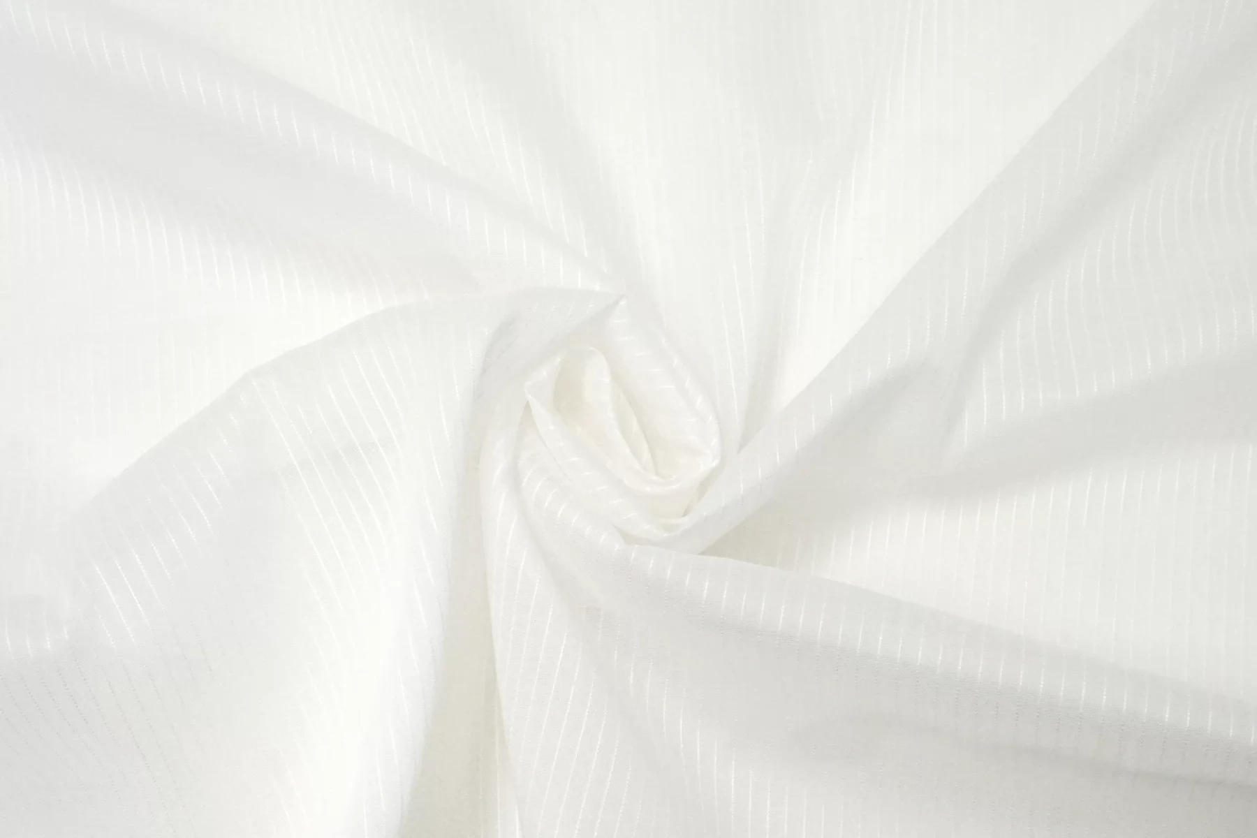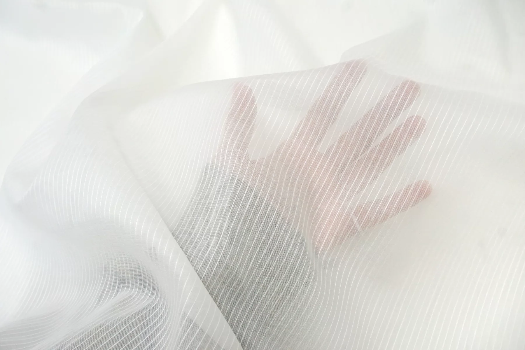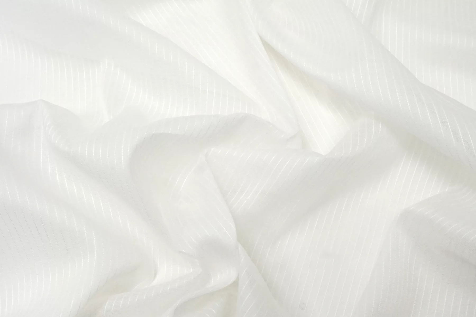Итальянский хлопок с добавкой льна, рубашечно-плательной плотности, с узором-полоской (вдоль кромки), белого цвета. Вуалевый. Присутствуют классические льняные утолщения нити. Ткань тонкая, тактильно суховатая, просвечивает, мнется. Плетение не плотное. Отличный вариант для летнего изделия - платья, юбки, сарафана, рубашки.