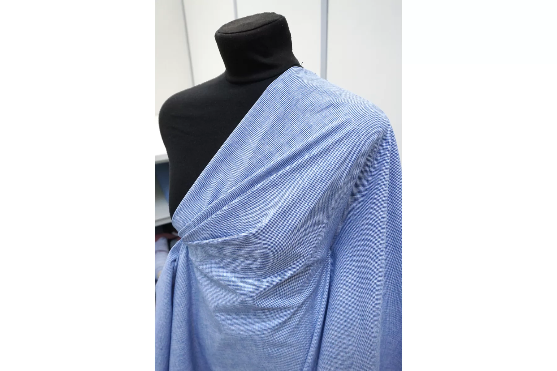 Прекрасный хлопок с добавлением льна, нити белого и синего цвета, узор - мелкая пепита. Материал гладкий, тонкий, чувствуется сухость льна. Мнется. Просвечивает силуэт в один слой, не тянется. Пластичный, но при этом держит форму. Прекрасный вариант на рубашки, юбки, платья. Материал дает усадку.