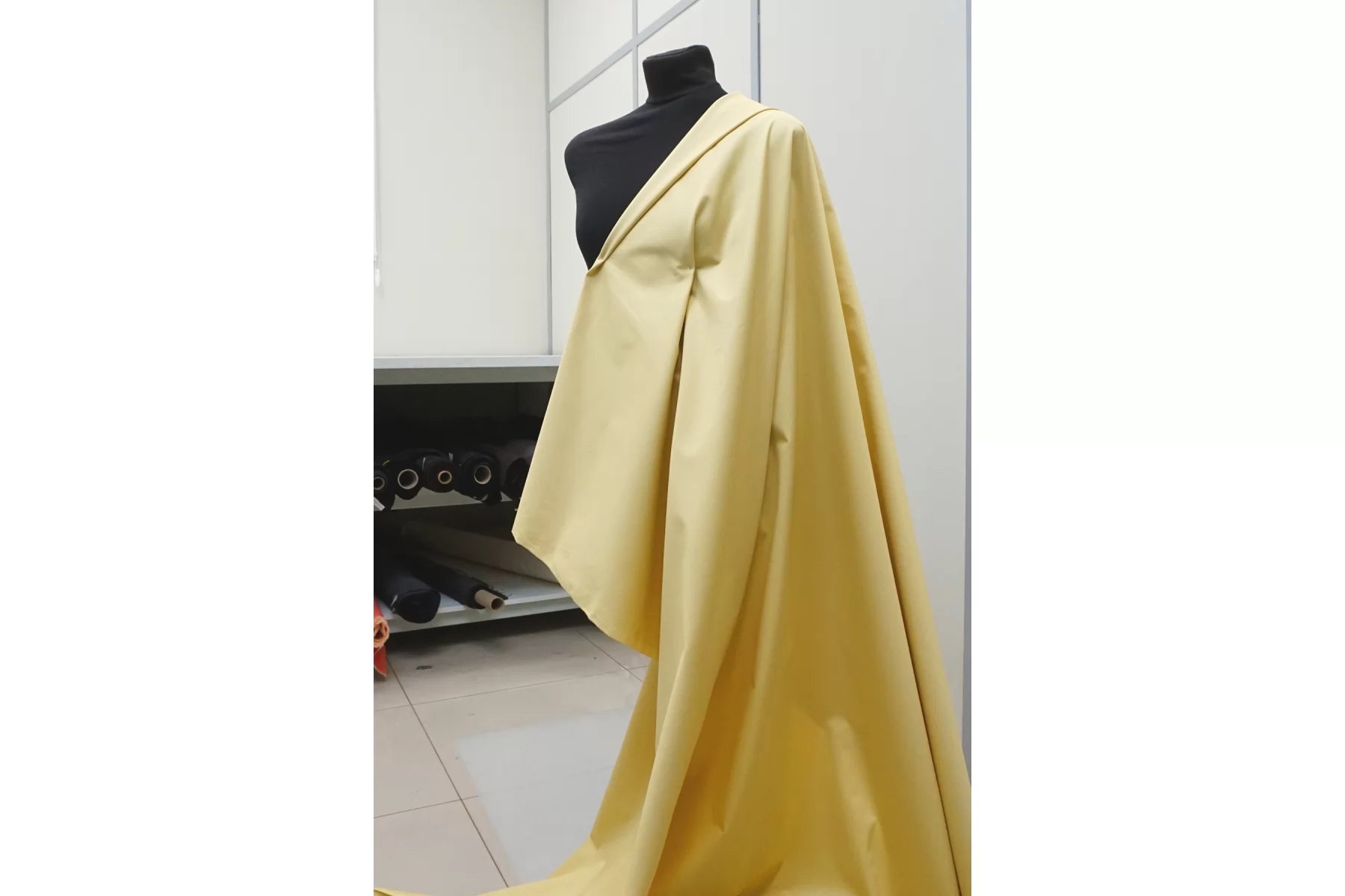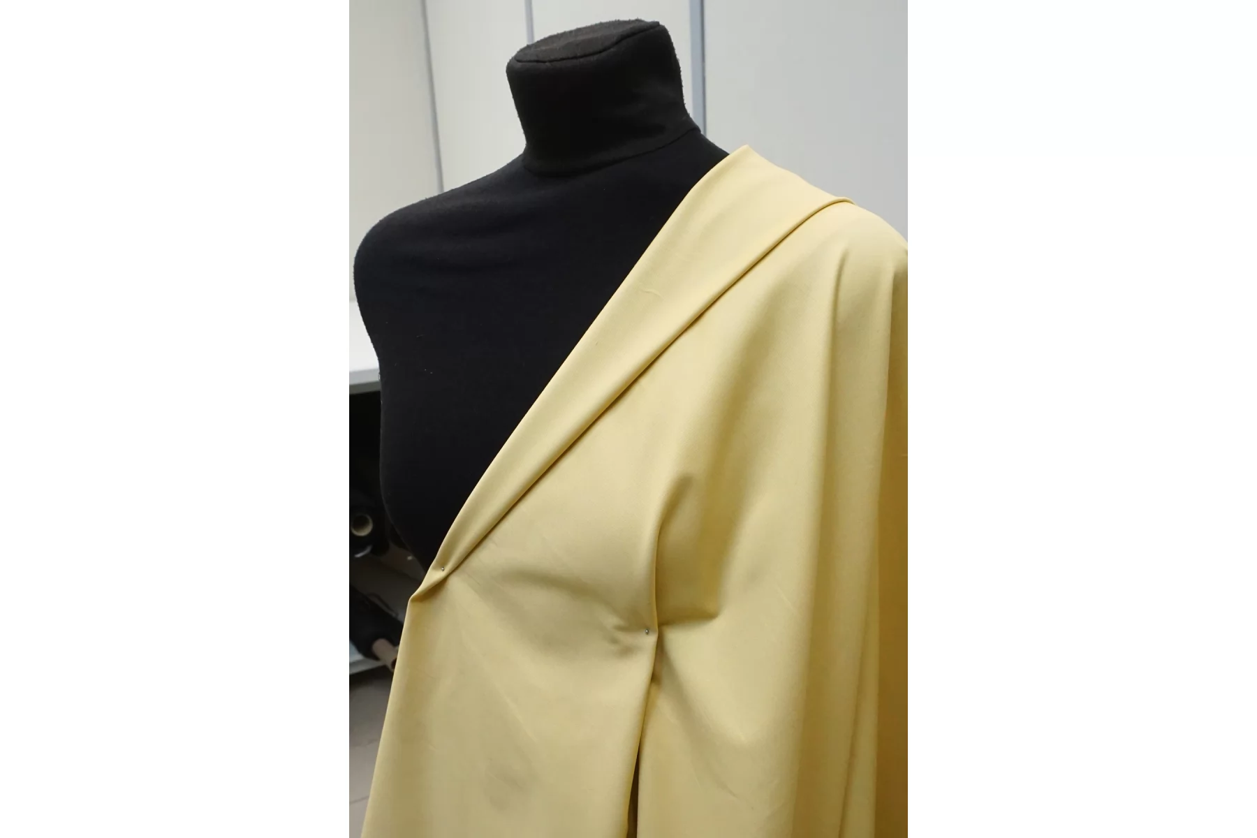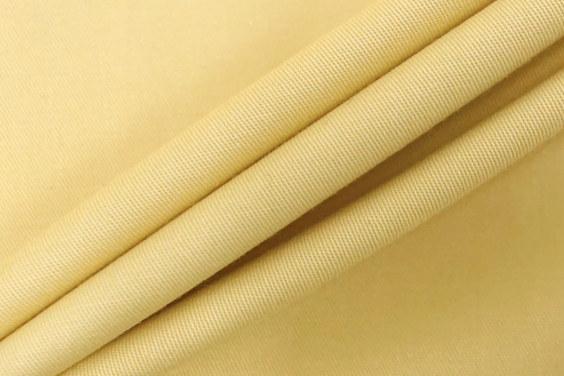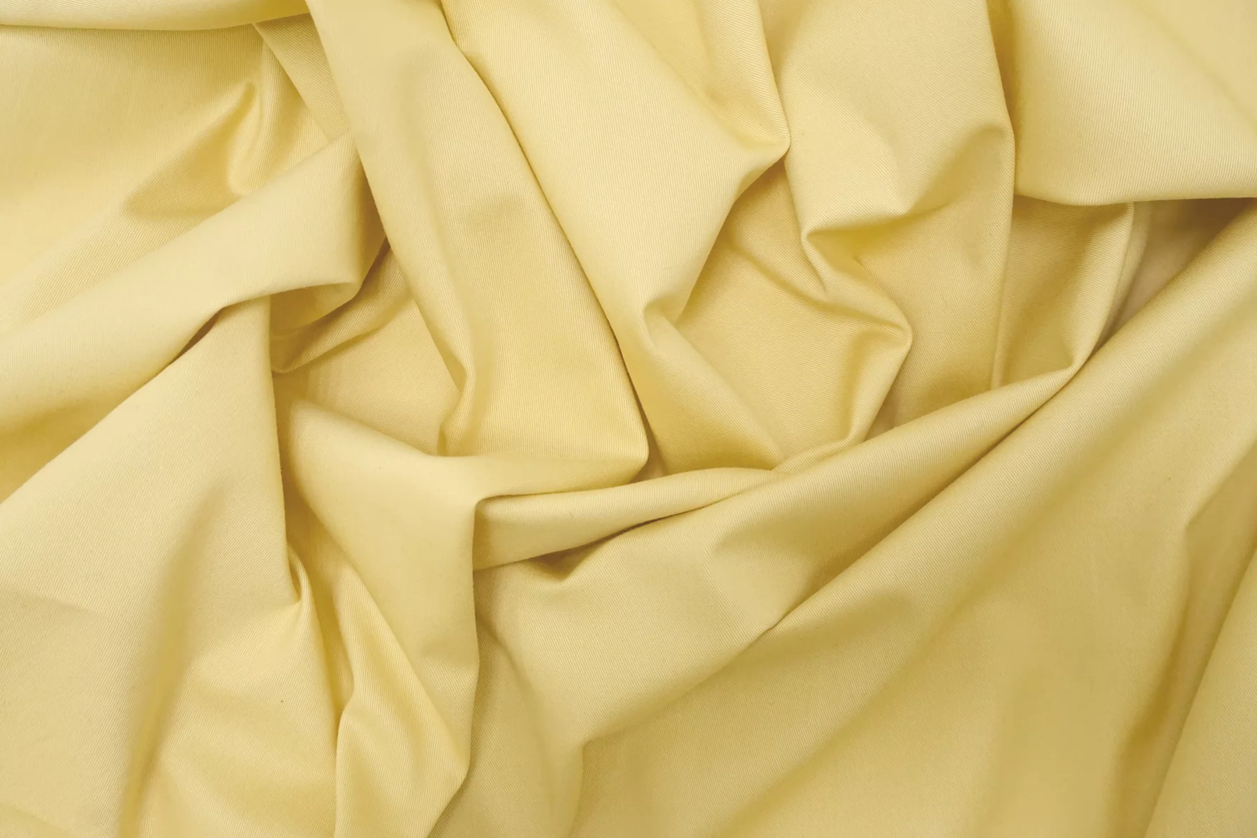 Прекрасный хлопок с добавкой вискозы костюмно-плательной плотности в чуть приглушённом, пастельно-жёлтом оттенке. Диагональное плетение. Тактильно гладкий, приятный. Неплохо тянется. Минимально просвечивает силуэт в один слой. Сминается. Форму держит но при этом пластичный. Шьем легкие костюмы, платья, юбки, а также шорты и брюки. Материал может давать усадку.